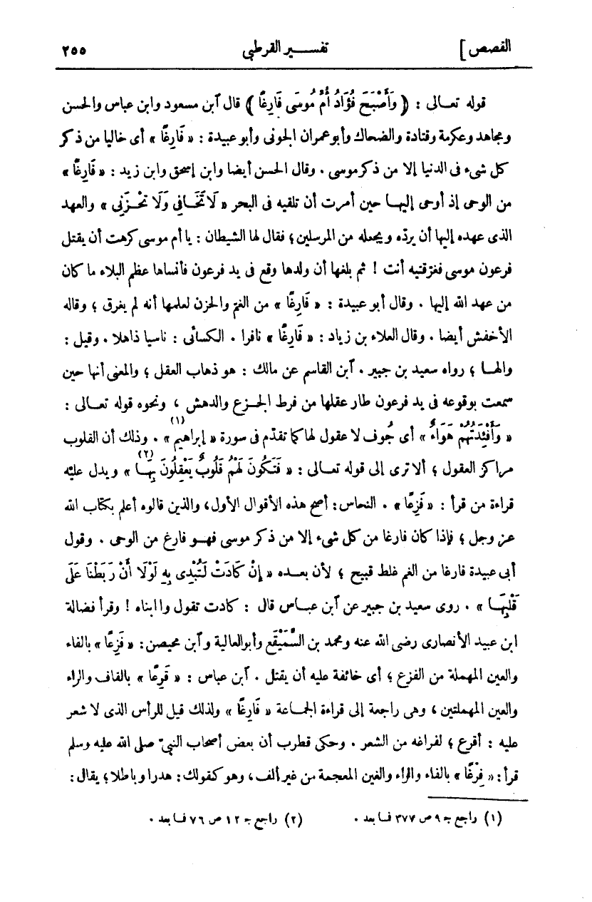 قَوْلُهُ تَعَالَى: (وَأَصْبَحَ فُؤادُ أُمِّ مُوسى فارِغاً) قَالَ ابْنُ مَسْعُودٍ وَابْنُ عَبَّاسٍ وَالْحَسَنُ وَمُجَاهِدٌ وَعِكْرِمَةٌ وَقَتَادَةُ وَالضَّحَّاكُ وَأَبُو عِمْرَانَ الْجَوْنِيُّ وَأَبُو عُبَيْدَةَ:" فارِغاً" أَيْ خَالِيًا مِنْ ذِكْرِ كُلِّ شي فِي الدُّنْيَا إِلَّا مِنْ ذِكْرِ مُوسَى وَقَالَ الْحَسَنُ أَيْضًا وَابْنُ إِسْحَاقَ وَابْنُ زَيْدٍ:" فارِغاً" مِنَ الْوَحْيِ إِذْ أَوْحَى إِلَيْهَا حِينَ أُمِرَتْ أن تلقيه في البحر" لا تَخافِي وَلا تَحْزَنِي" وَالْعَهْدُ الَّذِي عَهِدَهُ إِلَيْهَا أَنْ يَرُدَّهُ وَيَجْعَلَهُ مِنَ الْمُرْسَلِينَ، فَقَالَ لَهَا الشَّيْطَانُ: يَا أُمَّ مُوسَى كَرِهْتِ أَنْ يَقْتُلَ فِرْعَوْنُ مُوسَى فَغَرَّقْتِيهِ أَنْتِ! ثُمَّ بَلَّغَهَا أَنَّ وَلَدَهَا وَقَعَ فِي يَدِ فِرْعَوْنَ فَأَنْسَاهَا عِظَمُ الْبَلَاءِ مَا كَانَ مِنْ عَهْدِ اللَّهِ إِلَيْهَا وَقَالَ أَبُو عُبَيْدَةَ:" فارِغاً" مِنَ الْغَمِّ وَالْحُزْنِ لِعِلْمِهَا أَنَّهُ لَمْ يَغْرَقْ، وَقَالَهُ الْأَخْفَشُ أَيْضًا وَقَالَ الْعَلَاءُ بْنُ زِيَادٍ:" فارِغاً" نَافِرًا الْكِسَائِيُّ: نَاسِيًا ذَاهِلًا وَقِيلَ: وَالِهًا، رَوَاهُ سَعِيدُ بْنُ جُبَيْرٍ ابْنُ الْقَاسِمِ عَنْ مَالِكٍ: هُوَ ذَهَابُ الْعَقْلِ، وَالْمَعْنَى أَنَّهَا حِينَ سَمِعَتْ بِوُقُوعِهِ فِي يَدِ فِرْعَوْنَ طَارَ عَقْلُهَا مِنْ فَرْطِ الْجَزَعِ وَالدَّهَشِ، وَنَحْوَهُ قَوْلُهُ تَعَالَى:" وَأَفْئِدَتُهُمْ هَواءٌ" أَيْ جَوْفٌ لَا عُقُولَ لَهَا كَمَا تَقَدَّمَ فِي سُورَةِ" إِبْرَاهِيمَ" «١». وَذَلِكَ أَنَّ الْقُلُوبَ مَرَاكِزُ الْعُقُولِ، أَلَا تَرَى إِلَى قَوْلِهِ تَعَالَى:" فَتَكُونَ لَهُمْ قُلُوبٌ يَعْقِلُونَ بِها" وَيَدُلُّ عَلَيْهِ قِرَاءَةُ مَنْ قَرَأَ:" فَزِعًا". النَّحَّاسُ: أَصَحُّ هَذِهِ الْأَقْوَالِ الْأَوَّلُ، وَالَّذِينَ قَالُوهُ أَعْلَمُ بِكِتَابِ اللَّهِ عَزَّ وَجَلَّ، فإذا كان فارغا من كل شي إِلَّا مِنْ ذِكْرِ مُوسَى فَهُوَ فَارِغٌ مِنَ الْوَحْيِ. وَقَوْلُ أَبِي عُبَيْدَةَ فَارِغًا مِنَ الْغَمِّ غَلَطٌ قَبِيحٌ، لِأَنَّ بَعْدَهُ" إِنْ كادَتْ لَتُبْدِي بِهِ لَوْلا أَنْ رَبَطْنا عَلى قَلْبِها". رَوَى سَعِيدُ بْنُ جُبَيْرٍ عَنِ ابْنِ عَبَّاسٍ قَالَ: كادت تقول وا ابناه! وقرا فضالة ابن عُبَيْدٍ الْأَنْصَارِيُّ رَضِيَ اللَّهُ عَنْهُ وَمُحَمَّدُ بْنُ السَّمَيْقَعِ وَأَبُو الْعَالِيَةِ وَابْنُ مُحَيْصِنٍ" فَزِعًا" بِالْفَاءِ وَالْعَيْنِ الْمُهْمَلَةِ مِنَ الْفَزَعِ، أَيْ خَائِفَةٌ عَلَيْهِ أَنْ يُقْتَلَ ابْنُ عَبَّاسٍ:" قَرِعًا" بِالْقَافِ وَالرَّاءِ وَالْعَيْنِ الْمُهْمَلَتَيْنِ، وَهِيَ رَاجِعَةٌ إِلَى قِرَاءَةِ الْجَمَاعَةِ" فارِغاً" وَلِذَلِكَ قِيلَ لِلرَّأْسِ الَّذِي لَا شَعْرَ عَلَيْهِ: أَقْرَعُ، لِفَرَاغِهِ مِنَ الشَّعْرِ وَحَكَى قُطْرُبٌ أَنَّ بَعْضُ أَصْحَابِ النَّبِيِّ صَلَّى اللَّهُ عَلَيْهِ وَسَلَّمَ قَرَأَ:" فِرْغًا" بِالْفَاءِ وَالرَّاءِ وَالْغَيْنِ الْمُعْجَمَةِ مِنْ غَيْرِ أَلِفٍ، وَهُوَ كَقَوْلِكَ: هَدَرًا وَبَاطِلًا، يقال: