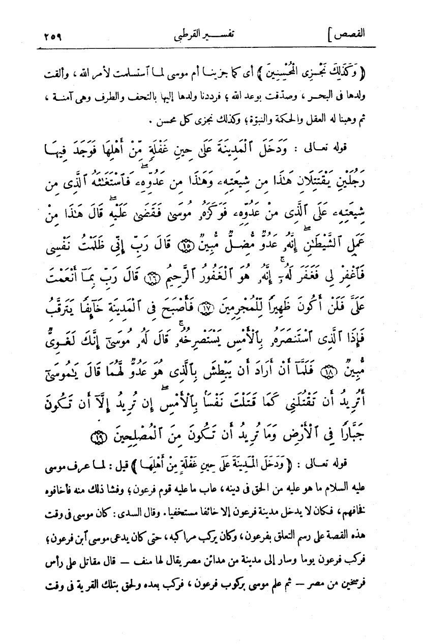 وَدَخَلَ الْمَدِينَةَ عَلى حِينِ غَفْلَةٍ مِنْ أَهْلِها فَوَجَدَ فِيها رَجُلَيْنِ يَقْتَتِلانِ هَذَا مِنْ شِيعَتِهِ وَهذا مِنْ عَدُوِّهِ فَاسْتَغاثَهُ الَّذِي مِنْ شِيعَتِهِ عَلَى الَّذِي مِنْ عَدُوِّهِ فَوَكَزَهُ مُوسى فَقَضى عَلَيْهِ قالَ هَذَا مِنْ عَمَلِ الشَّيْطانِ إِنَّهُ عَدُوٌّ مُضِلٌّ مُبِينٌ (١٥) قالَ رَبِّ إِنِّي ظَلَمْتُ نَفْسِي فَاغْفِرْ لِي فَغَفَرَ لَهُ إِنَّهُ هُوَ الْغَفُورُ الرَّحِيمُ (١٦) قالَ رَبِّ بِما أَنْعَمْتَ عَلَيَّ فَلَنْ أَكُونَ ظَهِيراً لِلْمُجْرِمِينَ (١٧) فَأَصْبَحَ فِي الْمَدِينَةِ خائِفاً يَتَرَقَّبُ فَإِذَا الَّذِي اسْتَنْصَرَهُ بِالْأَمْسِ يَسْتَصْرِخُهُ قالَ لَهُ مُوسى إِنَّكَ لَغَوِيٌّ مُبِينٌ (١٨) فَلَمَّا أَنْ أَرادَ أَنْ يَبْطِشَ بِالَّذِي هُوَ عَدُوٌّ لَهُما قالَ يَا مُوسى أَتُرِيدُ أَنْ تَقْتُلَنِي كَما قَتَلْتَ نَفْساً بِالْأَمْسِ إِنْ تُرِيدُ إِلاَّ أَنْ تَكُونَ جَبَّاراً فِي الْأَرْضِ وَما تُرِيدُ أَنْ تَكُونَ مِنَ الْمُصْلِحِينَ (١٩)