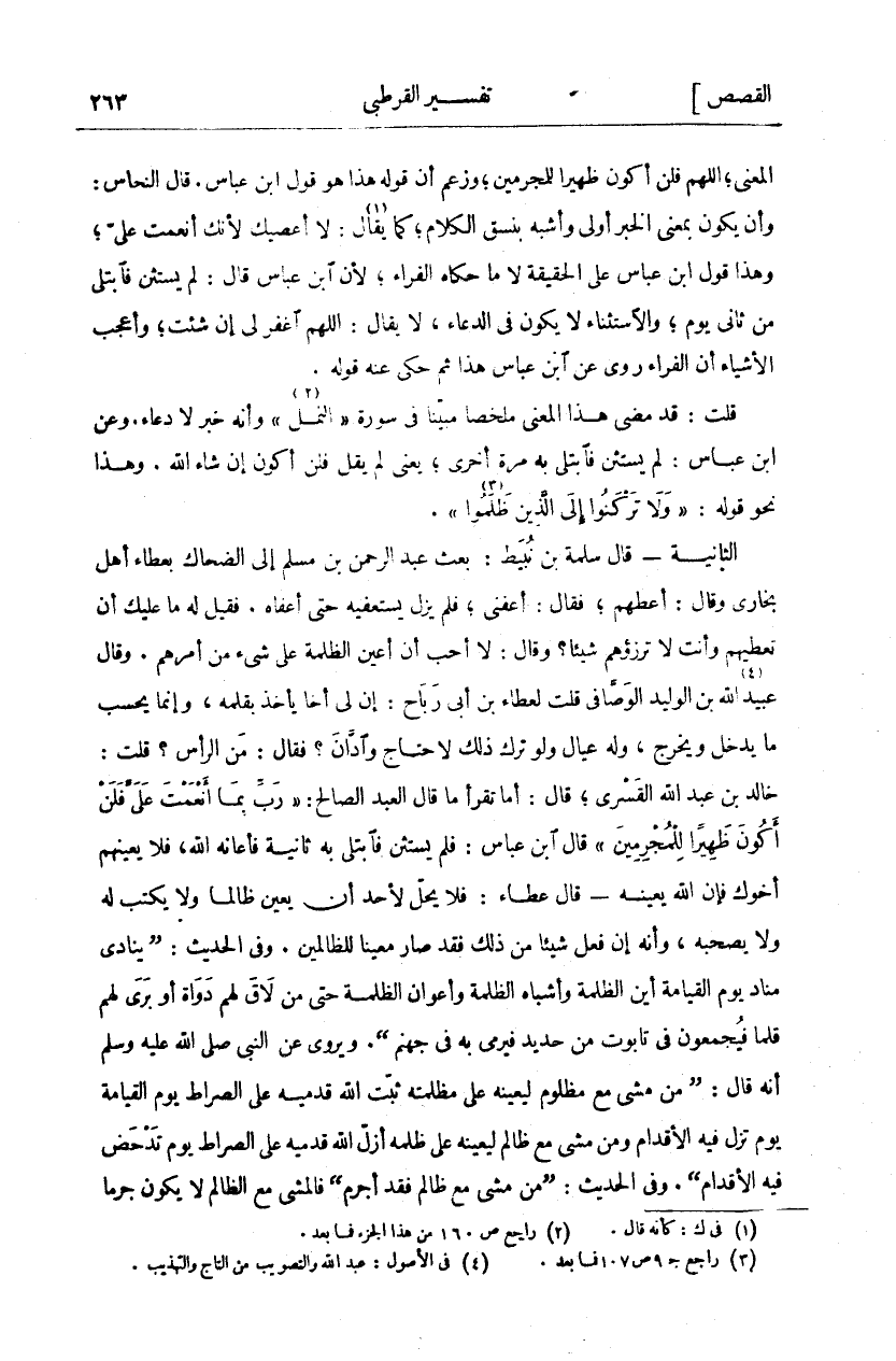 الْمَعْنَى، اللَّهُمَّ فَلَنْ أَكُونَ بَعْدُ ظَهِيرًا لِلْمُجْرِمِينَ، وَزَعَمَ أَنَّ قَوْلَهُ هَذَا هُوَ قَوْلُ ابْنِ عباس قال النحاس: وأن يكون بمعنى الْخَبَرِ أَوْلَى وَأَشْبَهُ بِنَسَقِ الْكَلَامِ، كَمَا يُقَالُ: لَا أَعْصِيكَ لِأَنَّكَ أَنْعَمْتَ عَلَيَّ، وَهَذَا قَوْلُ ابْنِ عَبَّاسٍ عَلَى الْحَقِيقَةِ لَا مَا حَكَاهُ الْفَرَّاءُ، لِأَنَّ ابْنَ عَبَّاسٍ قَالَ: لَمْ يَسْتَثْنِ فَابْتُلِيَ مِنْ ثَانِي يَوْمٍ، وَالِاسْتِثْنَاءُ لَا يَكُونُ فِي الدُّعَاءِ، لَا يُقَالُ: اللَّهُمَّ اغْفِرْ لِي إِنْ شِئْتَ، وَأَعْجَبُ الْأَشْيَاءِ أَنَّ الْفَرَّاءَ رَوَى عَنِ ابْنِ عَبَّاسٍ هَذَا ثُمَّ حَكَى عَنْهُ قَوْلَهُ. قُلْتُ: قَدْ مَضَى هَذَا الْمَعْنَى مُلَخَّصًا مُبَيَّنًا فِي سُورَةِ" النَّمْلِ" وَأَنَّهُ خَبَرٌ لَا دُعَاءٌ وَعَنِ ابْنِ عَبَّاسٍ: لَمْ يَسْتَثْنِ فَابْتُلِيَ بِهِ مَرَّةً أُخْرَى، يَعْنِي لَمْ يَقُلْ فَلَنْ أَكُونَ إِنْ شَاءَ اللَّهُ وَهَذَا نَحْوَ قَوْلِهِ:" وَلا تَرْكَنُوا إِلَى الَّذِينَ ظَلَمُوا" الثَّانِيَةُ- قَالَ سَلَمَةُ بْنُ نُبَيْطٍ: بَعَثَ عَبْدُ الرَّحْمَنِ بْنُ مُسْلِمٍ إِلَى الضَّحَّاكِ بِعَطَاءِ أَهْلِ بُخَارَى وَقَالَ: أَعْطِهِمْ، فَقَالَ: اعْفِنِي، فَلَمْ يَزَلْ يَسْتَعْفِيهِ حَتَّى أَعْفَاهُ. فَقِيلَ لَهُ مَا عَلَيْكَ أَنْ تُعْطِيَهُمْ وأنت لا ترزؤهم شيئا؟ وقال: لا أحب أن أعين الظلمة على شي مِنْ أَمْرِهِمْ. وَقَالَ عُبَيْدُ اللَّهِ بْنُ الْوَلِيدِ الْوَصَّافِيُّ قُلْتُ لِعَطَاءِ بْنِ أَبِي رَبَاحٍ: إِنَّ لِي أَخًا يَأْخُذُ بِقَلَمِهِ، وَإِنَّمَا يَحْسِبُ مَا يَدْخُلُ وَيَخْرُجُ، وَلَهُ عِيَالٌ وَلَوْ تَرَكَ ذَلِكَ لَاحْتَاجَ وَادَّانَ؟ فَقَالَ: مَنِ الرَّأْسُ؟ قُلْتُ: خَالِدُ بْنُ عَبْدِ اللَّهِ الْقَسْرِيُّ، قَالَ: أَمَا تَقْرَأُ مَا قَالَ الْعَبْدُ الصَّالِحُ" رَبِّ بِمَا أَنْعَمْتَ علي فلن أكون ظهير لِلْمُجْرِمِينَ" قَالَ ابْنُ عَبَّاسٍ: فَلَمْ يَسْتَثْنِ فَابْتُلِيَ بِهِ ثَانِيَةً فَأَعَانَهُ اللَّهُ، فَلَا يُعِينُهُمْ أَخُوكَ فَإِنَّ اللَّهَ يُعِينُهُ- قَالَ عَطَاءٌ: فَلَا يَحِلُّ لِأَحَدٍ أَنْ يُعِينَ ظَالِمًا وَلَا يَكْتُبَ لَهُ وَلَا يَصْحَبَهُ، وَأَنَّهُ إِنْ فَعَلَ شَيْئًا مِنْ ذَلِكَ فَقَدْ صَارَ مُعِينًا لِلظَّالِمِينَ. وَفِي الْحَدِيثِ:" يُنَادِي مُنَادٍ يَوْمَ الْقِيَامَةِ أَيْنَ الظَّلَمَةُ وَأَشْبَاهُ الظَّلَمَةِ وَأَعْوَانُ الظَّلَمَةِ حَتَّى مَنْ لَاقَ لَهُمْ دَوَاةً أَوْ بَرَى لَهُمْ قَلَمًا فَيُجْمَعُونَ فِي تَابُوتٍ مِنْ حَدِيدٍ فَيُرْمَى بِهِ فِي جَهَنَّمَ". وَيُرْوَى عَنِ النَّبِيِّ صَلَّى اللَّهُ عَلَيْهِ وَسَلَّمَ أَنَّهُ قَالَ:" مَنْ مَشَى مَعَ مَظْلُومٍ لِيُعِينَهُ عَلَى مَظْلِمَتِهِ ثَبَّتَ اللَّهُ قَدَمَيْهِ عَلَى الصِّرَاطِ يَوْمَ الْقِيَامَةِ يَوْمَ تَزِلُّ فِيهِ الْأَقْدَامُ وَمَنْ مَشَى مَعَ ظَالِمٍ لِيُعِينَهُ عَلَى ظُلْمِهِ أَزَلَّ اللَّهُ قَدَمَيْهِ عَلَى الصِّرَاطِ يَوْمَ تُدْحَضُ فِيهِ الْأَقْدَامُ". وَفِي الْحَدِيثِ:" مَنْ مَشَى مَعَ ظَالِمٍ فَقَدْ أَجْرَمَ" فَالْمَشْيُ مَعَ الظَّالِمِ لَا يَكُونُ