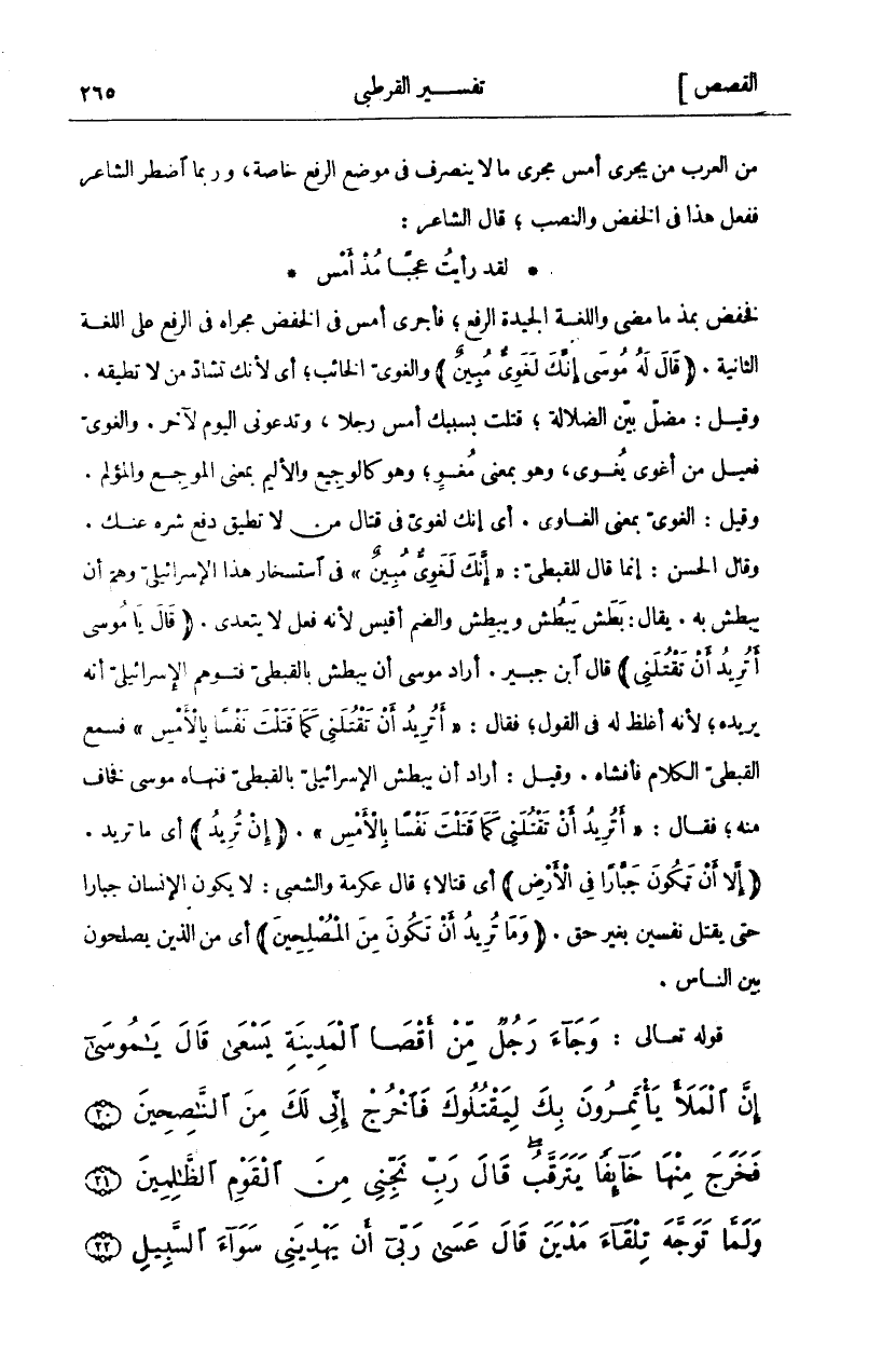 فخفض بمذ مَا مَضَى وَاللُّغَةُ الْجَيِّدَةُ الرَّفْعُ، فَأُجْرِيَ أَمْسُ فِي الْخَفْضِ مَجْرَاهُ فِي الرَّفْعِ عَلَى اللُّغَةِ الثَّانِيَةِ. (قالَ لَهُ مُوسى إِنَّكَ لَغَوِيٌّ مُبِينٌ) وَالْغَوِيُّ الْخَائِبُ، أَيْ لِأَنَّكَ تُشَادُّ مَنْ لَا تُطِيقُهُ. وَقِيلَ: مُضِلٌّ بَيِّنُ الضَّلَالَةِ، قَتَلْتُ بِسَبَبِكِ أَمْسِ رَجُلًا، وَتَدْعُونِي الْيَوْمَ لِآخَرَ. وَالْغَوِيُّ فَعِيلٌ مِنْ أَغْوَى يُغْوِي، وَهُوَ بِمَعْنَى مُغْوٍ، وَهُوَ كَالْوَجِيعِ وَالْأَلِيمِ بِمَعْنَى الْمُوجِعِ وَالْمُؤْلِمِ وَقِيلَ: الْغَوِيُّ بِمَعْنَى الْغَاوِي. أَيْ إِنَّكَ لَغَوِيٌّ فِي قِتَالِ مَنْ لَا تُطِيقُ دَفْعَ شَرِّهِ عَنْكَ. وَقَالَ الْحَسَنُ: إِنَّمَا قَالَ لِلْقِبْطِيِّ" إِنَّكَ لَغَوِيٌّ مُبِينٌ" فِي اسْتِسْخَارِ هَذَا الْإِسْرَائِيلِيِّ وَهَمَّ أَنْ يَبْطِشَ به. يقال: بَطَشَ يَبْطِشُ وَيَبْطُشُ وَالضَّمُّ أَقْيَسُ لِأَنَّهُ فِعْلٌ لَا يَتَعَدَّى. (قالَ يَا مُوسى أَتُرِيدُ أَنْ تَقْتُلَنِي) قَالَ ابْنُ جُبَيْرٍ. أَرَادَ مُوسَى أَنْ يَبْطِشَ بِالْقِبْطِيِّ فَتَوَهَّمَ الْإِسْرَائِيلِيُّ أَنَّهُ يُرِيدُهُ، لِأَنَّهُ أَغْلَظَ لَهُ فِي الْقَوْلِ، فَقَالَ:" أَتُرِيدُ أَنْ تَقْتُلَنِي كَما قَتَلْتَ نَفْساً بِالْأَمْسِ" فَسَمِعَ الْقِبْطِيُّ الْكَلَامَ فَأَفْشَاهُ. وَقِيلَ: أَرَادَ أَنْ يَبْطِشَ الْإِسْرَائِيلِيُّ بِالْقِبْطِيِّ فَنَهَاهُ مُوسَى فَخَافَ مِنْهُ، فَقَالَ:" أَتُرِيدُ أَنْ تَقْتُلَنِي كَما قَتَلْتَ نَفْساً بِالْأَمْسِ". (إِنْ تُرِيدُ) أَيْ مَا تُرِيدُ. (إِلَّا أَنْ تَكُونَ جَبَّاراً فِي الْأَرْضِ) أي قتالا، قال عِكْرِمَةُ وَالشَّعْبِيُّ: لَا يَكُونُ الْإِنْسَانُ جَبَّارًا حَتَّى يَقْتُلَ نَفْسَيْنِ بِغَيْرِ حَقٍّ. (وَما تُرِيدُ أَنْ تَكُونَ مِنَ الْمُصْلِحِينَ) أَيْ مِنَ الَّذِينَ يُصْلِحُونَ بين الناس.