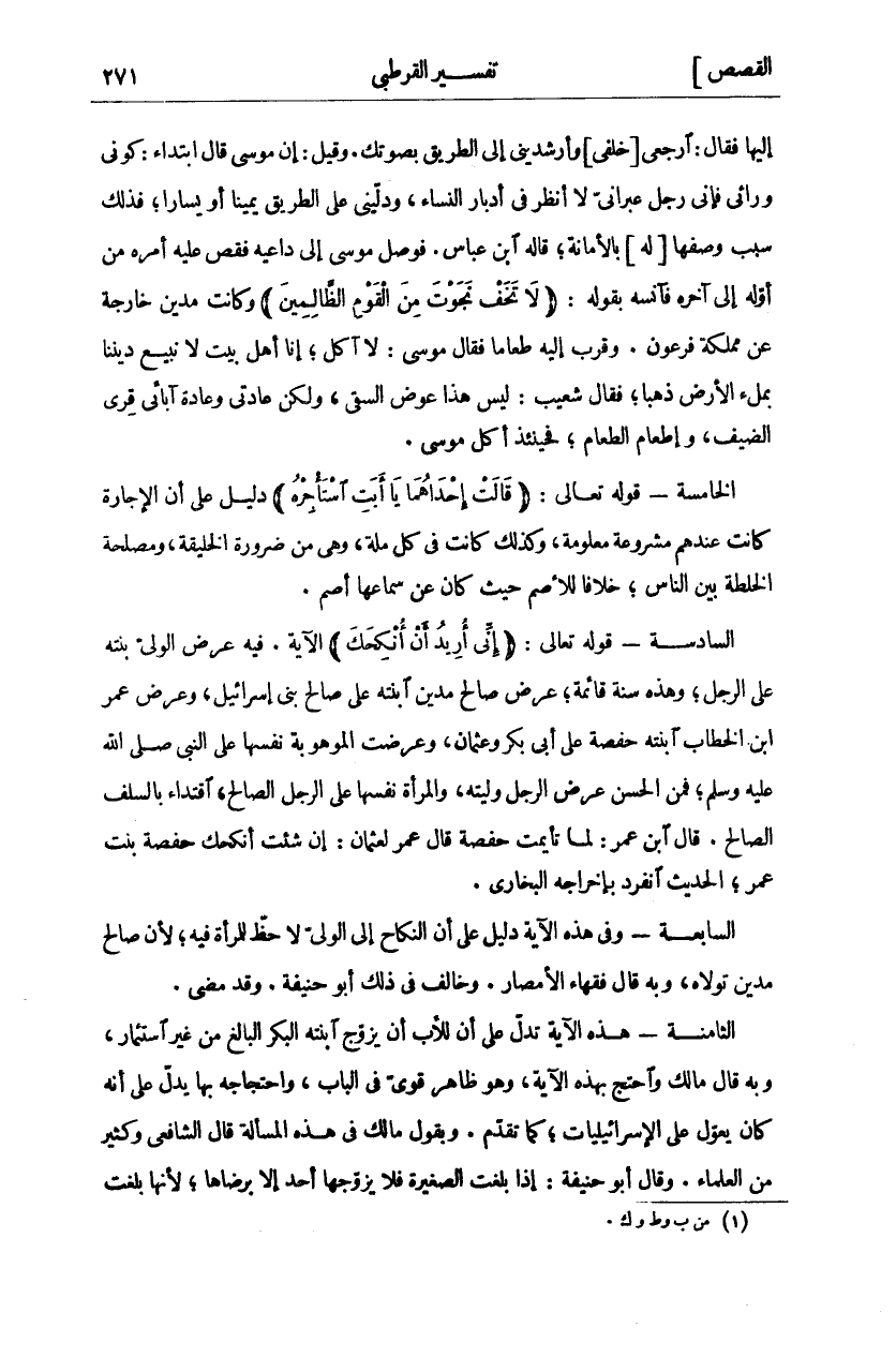 إِلَيْهَا فَقَالَ: ارْجِعِي خَلْفِي وَأَرْشِدِينِي إِلَى الطَّرِيقِ بِصَوْتِكِ وَقِيلَ: إِنَّ مُوسَى قَالَ ابْتِدَاءً: كُونِي وَرَائِي فَإِنِّي رَجُلٌ عِبْرَانِيٌّ لَا أَنْظُرُ فِي أَدْبَارِ النِّسَاءِ، وَدُلِّينِي عَلَى الطَّرِيقِ يَمِينًا أَوْ يسارا، فذلك سبب وصفها [له] بالأمانة، قاله ابْنُ عَبَّاسٍ. فَوَصَلَ مُوسَى إِلَى دَاعِيهِ فَقَصَّ عَلَيْهِ أَمْرَهُ مِنْ أَوَّلِهِ إِلَى آخِرِهِ فَآنَسَهُ بِقَوْلِهِ:" لَا تَخَفْ نَجَوْتَ مِنَ الْقَوْمِ الظَّالِمِينَ" وَكَانَتْ مَدْيَنُ خَارِجَةً عَنْ مَمْلَكَةِ فِرْعَوْنَ وَقَرَّبَ إِلَيْهِ طَعَامًا فَقَالَ مُوسَى: لَا آكُلُ، إِنَّا أَهْلُ بَيْتٍ لَا نَبِيعُ دِينَنَا بِمِلْءِ الْأَرْضِ ذَهَبًا، فَقَالَ شُعَيْبٌ: لَيْسَ هَذَا عِوَضَ السَّقْيِ، وَلَكِنْ عَادَتِي وَعَادَةُ آبَائِي قِرَى الضَّيْفِ، وَإِطْعَامُ الطعام، فحينئذ أكل موسى. الخامسة- قوله تعالى: (قالَتْ إِحْداهُما يَا أَبَتِ اسْتَأْجِرْهُ) دَلِيلٌ عَلَى أَنَّ الْإِجَارَةَ كَانَتْ عِنْدَهُمْ مَشْرُوعَةً مَعْلُومَةً، وَكَذَلِكَ كَانَتْ فِي كُلِّ مِلَّةٍ، وَهِيَ مِنْ ضَرُورَةِ الخليقة، ومصلحة الخلطة بين الناس، خلاف لِلْأَصَمِّ حَيْثُ كَانَ عَنْ سَمَاعِهَا أَصَمَّ. السَّادِسَةُ- قوله تعالى: (إِنِّي أُرِيدُ أَنْ أُنْكِحَكَ) الْآيَةَ. فِيهِ عَرْضُ الولي ابنته عَلَى الرَّجُلِ، وَهَذِهِ سُنَّةٌ قَائِمَةٌ، عَرَضَ صَالِحُ مَدْيَنَ ابْنَتَهُ عَلَى صَالِحِ بَنِي إِسْرَائِيلَ، وَعَرَضَ عمر ابن الْخَطَّابِ ابْنَتَهُ حَفْصَةَ عَلَى أَبِي بَكْرٍ وَعُثْمَانَ، وَعَرَضَتِ الْمَوْهُوبَةُ نَفْسَهَا عَلَى النَّبِيِّ صَلَّى اللَّهُ عَلَيْهِ وَسَلَّمَ، فَمِنَ الْحَسَنِ عَرْضُ الرَّجُلِ وَلِيَّتَهُ، وَالْمَرْأَةُ نَفْسَهَا عَلَى الرَّجُلِ الصَّالِحِ، اقْتِدَاءً بِالسَّلَفِ الصَّالِحِ قَالَ ابْنُ عُمَرَ: لَمَّا تَأَيَّمَتْ حَفْصَةُ قَالَ عُمَرُ لِعُثْمَانَ: إِنْ شِئْتَ أُنْكِحُكَ حَفْصَةَ بِنْتَ عُمَرَ، الْحَدِيثَ انْفَرَدَ بِإِخْرَاجِهِ الْبُخَارِيُّ. السَّابِعَةُ- وَفِي هَذِهِ الْآيَةِ دَلِيلٌ عَلَى أَنَّ النِّكَاحَ إِلَى الْوَلِيِّ لَا حَظَّ لِلْمَرْأَةِ فِيهِ، لِأَنَّ صَالِحَ مَدْيَنَ تَوَلَّاهُ، وَبِهِ قَالَ فُقَهَاءُ الْأَمْصَارِ. وَخَالَفَ فِي ذَلِكَ أَبُو حَنِيفَةَ. وَقَدْ مَضَى. الثَّامِنَةُ- هَذِهِ الْآيَةُ تَدُلُّ عَلَى أَنَّ لِلْأَبِ أَنْ يُزَوِّجَ ابْنَتَهُ الْبِكْرَ الْبَالِغَ مِنْ غَيْرِ استيمار، وَبِهِ قَالَ مَالِكٌ وَاحْتَجَّ بِهَذِهِ الْآيَةِ، وَهُوَ ظَاهِرٌ قَوِيٌّ فِي الْبَابِ، وَاحْتِجَاجُهُ بِهَا يَدُلُّ عَلَى أَنَّهُ كَانَ يُعَوِّلُ عَلَى الْإِسْرَائِيلِيَّاتِ، كَمَا تَقَدَّمَ. وَبِقَوْلِ مَالِكٍ فِي هَذِهِ الْمَسْأَلَةِ قَالَ الشَّافِعِيُّ وَكَثِيرٌ مِنَ الْعُلَمَاءِ. وَقَالَ أَبُو حَنِيفَةَ: إِذَا بَلَغَتِ الصَّغِيرَةُ فَلَا يُزَوِّجُهَا أَحَدٌ إِلَّا بِرِضَاهَا، لِأَنَّهَا بَلَغَتْ