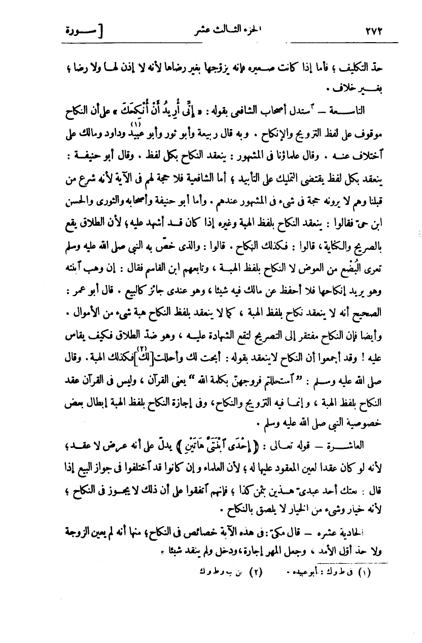 حَدَّ التَّكْلِيفِ، فَأَمَّا إِذَا كَانَتْ صَغِيرَةً فَإِنَّهُ يُزَوِّجُهَا بِغَيْرِ رِضَاهَا لِأَنَّهُ لَا إِذْنَ لَهَا وَلَا رِضًا، بِغَيْرِ خِلَافٍ. التَّاسِعَةُ- اسْتَدَلَّ أَصْحَابُ الشَّافِعِيِّ بِقَوْلِهِ:" إِنِّي أُرِيدُ أَنْ أُنْكِحَكَ" عَلَى أَنَّ النِّكَاحَ مَوْقُوفٌ عَلَى لَفْظِ التَّزْوِيجِ وَالْإِنْكَاحِ. وَبِهِ قَالَ رَبِيعَةُ وَأَبُو ثَوْرٍ وَأَبُو عُبَيْدٍ وَدَاوُدُ وَمَالِكٌ عَلَى اخْتِلَافٍ عَنْهُ. وَقَالَ عُلَمَاؤُنَا فِي الْمَشْهُورِ: يَنْعَقِدُ النِّكَاحُ بِكُلِّ لَفْظٍ. وَقَالَ أَبُو حَنِيفَةَ: يَنْعَقِدُ بِكُلِّ لَفْظٍ يَقْتَضِي التَّمْلِيكَ عَلَى التَّأْبِيدِ، أَمَّا الشَّافِعِيَّةُ فَلَا حُجَّةَ لَهُمْ فِي الْآيَةِ لِأَنَّهُ شَرْعُ مَنْ قَبْلَنَا وَهُمْ لا يرونه حجة في شي فِي الْمَشْهُورِ عِنْدَهُمْ وَأَمَّا أَبُو حَنِيفَةَ وَأَصْحَابُهُ والثوري والحسن ابن حَيٍّ فَقَالُوا: يَنْعَقِدُ النِّكَاحُ بِلَفْظِ الْهِبَةِ وَغَيْرِهِ إِذَا كَانَ قَدْ أُشْهِدَ عَلَيْهِ، لِأَنَّ الطَّلَاقَ يَقَعُ بِالصَّرِيحِ وَالْكِنَايَةِ، قَالُوا: فَكَذَلِكَ النِّكَاحُ قَالُوا: وَالَّذِي خُصَّ بِهِ النَّبِيُّ صَلَّى اللَّهُ عَلَيْهِ وَسَلَّمَ تَعَرِّي الْبُضْعِ مِنَ الْعِوَضِ لَا النِّكَاحُ بِلَفْظِ الْهِبَةِ، وَتَابَعَهُمِ ابْنُ الْقَاسِمِ فَقَالَ: إِنْ وَهَبَ ابْنَتَهُ وَهُوَ يُرِيدُ إِنْكَاحَهَا فَلَا أَحْفَظُ عَنْ مَالِكٍ فِيهِ شَيْئًا، وَهُوَ عِنْدِي جَائِزٌ كَالْبَيْعِ. قَالَ أَبُو عُمَرَ: الصَّحِيحُ أَنَّهُ لَا يَنْعَقِدُ نِكَاحٌ بِلَفْظِ الْهِبَةِ، كَمَا لَا يَنْعَقِدُ بلفظ النكاح هبة شي مِنَ الْأَمْوَالِ. وَأَيْضًا فَإِنَّ النِّكَاحَ مُفْتَقِرٌ إِلَى التَّصْرِيحِ لِتَقَعَ الشَّهَادَةُ عَلَيْهِ، وَهُوَ ضِدُّ الطَّلَاقِ فَكَيْفَ يُقَاسُ عَلَيْهِ، وَقَدْ أَجْمَعُوا أَنَّ النِّكَاحَ لا ينعقد بقوله: أَبَحْتُ لَكَ وَأَحْلَلْتُ لَكَ فَكَذَلِكَ الْهِبَةُ. وَقَالَ صَلَّى اللَّهُ عَلَيْهِ وَسَلَّمَ:" اسْتَحْلَلْتُمْ فُرُوجَهُنَّ بِكَلِمَةِ اللَّهِ" يَعْنِي الْقُرْآنَ، وَلَيْسَ فِي الْقُرْآنِ عَقْدُ النِّكَاحِ بِلَفْظِ الْهِبَةِ، وَإِنَّمَا فِيهِ التَّزْوِيجُ وَالنِّكَاحُ، وَفِي إِجَازَةِ النِّكَاحِ بِلَفْظِ الْهِبَةِ إِبْطَالُ بَعْضِ خُصُوصِيَّةِ النَّبِيِّ صَلَّى اللَّهُ عَلَيْهِ وَسَلَّمَ. الْعَاشِرَةُ- قَوْلُهُ تَعَالَى: (إِحْدَى ابْنَتَيَّ هاتَيْنِ) يَدُلُّ عَلَى أَنَّهُ عَرْضٌ لَا عَقْدٌ، لِأَنَّهُ لَوْ كَانَ عَقْدًا لَعَيَّنَ الْمَعْقُودَ عَلَيْهَا لَهُ، لِأَنَّ الْعُلَمَاءَ وإن كَانُوا قَدِ اخْتَلَفُوا فِي جَوَازِ الْبَيْعِ إِذَا قَالَ: بِعْتُكَ أَحَدَ عَبْدَيَّ هَذَيْنِ بِثَمَنِ كَذَا، فَإِنَّهُمُ اتَّفَقُوا عَلَى أَنَّ ذَلِكَ لَا يَجُوزُ في النكاح، لأنه خيار وشئ مِنَ الْخِيَارِ لَا يُلْصَقُ بِالنِّكَاحِ. الْحَادِيَةَ عَشْرَةَ- قَالَ مَكِّيٌّ: فِي هَذِهِ الْآيَةِ خَصَائِصُ فِي النِّكَاحِ مِنْهَا أَنَّهُ لَمْ يُعَيِّنِ الزَّوْجَةَ وَلَا حَدَّ أَوَّلَ الْأَمَدِ، وَجَعَلَ الْمَهْرَ إِجَارَةً، وَدَخَلَ وَلَمْ يَنْقُدْ شَيْئًا.