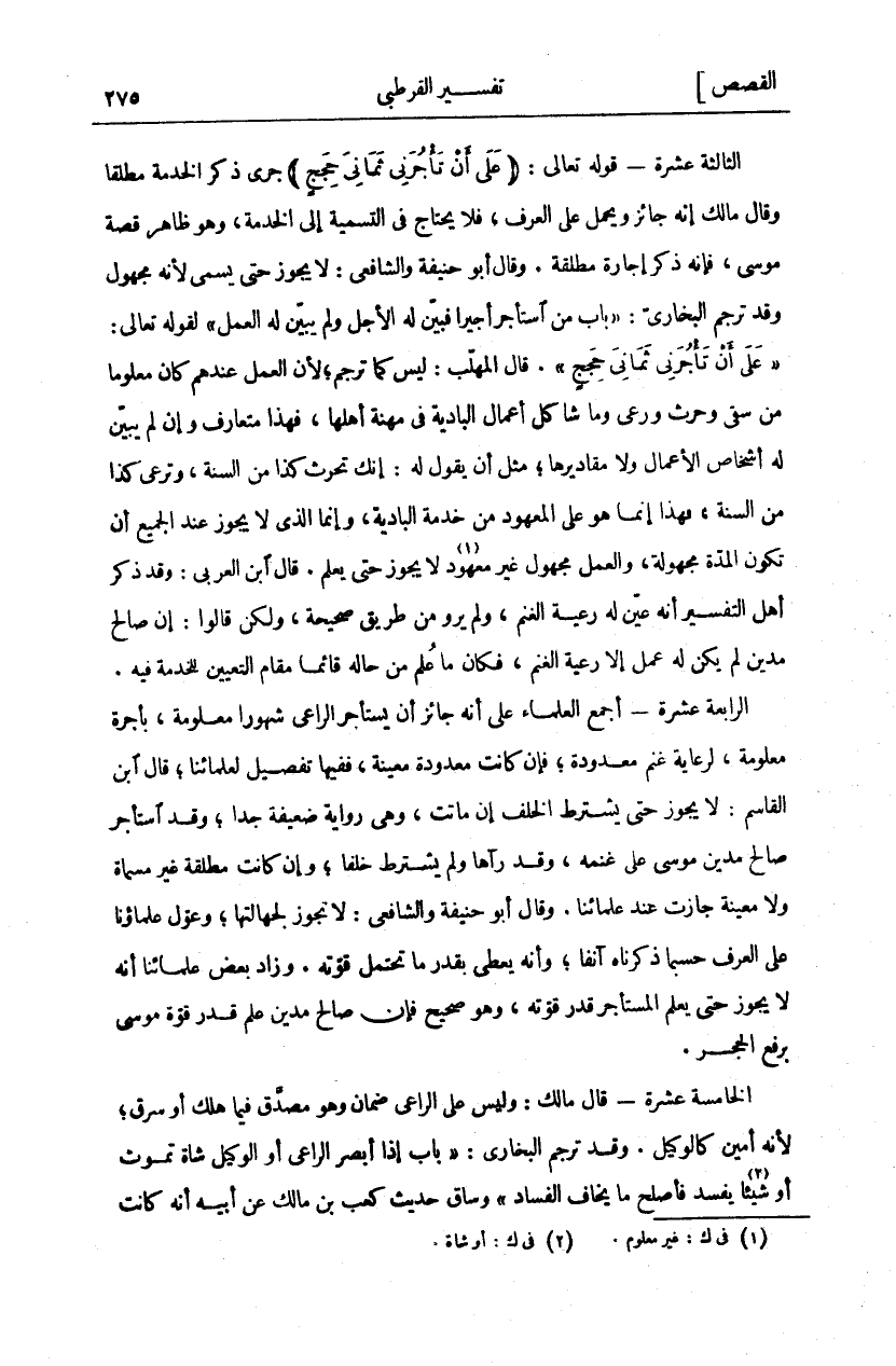 الثَّالِثَةَ عَشْرَةَ- قَوْلُهُ تَعَالَى: (عَلى أَنْ تَأْجُرَنِي ثَمانِيَ حِجَجٍ) جَرَى ذِكْرُ الْخِدْمَةِ مُطْلَقًا وَقَالَ مَالِكٌ: إِنَّهُ جَائِزٌ وَيُحْمَلُ عَلَى الْعُرْفِ، فَلَا يَحْتَاجُ فِي التَّسْمِيَةِ إِلَى الْخِدْمَةِ وَهُوَ ظَاهِرُ قِصَّةِ مُوسَى، فَإِنَّهُ ذَكَرَ إِجَارَةً مُطْلَقَةً وَقَالَ أَبُو حَنِيفَةَ وَالشَّافِعِيُّ: لَا يَجُوزُ حَتَّى يُسَمَّى لِأَنَّهُ مَجْهُولٌ. وَقَدْ تَرْجَمَ الْبُخَارِيُّ:" بَابُ مَنِ اسْتَأْجَرَ أَجِيرًا فَبَيَّنَ لَهُ الْأَجَلَ وَلَمْ يُبَيِّنْ لَهُ الْعَمَلَ" لِقَوْلِهِ تَعَالَى" عَلى أَنْ تَأْجُرَنِي ثَمانِيَ حِجَجٍ". قَالَ الْمُهَلَّبُ: لَيْسَ كَمَا تَرْجَمَ، لِأَنَّ الْعَمَلَ عِنْدَهُمْ كَانَ مَعْلُومًا مِنْ سَقْيٍ وَحَرْثٍ وَرَعْيٍ وَمَا شَاكَلَ أَعْمَالَ الْبَادِيَةِ فِي مَهْنَةِ أَهْلِهَا، فَهَذَا مُتَعَارَفٌ وَإِنْ لَمْ يُبَيِّنْ لَهُ أَشْخَاصَ الْأَعْمَالِ وَلَا مَقَادِيرَهَا، مِثْلَ أَنْ يَقُولَ لَهُ: إِنَّكَ تَحْرُثُ كَذَا مِنَ السَّنَةِ، وَتَرْعَى كَذَا مِنَ السَّنَةِ، فَهَذَا إِنَّمَا هُوَ عَلَى الْمَعْهُودِ مِنْ خِدْمَةِ الْبَادِيَةِ، وَإِنَّمَا الَّذِي لَا يَجُوزُ عِنْدَ الْجَمِيعِ أَنْ تَكُونَ الْمُدَّةُ مجهولة، والعمل مجهول غَيْرَ مَعْهُودٍ لَا يَجُوزُ حَتَّى يُعْلَمَ. قَالَ ابْنُ الْعَرَبِيِّ: وَقَدْ ذَكَرَ أَهْلُ التَّفْسِيرِ أَنَّهُ عَيَّنَ لَهُ رِعْيَةَ الْغَنَمِ، وَلَمْ يُرْوَ مِنْ طَرِيقٍ صَحِيحَةٍ، وَلَكِنْ قَالُوا: إِنَّ صَالِحَ مَدْيَنَ لَمْ يَكُنْ لَهُ عَمَلٌ إِلَّا رِعْيَةَ الْغَنَمِ، فَكَانَ مَا عُلِمَ مِنْ حَالِهِ قَائِمًا مَقَامَ التَّعْيِينِ لِلْخِدْمَةِ فِيهِ. الرَّابِعَةَ عَشْرَةَ- أَجْمَعَ الْعُلَمَاءُ عَلَى أَنَّهُ جَائِزٌ أَنْ يَسْتَأْجِرَ الرَّاعِيَ شُهُورًا مَعْلُومَةً، بِأُجْرَةٍ مَعْلُومَةٍ، لِرِعَايَةِ غَنَمٍ مَعْدُودَةٍ، فَإِنْ كَانَتْ مَعْدُودَةً مُعَيَّنَةً، فَفِيهَا تَفْصِيلٌ لِعُلَمَائِنَا، قَالَ ابْنُ الْقَاسِمِ: لَا يَجُوزُ حَتَّى يَشْتَرِطَ الْخَلْفَ إِنْ مَاتَتْ، وَهِيَ رِوَايَةٌ ضَعِيفَةٌ جِدًّا، وَقَدِ اسْتَأْجَرَ صَالِحُ مَدْيَنَ مُوسَى عَلَى غَنَمِهِ، وَقَدْ رَآهَا وَلَمْ يَشْتَرِطْ خَلْفًا، وَإِنْ كَانَتْ مُطْلَقَةً غَيْرَ مُسَمَّاةٍ وَلَا مُعَيَّنَةٍ جَازَتْ عِنْدَ عُلَمَائِنَا. وَقَالَ أَبُو حَنِيفَةَ وَالشَّافِعِيُّ: لَا تَجُوزُ لِجَهَالَتِهَا، وَعَوَّلَ عُلَمَاؤُنَا عَلَى الْعُرْفِ حَسْبَمَا ذَكَرْنَاهُ آنِفًا، وَأَنَّهُ يُعْطَى بِقَدْرِ مَا تَحْتَمِلُ قُوَّتُهُ. وَزَادَ بَعْضُ عُلَمَائِنَا أَنَّهُ لَا يَجُوزُ حَتَّى يَعْلَمَ الْمُسْتَأْجِرُ قَدْرَ قُوَّتِهِ، وَهُوَ صَحِيحٌ فَإِنَّ صَالِحَ مَدْيَنَ عَلِمَ قَدْرَ قُوَّةِ مُوسَى بِرَفْعِ الْحَجَرِ. الْخَامِسَةَ عَشْرَةَ- قَالَ مَالِكٌ: وَلَيْسَ عَلَى الرَّاعِي ضَمَانٌ وَهُوَ مُصَدَّقٌ فِيمَا هَلَكَ أَوْ سُرِقَ، لِأَنَّهُ أَمِينٌ كَالْوَكِيلِ. وَقَدْ تَرْجَمَ الْبُخَارِيُّ:" بَابُ إِذَا أَبْصَرَ الرَّاعِي أَوِ الْوَكِيلُ شَاةً تَمُوتُ أَوْ شَيْئًا يَفْسُدُ فَأَصْلَحَ مَا يَخَافُ الْفَسَادَ" وَسَاقَ حَدِيثَ كَعْبِ بْنِ مَالِكٍ عَنْ أَبِيهِ أنه كانت