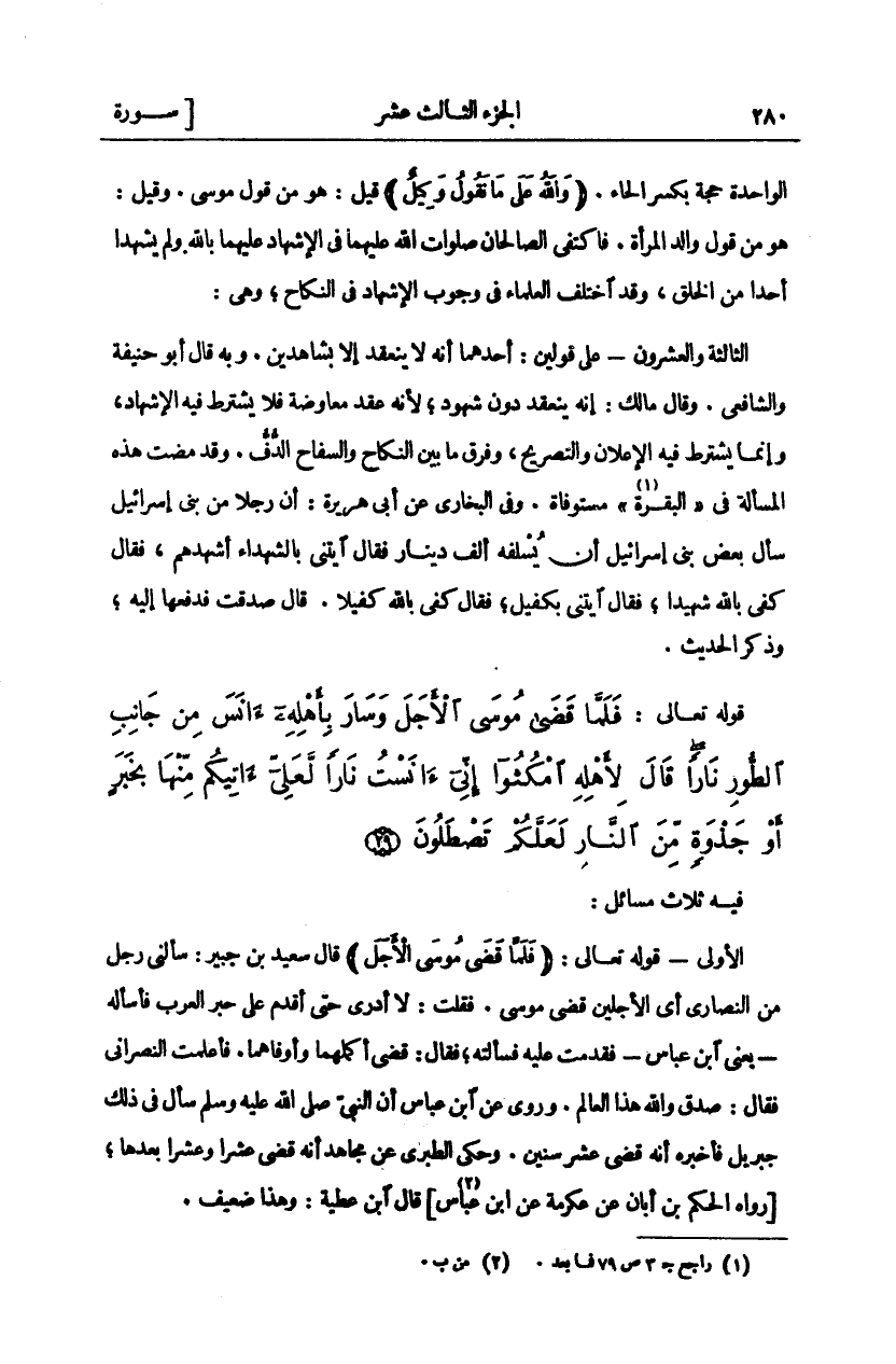 فِيهِ ثَلَاثُ مَسَائِلَ: الْأُولَى- قَوْلُهُ تَعَالَى: (فَلَمَّا قَضى مُوسَى الْأَجَلَ) قَالَ سَعِيدُ بْنُ جُبَيْرٍ: سَأَلَنِي رَجُلٌ مِنَ النَّصَارَى أَيُّ الْأَجَلَيْنِ قَضَى مُوسَى فَقُلْتُ: لَا أَدْرِي حَتَّى أَقْدَمَ عَلَى حَبْرِ الْعَرَبِ فَأَسْأَلَهُ- يَعْنِي ابْنَ عَبَّاسٍ- فَقَدِمْتُ عَلَيْهِ فَسَأَلْتُهُ، فَقَالَ: قَضَى أَكْمَلَهُمَا وَأَوْفَاهُمَا فَأَعْلَمْتُ النَّصْرَانِيَّ فَقَالَ: صَدَقَ وَاللَّهِ هَذَا الْعَالِمُ. وَرُوِيَ عَنِ ابْنِ عَبَّاسٍ أَنَّ النَّبِيَّ صَلَّى اللَّهُ عَلَيْهِ وَسَلَّمَ سَأَلَ فِي ذَلِكَ جِبْرِيلَ فَأَخْبَرَهُ أَنَّهُ قَضَى عَشْرَ سِنِينَ. وَحَكَى الطَّبَرِيُّ عَنْ مُجَاهِدٍ أنه قضى عشرا وعشرا بعدها، قال ابن عطية: وهذا ضعيف.