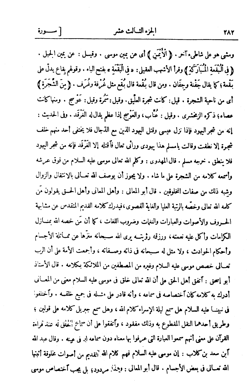 وَمَشَى هُوَ عَلَى شَاطِئٍ آخَرَ. (الْأَيْمَنِ) أَيْ عَنْ يَمِينِ مُوسَى. وَقِيلَ: عَنْ يَمِينِ الْجَبَلِ. (فِي الْبُقْعَةِ الْمُبارَكَةِ) وَقَرَأَ الْأَشْهَبُ الْعُقَيْلِيُّ" فِي الْبُقْعَةِ" بِفَتْحِ الْبَاءِ. وَقَوْلِهِمْ بِقَاعٍ يَدُلُّ عَلَى بَقْعَةٍ، كَمَا يُقَالُ جَفْنَةٌ وَجِفَانٌ. وَمَنْ قَالَ بُقْعَةً قَالَ بُقَعٌ مِثْلَ غُرْفَةٍ وَغُرَفٍ. (مِنَ الشَّجَرَةِ) أَيْ مِنْ نَاحِيَةِ الشَّجَرَةِ. قِيلَ كَانَتْ شَجَرَةَ الْعُلَّيْقِ. وَقِيلَ سَمُرَةٌ وَقِيلَ عَوْسَجٌ. وَمِنْهَا كَانَتْ عَصَاهُ، ذَكَرَهُ الزَّمَخْشَرِيُّ وَقِيلَ: عُنَّابٌ، وَالْعَوْسَجُ إِذَا عَظُمَ يُقَالُ لَهُ الْغَرْقَدُ. وَفِي الْحَدِيثِ: إِنَّهُ مِنْ شَجَرِ الْيَهُودِ فَإِذَا نَزَلَ عِيسَى وَقَتَلَ الْيَهُودَ الَّذِينَ مَعَ الدَّجَّالِ فَلَا يَخْتَفِي أَحَدٌ مِنْهُمْ خَلْفَ شَجَرَةٍ إِلَّا نَطَقَتْ وَقَالَتْ يَا مُسْلِمُ هَذَا يَهُودِيٌّ وَرَائِي تَعَالَ فَاقْتُلْهُ إِلَّا الْغَرْقَدَ فَإِنَّهُ مِنْ شَجَرِ الْيَهُودِ فَلَا يَنْطِقُ. خَرَّجَهُ مُسْلِمٌ. قَالَ الْمَهْدَوِيُّ: وَكَلَّمَ اللَّهُ تَعَالَى مُوسَى عَلَيْهِ السَّلَامُ مِنْ فَوْقِ عَرْشِهِ وَأَسْمَعَهُ كَلَامَهُ مِنَ الشَّجَرَةِ عَلَى مَا شَاءَ. وَلَا يَجُوزُ أَنْ يوصف الله تَعَالَى بِالِانْتِقَالِ وَالزَّوَالِ وَشِبْهِ ذَلِكَ مِنْ صِفَاتِ الْمَخْلُوقِينَ. قَالَ أَبُو الْمَعَالِي: وَأَهْلُ الْمَعَانِي وَأَهْلُ الْحَقِّ يَقُولُونَ مَنْ كَلَّمَهُ اللَّهُ تَعَالَى وَخَصَّهُ بِالرُّتْبَةِ الْعُلْيَا وَالْغَايَةِ الْقُصْوَى، فَيُدْرِكُ كَلَامَهُ الْقَدِيمَ المتقدس عَنْ مُشَابَهَةِ الْحُرُوفِ وَالْأَصْوَاتِ وَالْعِبَارَاتِ وَالنَّغَمَاتِ وَضُرُوبِ اللُّغَاتِ، كَمَا أَنَّ مَنْ خَصَّهُ اللَّهُ بِمَنَازِلِ الْكَرَامَاتِ وَأَكْمَلَ عَلَيْهِ نِعْمَتَهُ، وَرَزَقَهُ رُؤْيَتَهُ يَرَى اللَّهَ سُبْحَانَهُ مُنَزَّهًا عَنْ مُمَاثَلَةِ الْأَجْسَامِ وَأَحْكَامِ الْحَوَادِثِ، وَلَا مِثْلَ لَهُ سُبْحَانَهُ فِي ذَاتِهِ وَصِفَاتِهِ، وَأَجْمَعَتِ الْأُمَّةُ عَلَى أَنَّ الرَّبَّ تَعَالَى خَصَّصَ مُوسَى عَلَيْهِ السَّلَامُ وَغَيْرَهُ مِنَ الْمُصْطَفَيْنَ مِنَ الْمَلَائِكَةِ بِكَلَامِهِ. قَالَ الْأُسْتَاذُ أَبُو إِسْحَاقَ: اتَّفَقَ أَهْلُ الْحَقِّ عَلَى أَنَّ اللَّهَ تَعَالَى خَلَقَ فِي مُوسَى عَلَيْهِ السَّلَامُ مَعْنًى مِنَ الْمَعَانِي أَدْرَكَ بِهِ كَلَامَهُ كَانَ اخْتِصَاصُهُ فِي سَمَاعِهِ، وَأَنَّهُ قَادِرٌ عَلَى مِثْلِهِ فِي جَمِيعِ خَلْقِهِ. وَاخْتَلَفُوا فِي نَبِيِّنَا عَلَيْهِ السَّلَامُ هَلْ سَمِعَ لَيْلَةَ الْإِسْرَاءِ كَلَامَ اللَّهِ، وَهَلْ سَمِعَ جِبْرِيلُ كَلَامَهُ عَلَى قَوْلَيْنِ، وَطَرِيقُ أَحَدِهِمَا النَّقْلُ الْمَقْطُوعُ بِهِ وَذَلِكَ مَفْقُودٌ، وَاتَّفَقُوا عَلَى أَنَّ سَمَاعَ الْخَلْقِ لَهُ عِنْدَ قِرَاءَةَ الْقُرْآنِ عَلَى مَعْنَى أَنَّهُمْ سَمِعُوا الْعِبَارَةَ الَّتِي عَرَفُوا بِهَا مَعْنَاهُ دُونَ سَمَاعِهِ لَهُ فِي عَيْنِهِ. وَقَالَ عبد الله. ابن سَعْدِ بْنُ كِلَابٍ: إِنَّ مُوسَى عَلَيْهِ السَّلَامُ فَهِمَ كَلَامَ اللَّهِ الْقَدِيمَ مِنْ أَصْوَاتٍ مَخْلُوقَةٍ أَثْبَتَهَا اللَّهُ تَعَالَى فِي بَعْضِ الْأَجْسَامِ. قَالَ أَبُو الْمَعَالِي: وَهَذَا مَرْدُودٌ، بَلْ يَجِبُ اخْتِصَاصُ موسى