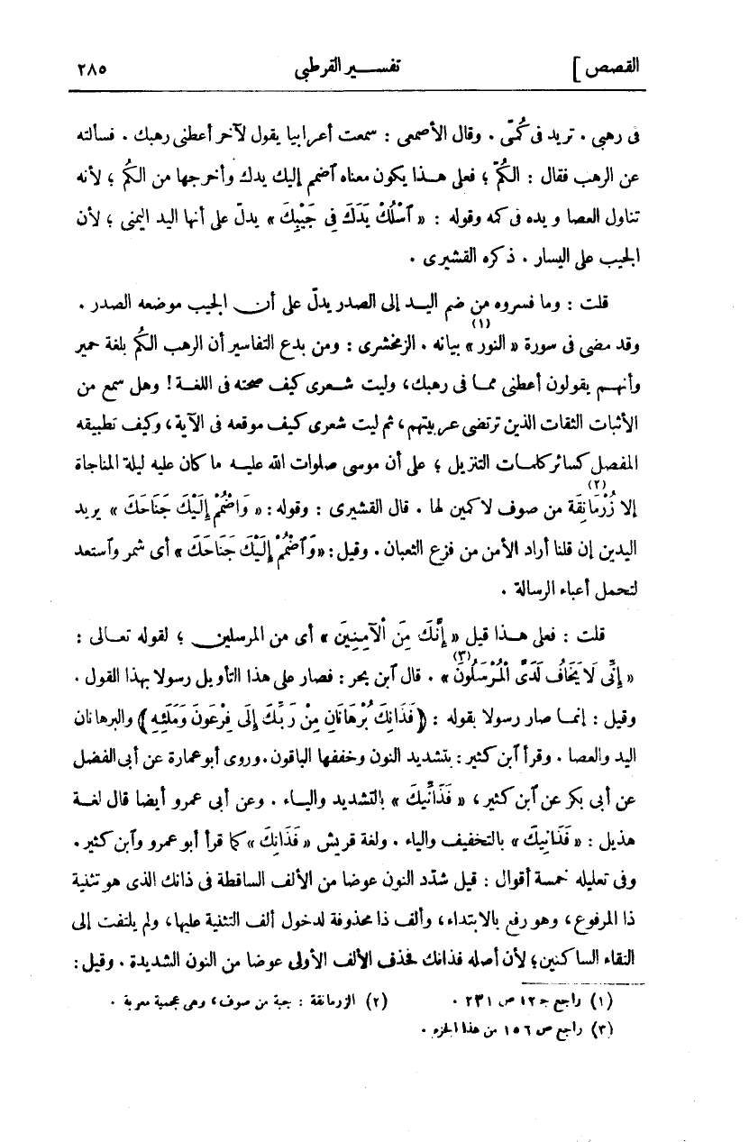 فقالت: ها هنا فِي رَهْبِي. تُرِيدُ فِي كُمِّي. وَقَالَ الْأَصْمَعِيُّ: سَمِعْتُ أَعْرَابِيًّا يَقُولُ لِآخَرَ أَعْطِنِي رَهْبَكَ. فَسَأَلْتُهُ عَنِ الرَّهْبِ فَقَالَ: الْكُمُّ، فَعَلَى هَذَا يَكُونُ مَعْنَاهُ اضْمُمْ إِلَيْكَ يَدَكَ وَأَخْرِجْهَا مِنَ الْكُمِّ، لِأَنَّهُ تَنَاوَلَ الْعَصَا وَيَدُهُ فِي كُمِّهِ وَقَوْلُهُ:" اسْلُكْ يَدَكَ فِي جَيْبِكَ" يَدُلُّ عَلَى أَنَّهَا الْيَدُ الْيُمْنَى، لِأَنَّ الْجَيْبَ عَلَى الْيَسَارِ. ذَكَرَهُ الْقُشَيْرِيُّ قُلْتُ: وَمَا فَسَّرُوهُ مِنْ ضَمِّ الْيَدِ إِلَى الصَّدْرِ يَدُلُّ عَلَى أَنَّ الْجَيْبَ مَوْضِعُهُ الصَّدْرُ. وَقَدْ مَضَى فِي سُورَةِ" النُّورِ" «١» بَيَانُهُ. الزَّمَخْشَرِيُّ: وَمِنْ بِدَعِ التَّفَاسِيرِ أَنَّ الرَّهْبَ الْكُمُّ بِلُغَةِ حِمْيَرَ وَأَنَّهُمْ يَقُولُونَ أَعْطِنِي مِمَّا فِي رَهْبِكَ، وَلَيْتَ شِعْرِي كَيْفَ صِحَّتُهُ فِي اللُّغَةِ! وَهَلْ سُمِعَ مِنَ الْأَثْبَاتِ الثِّقَاتِ الَّذِينَ تُرْتَضَى عَرَبِيَّتُهُمْ، ثُمَّ لَيْتَ شِعْرِي كَيْفَ مَوْقِعُهُ فِي الْآيَةِ، وَكَيْفَ تَطْبِيقُهُ الْمُفَصَّلُ كَسَائِرِ كَلِمَاتِ التَّنْزِيلِ، على أن موسى صلوات عَلَيْهِ مَا كَانَ عَلَيْهِ لَيْلَةَ الْمُنَاجَاةِ إِلَّا زُرْمَانِقَةً «٢» مِنْ صُوفٍ لَا كُمَّيْنِ لَهَا. قَالَ الْقُشَيْرِيُّ: وَقَوْلُهُ:" وَاضْمُمْ إِلَيْكَ جَناحَكَ" يُرِيدُ الْيَدَيْنِ إِنْ قُلْنَا أَرَادَ الْأَمْنَ مِنْ فَزَعِ الثُّعْبَانِ. وَقِيلَ:" وَاضْمُمْ إِلَيْكَ جَناحَكَ" أَيْ شَمِّرْ وَاسْتَعِدَّ لِتَحَمُّلِ أَعْبَاءِ الرِّسَالَةِ. قُلْتُ: فَعَلَى هَذَا قِيلَ:" إِنَّكَ مِنَ الْآمِنِينَ" أَيْ مِنَ الْمُرْسَلِينَ، لِقَوْلِهِ تَعَالَى:" إِنِّي لَا يَخافُ لَدَيَّ الْمُرْسَلُونَ" قَالَ ابْنُ بَحْرٍ: فَصَارَ عَلَى هَذَا التَّأْوِيلِ رَسُولًا بهذا القول. وقيل إنما صار رسولا بقول: (فَذانِكَ بُرْهانانِ مِنْ رَبِّكَ إِلى فِرْعَوْنَ وَمَلَائِهِ) والبرهان الْيَدُ وَالْعَصَا وَقَرَأَ ابْنُ كَثِيرٍ بِتَشْدِيدِ النُّونِ وَخَفَّفَهَا الْبَاقُونَ. وَرَوَى أَبُو عُمَارَةَ عَنْ أَبِي الْفَضْلِ عَنْ أَبِي بَكْرٍ عَنِ ابْنِ كَثِيرٍ،" فَذَانِّيكَ" بِالتَّشْدِيدِ وَالْيَاءِ. وَعَنْ أَبِي عَمْرٍو أَيْضًا قَالَ لُغَةُ هُذَيْلٍ" فَذَانِيكَ" بِالتَّخْفِيفِ وَالْيَاءِ. وَلُغَةُ قُرَيْشٍ" فَذانِكَ" كَمَا قَرَأَ أَبُو عَمْرٍو وَابْنُ كَثِيرٍ. وَفِي تَعْلِيلِهِ خَمْسَةُ أَقْوَالٍ: قِيلَ شَدَّدَ النُّونَ عِوَضًا مِنَ الْأَلِفِ السَّاقِطَةِ فِي ذَانِكَ الَّذِي هُوَ تَثْنِيَةُ ذَا الْمَرْفُوعِ، وَهُوَ رَفْعٌ بِالِابْتِدَاءِ، وَأَلِفُ ذَا مَحْذُوفَةٌ لِدُخُولِ أَلِفِ التَّثْنِيَةِ عَلَيْهَا، وَلَمْ يَلْتَفِتْ إِلَى الْتِقَاءِ السَّاكِنَيْنِ، لِأَنَّ أصله فذاانك فَحُذِفَ الْأَلِفُ الْأُولَى عِوَضًا مِنَ النُّونِ الشَّدِيدَةِ. وقيل: