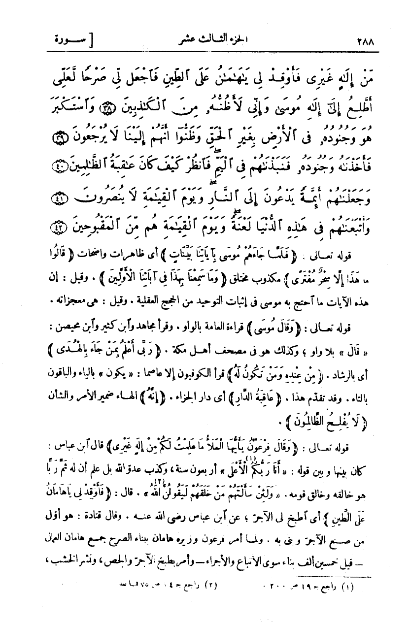 قَوْلُهُ تَعَالَى: (فَلَمَّا جاءَهُمْ مُوسى بِآياتِنا بَيِّناتٍ) أَيْ ظَاهِرَاتٍ وَاضِحَاتٍ (قالُوا مَا هَذَا إِلَّا سِحْرٌ مُفْتَرىً) مَكْذُوبٌ مُخْتَلَقٌ (وَما سَمِعْنا بِهذا فِي آبائِنَا الْأَوَّلِينَ). وَقِيلَ: إِنَّ هَذِهِ الْآيَاتِ وَمَا احْتَجَّ بِهِ مُوسَى فِي إِثْبَاتِ التَّوْحِيدِ مِنَ الْحُجَجِ الْعَقْلِيَّةِ. وَقِيلَ: هِيَ مُعْجِزَاتُهُ. قَوْلُهُ تَعَالَى: (وَقالَ مُوسى) قِرَاءَةُ الْعَامَّةِ بِالْوَاوِ. وَقَرَأَ مُجَاهِدٌ وَابْنُ كَثِيرٍ وَابْنُ مُحَيْصِنٍ" قَالَ" بِلَا وَاوٍ، وَكَذَلِكَ هُوَ فِي مُصْحَفِ أَهْلِ مَكَّةَ (رَبِّي أَعْلَمُ بِمَنْ جاءَ بِالْهُدى) أَيْ بِالرَّشَادِ. (مِنْ عِنْدِهِ وَمَنْ تَكُونُ لَهُ) قَرَأَ الْكُوفِيُّونَ إِلَّا عَاصِمًا" يَكُونُ" بِالْيَاءِ وَالْبَاقُونَ بِالتَّاءِ. وَقَدْ تَقَدَّمَ هَذَا. (عاقِبَةُ الدَّارِ) أَيْ دَارِ الْجَزَاءِ. (إِنَّهُ) الْهَاءُ ضَمِيرُ الْأَمْرِ وَالشَّأْنِ (لَا يُفْلِحُ الظَّالِمُونَ). قَوْلُهُ تَعَالَى: (وَقالَ فِرْعَوْنُ يَا أَيُّهَا الْمَلَأُ مَا عَلِمْتُ لَكُمْ مِنْ إِلهٍ غَيْرِي) قَالَ ابْنُ عَبَّاسٍ: كَانَ بَيْنَهَا وَبَيْنَ قَوْلِهِ:" أَنَا رَبُّكُمُ الْأَعْلى " أَرْبَعُونَ سَنَةً، وَكَذَبَ عَدُوُّ اللَّهِ بَلْ عَلِمَ أَنَّ لَهُ ثَمَّ رَبًّا هُوَ خالقه وخالق قومه" ولين سَأَلْتَهُمْ مَنْ خَلَقَهُمْ لَيَقُولُنَّ اللَّهُ". قَالَ: (فَأَوْقِدْ لِي يَا هامانُ عَلَى الطِّينِ) أَيِ اطْبُخْ لِي الْآجُرَّ، عَنِ ابْنِ عَبَّاسٍ رَضِيَ اللَّهُ عَنْهُ. وَقَالَ قَتَادَةُ: هُوَ أَوَّلُ مَنْ صَنَعَ الْآجُرَّ وَبَنَى بِهِ. وَلَمَّا أَمَرَ فِرْعَوْنُ وَزِيرَهُ هَامَانَ بِبِنَاءِ الصَّرْحِ جَمَعَ هَامَانُ الْعُمَّالَ- قِيلَ خَمْسِينَ أَلْفَ بَنَّاءٍ سِوَى الْأَتْبَاعِ وَالْأُجَرَاءِ- وَأَمَرَ بِطَبْخِ الْآجُرِّ وَالْجِصِّ، وَنَشْرِ الْخَشَبِ