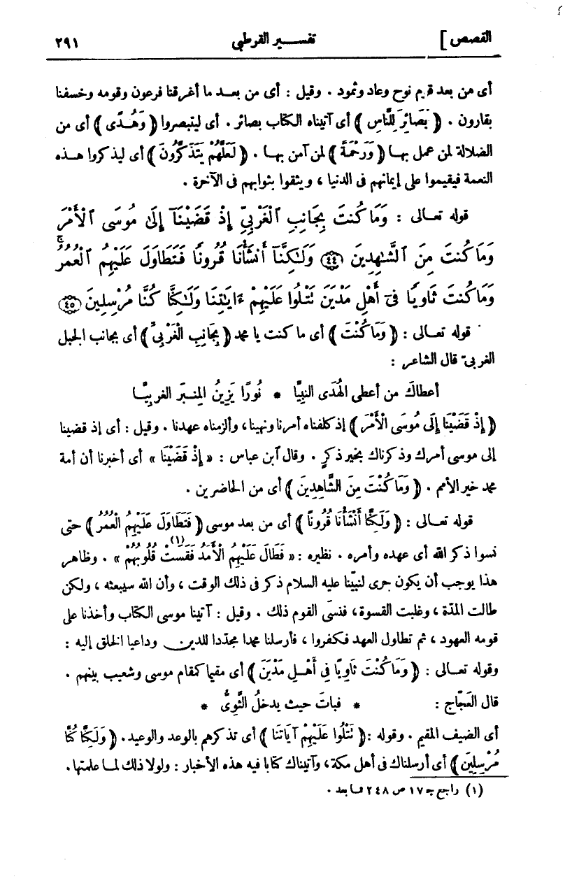 (إِذْ قَضَيْنا إِلى مُوسَى الْأَمْرَ) إِذْ كَلَّفْنَاهُ أَمْرَنَا وَنَهْيَنَا، وَأَلْزَمْنَاهُ عَهْدَنَا وَقِيلَ: أَيْ إِذْ قَضَيْنَا إِلَى مُوسَى أَمْرَكَ وَذَكَرْنَاكَ بِخَيْرِ ذِكْرٍ. وَقَالَ ابْنُ عَبَّاسٍ:" إِذْ قَضَيْنا" أَيْ أَخْبَرْنَا أَنَّ أُمَّةَ مُحَمَّدٍ خَيْرُ الْأُمَمِ. (وَما كُنْتَ مِنَ الشَّاهِدِينَ) أَيْ مِنَ الحاضرين. قوله تعالى: (وَلكِنَّا أَنْشَأْنا قُرُوناً) أَيْ مِنْ بَعْدِ مُوسَى (فَتَطاوَلَ عَلَيْهِمُ الْعُمُرُ) حَتَّى نَسُوا ذِكْرَ اللَّهِ أَيْ عَهْدَهُ وَأَمْرَهُ. نَظِيرُهُ:" فَطالَ عَلَيْهِمُ الْأَمَدُ فَقَسَتْ قُلُوبُهُمْ". وَظَاهِرُ هَذَا يُوجِبُ أَنْ يَكُونَ جَرَى لِنَبِيِّنَا عَلَيْهِ السَّلَامُ ذِكْرٌ فِي ذَلِكَ الْوَقْتِ، وَأَنَّ اللَّهَ سَيَبْعَثُهُ، وَلَكِنْ طَالَتِ الْمُدَّةُ، وَغَلَبَتِ الْقَسْوَةُ، فَنَسِيَ الْقَوْمُ ذَلِكَ وَقِيلَ: آتَيْنَا مُوسَى الْكِتَابَ وَأَخَذْنَا عَلَى قَوْمِهِ الْعُهُودَ، ثُمَّ تَطَاوَلَ الْعَهْدُ فَكَفَرُوا، فَأَرْسَلْنَا مُحَمَّدًا مُجَدِّدًا لِلدِّينِ وداعيا الخلق إليه. قوله تعالى: (وَما كُنْتَ ثاوِياً فِي أَهْلِ مَدْيَنَ) أَيْ مُقِيمًا كَمُقَامِ مُوسَى وَشُعَيْبٍ بَيْنَهُمْ. قَالَ الْعَجَّاجُ: