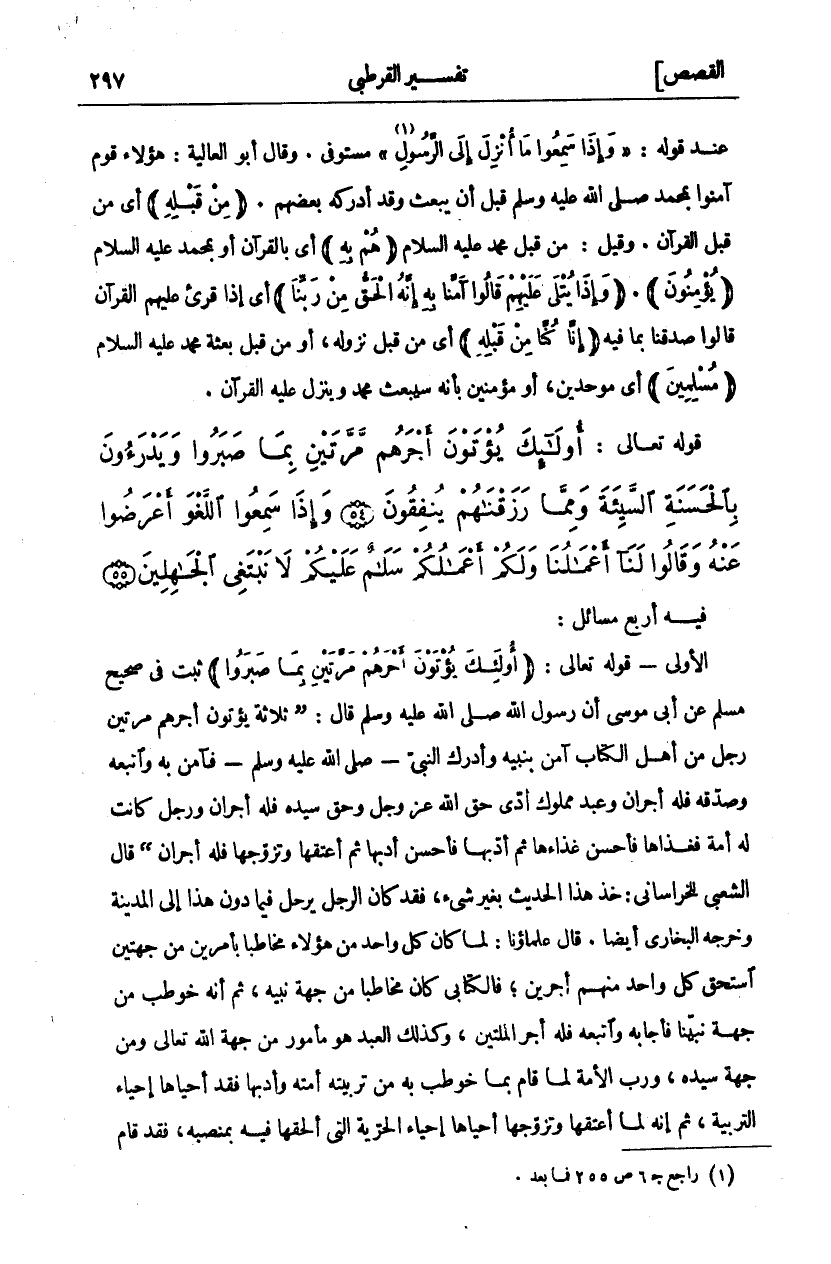 فِيهِ أَرْبَعُ مَسَائِلَ: الْأُولَى- قَوْلُهُ تَعَالَى: (أُولئِكَ يُؤْتَوْنَ أَجْرَهُمْ مَرَّتَيْنِ بِما صَبَرُوا) ثَبَتَ فِي صَحِيحِ مُسْلِمٍ عَنْ أَبِي مُوسَى أَنَّ رَسُولَ اللَّهِ صَلَّى اللَّهُ عَلَيْهِ وَسَلَّمَ قَالَ:" ثَلَاثَةٌ يُؤْتَوْنَ أَجْرَهُمْ مَرَّتَيْنِ رَجُلٌ مِنْ أَهْلِ الْكِتَابِ آمَنَ بِنَبِيِّهِ وَأَدْرَكَ النَّبِيَّ- صَلَّى اللَّهُ عَلَيْهِ وَسَلَّمَ- فَآمَنَ بِهِ وَاتَّبَعَهُ وَصَدَّقَهُ فَلَهُ أَجْرَانِ وَعَبْدٌ مَمْلُوكٌ أَدَّى حَقَّ اللَّهِ عَزَّ وَجَلَّ وَحَقَّ سَيِّدِهِ فَلَهُ أَجْرَانِ وَرَجُلٌ كَانَتْ لَهُ أَمَةٌ فَغَذَّاهَا فَأَحْسَنَ غِذَاءَهَا ثُمَّ أدبها فأحسن أَدَّبَهَا ثُمَّ أَعْتَقَهَا وَتَزَوَّجَهَا فَلَهُ أَجْرَانِ" قَالَ الشعبي للخراساني: خذا هذا الحديث بغير شي، فَقَدْ كَانَ الرَّجُلُ يَرْحَلُ فِيمَا دُونَ هَذَا إِلَى الْمَدِينَةِ. وَخَرَّجَهُ الْبُخَارِيُّ أَيْضًا. قَالَ عُلَمَاؤُنَا: لَمَّا كَانَ كُلُّ وَاحِدٍ مِنْ هَؤُلَاءِ مُخَاطَبًا بِأَمْرَيْنِ مِنْ جِهَتَيْنِ اسْتَحَقَّ كُلُّ وَاحِدٍ مِنْهُمْ أَجْرَيْنِ، فَالْكِتَابِيُّ كَانَ مُخَاطَبًا مِنْ جِهَةِ نَبِيِّهِ، ثُمَّ إِنَّهُ خُوطِبَ مِنْ جِهَةِ نَبِيِّنَا فَأَجَابَهُ وَاتَّبَعَهُ فَلَهُ أَجْرُ الْمِلَّتَيْنِ، وَكَذَلِكَ الْعَبْدُ هُوَ مَأْمُورٌ مِنْ جِهَةِ اللَّهِ تَعَالَى وَمِنْ جِهَةِ سَيِّدِهِ، وَرَبُّ الْأَمَةِ لَمَّا قَامَ بِمَا خُوطِبَ بِهِ مِنْ تَرْبِيَتِهِ أَمَتَهُ وَأَدَبِهَا فَقَدْ أَحْيَاهَا إِحْيَاءَ التَّرْبِيَةِ، ثُمَّ إِنَّهُ لَمَّا أَعْتَقَهَا وَتَزَوَّجَهَا أَحْيَاهَا إِحْيَاءَ الْحُرِّيَّةِ الَّتِي أَلْحَقَهَا فِيهِ بِمَنْصِبِهِ، فقد قام