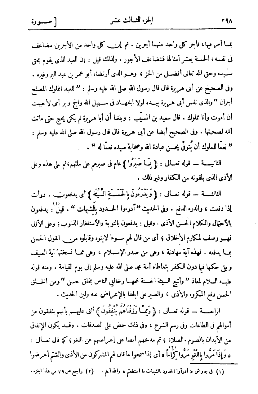 بِمَا أُمِرَ فِيهَا، فَأَجْرُ كُلِّ وَاحِدٍ مِنْهُمْ أَجْرَيْنِ. ثُمَّ إِنَّ كُلَّ وَاحِدٍ مِنَ الْأَجْرَيْنِ مُضَاعَفٌ فِي نَفْسِهِ، الْحَسَنَةُ بِعَشْرِ أَمْثَالِهَا فَتَتَضَاعَفُ الْأُجُورُ. وَلِذَلِكَ قِيلَ: إِنَّ الْعَبْدَ الَّذِي يَقُومُ بِحَقِ سَيِّدِهِ وَحَقِّ اللَّهِ تَعَالَى أَفْضَلُ مِنَ الْحُرِّ، وَهُوَ الَّذِي ارْتَضَاهُ أَبُو عُمَرَ بْنُ عَبْدِ الْبَرِّ وَغَيْرُهُ. وَفِي الصَّحِيحُ عَنْ أَبِي هُرَيْرَةَ قَالَ قَالَ رَسُولُ اللَّهِ صَلَّى اللَّهُ عَلَيْهِ وَسَلَّمَ:" لِلْعَبْدِ الْمَمْلُوكِ الْمُصْلِحِ أَجْرَانِ" وَالَّذِي نَفْسُ أَبِي هُرَيْرَةَ بِيَدِهِ لَوْلَا الْجِهَادُ فِي سَبِيلِ اللَّهِ وَالْحَجُّ وَبِرُّ أُمِّي لَأَحْبَبْتُ أَنْ أَمُوتَ وَأَنَا مَمْلُوكٌ قَالَ سَعِيدُ بْنُ الْمُسَيِّبِ: وَبَلَغَنَا أَنَّ أَبَا هُرَيْرَةَ لَمْ يَكُنْ يَحُجُّ حَتَّى مَاتَتْ أُمُّهُ لِصُحْبَتِهَا. وَفِي الصَّحِيحُ أَيْضًا عَنْ أَبِي هُرَيْرَةَ قَالَ قَالَ رَسُولُ اللَّهِ صَلَّى اللَّهُ عَلَيْهِ وَسَلَّمَ:" نِعِمَّا لِلْمَمْلُوكِ أَنْ يُتَوَفَّى يُحْسِنُ عِبَادَةَ اللَّهِ وَصَحَابَةَ سَيِّدِهِ نِعِمَّا لَهُ". الثَّانِيَةُ- قَوْلُهُ تَعَالَى (بِما صَبَرُوا) عَامٌّ فِي صَبْرِهِمْ عَلَى مِلَّتِهِمْ، ثُمَّ عَلَى هَذِهِ وَعَلَى الْأَذَى الَّذِي يَلْقَوْنَهُ مِنَ الْكُفَّارِ وَغَيْرِ ذلك. الثالثة- قوله تعالى: (وَيَدْرَؤُنَ بِالْحَسَنَةِ السَّيِّئَةَ) أَيْ يَدْفَعُونَ دَرَأْتُ إِذَا دَفَعْتُ، وَالدَّرْءُ الدَّفْعُ. وَفِي الْحَدِيثِ" ادْرَءُوا الْحُدُودَ بِالشُّبُهَاتِ". قِيلَ: يَدْفَعُونَ بِالِاحْتِمَالِ وَالْكَلَامِ الْحَسَنِ الْأَذَى. وَقِيلَ: يَدْفَعُونَ بِالتَّوْبَةِ وَالِاسْتِغْفَارِ الذُّنُوبَ، وَعَلَى الْأَوَّلِ فَهُوَ وَصْفٌ لِمَكَارِمِ الْأَخْلَاقِ، أَيْ مَنْ قَالَ لَهُمْ سوءا لا ينوه وَقَابَلُوهُ مِنَ الْقَوْلِ الْحَسَنِ بِمَا يَدْفَعُهُ فَهَذِهِ آيَةُ مُهَادَنَةٍ، وَهِيَ مِنْ صَدْرِ الْإِسْلَامِ، وَهِيَ مِمَّا نَسَخَتْهَا آيَةُ السَّيْفِ وَبَقِيَ حُكْمُهَا فِيمَا دُونَ الْكُفْرِ يَتَعَاطَاهُ أُمَّةِ مُحَمَّدٍ صَلَّى اللَّهُ عَلَيْهِ وَسَلَّمَ إِلَى يَوْمِ الْقِيَامَةِ. وَمِنْهُ قَوْلُهُ عَلَيْهِ السَّلَامُ لِمُعَاذٍ:" وَأَتْبِعِ السَّيِّئَةَ الْحَسَنَةَ تَمْحُهَا وَخَالِقْ النَّاسَ بِخُلُقٍ حَسَنٍ" وَمِنَ الْخُلُقِ الْحَسَنِ دَفْعُ الْمَكْرُوهِ وَالْأَذَى، وَالصَّبْرُ عَلَى الْجَفَا بِالْإِعْرَاضِ عَنْهُ وَلِينِ الْحَدِيثِ. الرَّابِعَةُ- قَوْلُهُ تَعَالَى: (وَمِمَّا رَزَقْناهُمْ يُنْفِقُونَ) أَثْنَى عَلَيْهِمْ بِأَنَّهُمْ يُنْفِقُونَ مِنْ أَمْوَالِهِمْ فِي الطَّاعَاتِ وَفِي رَسْمِ الشَّرْعِ، وَفِي ذَلِكَ حَضٌّ عَلَى الصَّدَقَاتِ. وَقَدْ يَكُونُ الْإِنْفَاقُ مِنَ الْأَبْدَانِ بِالصَّوْمِ وَالصَّلَاةِ، ثُمَّ مَدَحَهُمْ أَيْضًا عَلَى إِعْرَاضِهِمْ عَنِ اللَّغْوِ، كَمَا قَالَ تَعَالَى:" وَإِذا مَرُّوا بِاللَّغْوِ مَرُّوا كِراماً" أَيْ إِذَا سَمِعُوا مَا قَالَ لَهُمُ الْمُشْرِكُونَ مِنَ الْأَذَى والشتم أعرضوا