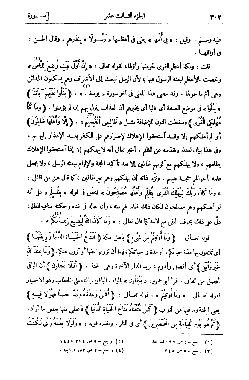 عَلَيْهِ وَسَلَّمَ. وَقِيلَ:" فِي أُمِّها" يَعْنِي فِي أعظمها" رَسُولًا" ينذرهم. وَقَالَ الْحَسَنُ: فِي أَوَائِلِهَا قُلْتُ: وَمَكَّةُ أَعْظَمُ الْقُرَى لِحُرْمَتِهَا وَأَوَّلُهَا، لِقَوْلِهِ تَعَالَى:" إِنَّ أَوَّلَ بَيْتٍ وُضِعَ لِلنَّاسِ" وَخُصَّتْ بِالْأَعْظَمِ لِبَعْثَةِ الرَّسُولِ فِيهَا، لِأَنَّ الرُّسُلَ تُبْعَثُ إِلَى الْأَشْرَافِ وَهُمْ يَسْكُنُونَ الْمَدَائِنَ وَهِيَ أُمُّ مَا حَوْلَهَا. وَقَدْ مَضَى هَذَا الْمَعْنَى فِي آخِرِ سُورَةِ" يُوسُفَ" «١». (يَتْلُوا عَلَيْهِمْ آياتِنا) " يَتْلُوا" فِي مَوْضِعِ الصِّفَةِ أَيْ تَالِيًا أَيْ يُخْبِرُهُمْ أَنَّ الْعَذَابَ يَنْزِلُ بِهِمْ إِنْ لَمْ يُؤْمِنُوا. (وَما كُنَّا مُهْلِكِي الْقُرى) سَقَطَتِ النُّونُ لِلْإِضَافَةِ مثل" ظالِمِي أَنْفُسِهِمْ" (إِلَّا وَأَهْلُها ظالِمُونَ) أي لم أهلكهم إلا وقد استحقوا الا هلاك لِإِصْرَارِهِمْ عَلَى الْكُفْرِ بَعْدَ الْإِعْذَارِ إِلَيْهِمْ. وَفِي هَذَا بَيَانٌ لِعَدْلِهِ وَتَقَدُّسِهِ عَنِ الظُّلْمِ. أَخْبَرَ تَعَالَى أَنَّهُ لَا يُهْلِكُهُمْ إِلَّا إِذَا اسْتَحَقُّوا الا هلاك بِظُلْمِهِمْ، وَلَا يُهْلِكُهُمْ مَعَ كَوْنِهِمْ ظَالِمِينَ إِلَّا بَعْدَ تَأْكِيدِ الْحُجَّةِ وَالْإِلْزَامِ بِبَعْثَةِ الرُّسُلِ، وَلَا يَجْعَلُ عِلْمَهُ بِأَحْوَالِهِمْ حُجَّةً عَلَيْهِمْ. وَنَزَّهَ ذَاتَهُ أَنْ يُهْلِكَهُمْ وَهُمْ غَيْرُ ظَالِمِينَ، كَمَا قَالَ عَزَّ مِنْ قَائِلٍ:" وَما كانَ رَبُّكَ لِيُهْلِكَ الْقُرى بِظُلْمٍ وَأَهْلُها مُصْلِحُونَ" فَنَصَّ فِي قَوْلِهِ" بِظُلْمٍ" عَلَى أَنَّهُ لَوْ أَهْلَكَهُمْ وَهُمْ مُصْلِحُونَ لَكَانَ ذَلِكَ ظُلْمًا لَهُمْ مِنْهُ، وَإِنَّ حَالَهُ فِي غِنَاهُ وَحِكْمَتَهُ مُنَافِيَةٌ لِلظُّلْمِ، دَلَّ عَلَى ذَلِكَ بِحَرْفِ النَّفْيِ مَعَ لَامِهِ كَمَا قَالَ تَعَالَى:" وَما كانَ اللَّهُ لِيُضِيعَ إِيمانَكُمْ". قَوْلُهُ تَعَالَى: (وَما أُوتِيتُمْ مِنْ شَيْءٍ) يَا أَهْلَ مَكَّةَ (فَمَتاعُ الْحَياةِ الدُّنْيا وَزِينَتُها) أَيْ تَتَمَتَّعُونَ بِهَا مُدَّةَ حَيَاتِكُمْ، أَوْ مُدَّةً فِي حَيَاتِكُمْ، فَإِمَّا أَنْ تَزُولُوا عَنْهَا أَوْ تَزُولَ عَنْكُمْ. (وَما عِنْدَ اللَّهِ خَيْرٌ وَأَبْقى) أَيْ أَفْضَلُ وَأَدْوَمُ، يُرِيدُ الدَّارَ الْآخِرَةَ وَهِيَ الْجَنَّةُ. (أَفَلا تَعْقِلُونَ) أَنَّ الْبَاقِيَ أَفْضَلُ مِنَ الْفَانِي. قَرَأَ أَبُو عَمْرٍو" يَعْقِلُونَ" بِالْيَاءِ. الْبَاقُونَ بِالتَّاءِ عَلَى الْخِطَابِ وَهُوَ الِاخْتِيَارُ لِقَوْلِهِ تَعَالَى:" وَما أُوتِيتُمْ". قَوْلُهُ تَعَالَى: (أَفَمَنْ وَعَدْناهُ وَعْداً حَسَناً فَهُوَ لاقِيهِ) يَعْنِي الْجَنَّةَ وَمَا فِيهَا مِنَ الثَّوَابِ (كَمَنْ مَتَّعْناهُ مَتاعَ الْحَياةِ الدُّنْيا) فأعطى منها بعض ما أراد. (ثُمَّ هُوَ يَوْمَ الْقِيامَةِ مِنَ الْمُحْضَرِينَ) أي في النار. ونظيره قوله:" وَلَوْلا نِعْمَةُ رَبِّي لَكُنْتُ مِنَ الْمُحْضَرِينَ"