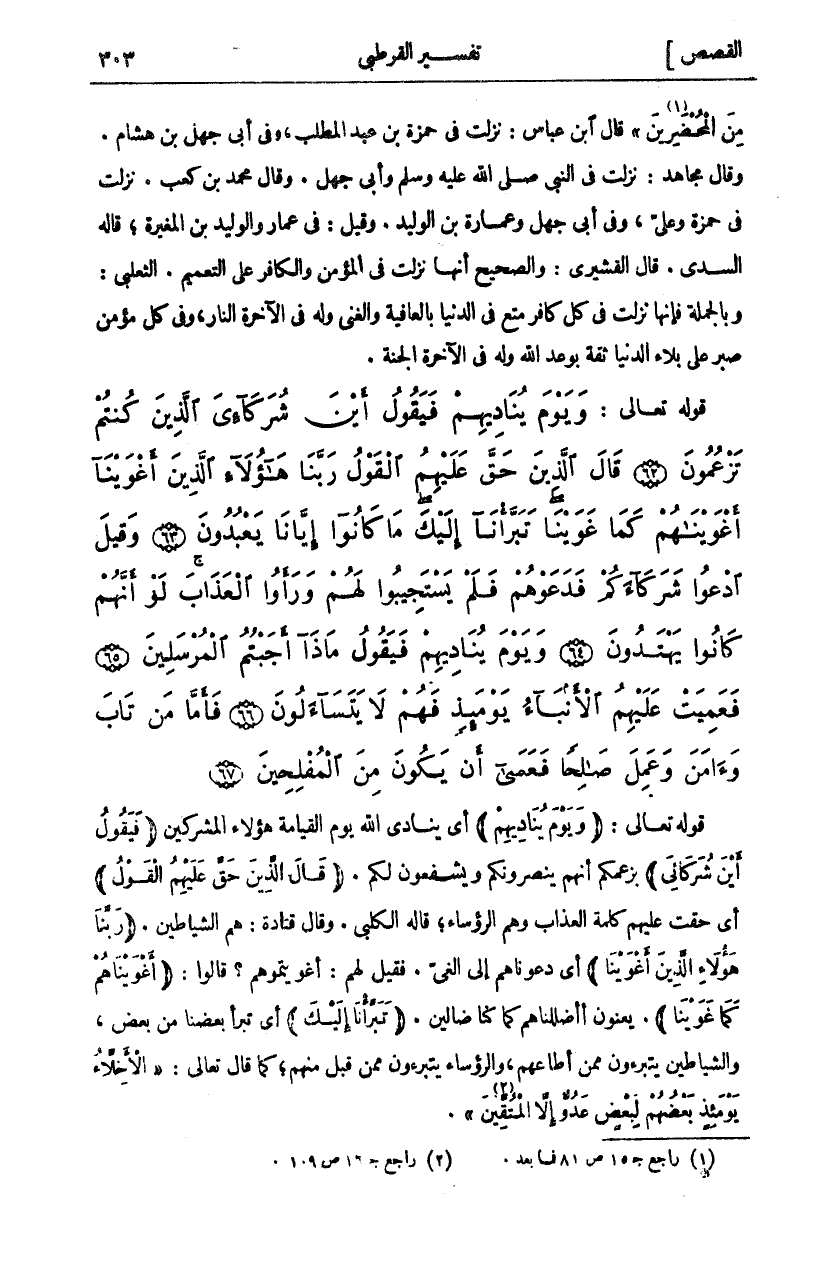 قَوْلُهُ تَعَالَى: (وَيَوْمَ يُنادِيهِمْ) أَيْ يُنَادِي اللَّهُ يَوْمَ الْقِيَامَةِ هَؤُلَاءِ الْمُشْرِكِينَ (فَيَقُولُ أَيْنَ شُرَكائِيَ) بِزَعْمِكُمْ أَنَّهُمْ يَنْصُرُونَكُمْ وَيَشْفَعُونَ لَكُمْ. (قالَ الَّذِينَ حَقَّ عَلَيْهِمُ الْقَوْلُ) أَيْ حَقَّتْ عَلَيْهِمْ كَلِمَةُ الْعَذَابِ وَهُمُ الرُّؤَسَاءُ، قَالَهُ الْكَلْبِيُّ. وَقَالَ قَتَادَةُ: هم الشياطين. (رَبَّنا هؤُلاءِ الَّذِينَ أَغْوَيْنا) أَيْ دَعَوْنَاهُمْ إِلَى الْغَيِّ. فَقِيلَ لَهُمْ: أَغْوَيْتُمُوهُمْ؟ قَالُوا: (أَغْوَيْناهُمْ كَما غَوَيْنا). يَعْنُونَ أَضْلَلْنَاهُمْ كَمَا كنا ضالين. (تَبَرَّأْنا إِلَيْكَ) أَيْ تَبَرَّأَ بَعْضُنَا مِنْ بَعْضٍ، وَالشَّيَاطِينُ يَتَبَرَّءُونَ مِمَّنْ أَطَاعَهُمْ، وَالرُّؤَسَاءُ يَتَبَرَّءُونَ مِمَّنْ قَبِلَ مِنْهُمْ، كَمَا قَالَ تَعَالَى:" الْأَخِلَّاءُ يَوْمَئِذٍ بَعْضُهُمْ لِبَعْضٍ عَدُوٌّ إِلَّا الْمُتَّقِينَ".