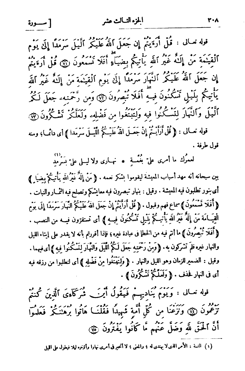 بَيَّنَ سُبْحَانَهُ أَنَّهُ مَهَّدَ أَسْبَابَ الْمَعِيشَةِ لِيَقُومُوا بِشُكْرِ نِعَمِهِ. (مَنْ إِلهٌ غَيْرُ اللَّهِ يَأْتِيكُمْ بِضِياءٍ) أَيْ بِنُورٍ تَطْلُبُونَ فِيهِ الْمَعِيشَةَ. وَقِيلَ: بِنَهَارٍ تُبْصِرُونَ فِيهِ مَعَايِشَكُمْ وَتَصْلُحُ فِيهِ الثِّمَارُ وَالنَّبَاتُ. (أَفَلا تَسْمَعُونَ) سَمَاعَ فَهْمٍ وَقَبُولٍ. (قُلْ أَرَأَيْتُمْ إِنْ جَعَلَ اللَّهُ عَلَيْكُمُ النَّهارَ سَرْمَداً إِلى يَوْمِ الْقِيامَةِ مَنْ إِلهٌ غَيْرُ اللَّهِ يَأْتِيكُمْ بِلَيْلٍ تَسْكُنُونَ فِيهِ) أَيْ تَسْتَقِرُّونَ فِيهِ مِنَ النَّصَبِ. (أَفَلا تُبْصِرُونَ) مَا أَنْتُمْ فِيهِ مِنَ الْخَطَإِ فِي عِبَادَةِ غَيْرِهِ، فَإِذَا أَقْرَرْتُمْ بِأَنَّهُ لَا يَقْدِرُ عَلَى إِيتَاءِ اللَّيْلِ وَالنَّهَارِ غَيْرُهُ فَلِمَ تُشْرِكُونَ بِهِ. (وَمِنْ رَحْمَتِهِ جَعَلَ لَكُمُ اللَّيْلَ وَالنَّهارَ لِتَسْكُنُوا فِيهِ) أَيْ فِيهِمَا. وَقِيلَ: الضَّمِيرُ لِلزَّمَانِ وَهُوَ اللَّيْلُ وَالنَّهَارُ. (وَلِتَبْتَغُوا مِنْ فَضْلِهِ) أَيْ لِتَطْلُبُوا مِنْ رِزْقِهِ فِيهِ أَيْ فِي النَّهَارِ فَحُذِفَ. (وَلَعَلَّكُمْ تَشْكُرُونَ) الله على ذلك.