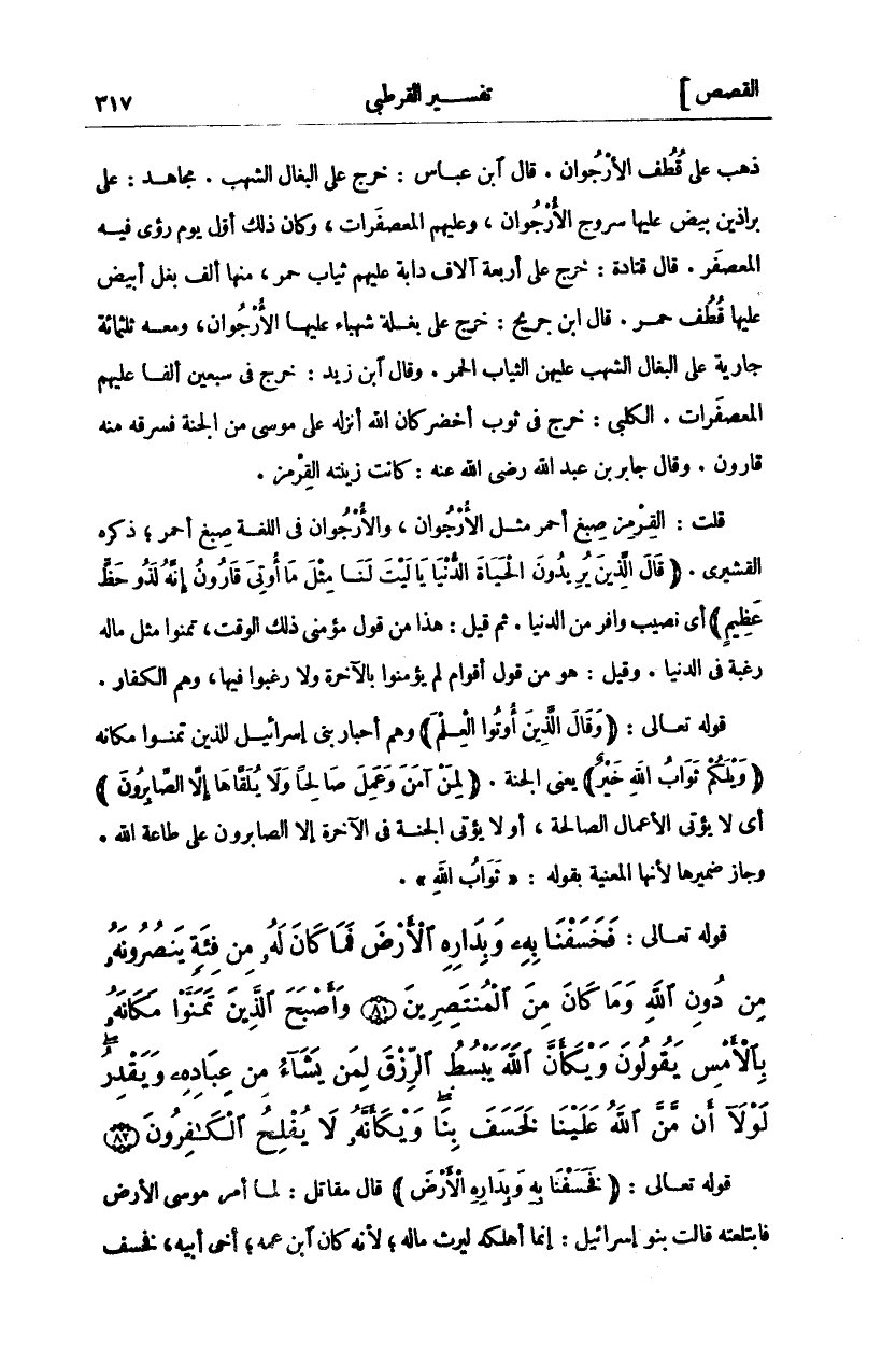 ذَهَبٍ عَلَى قُطُفِ الْأُرْجُوَانِ. قَالَ ابْنُ عَبَّاسٍ: خَرَجَ عَلَى الْبِغَالِ الشُّهُبِ. مُجَاهِدٌ: عَلَى بَرَاذِينَ بِيضٍ عَلَيْهَا سُرُوجُ الْأُرْجُوَانِ، وَعَلَيْهِمُ الْمُعَصْفَرَاتُ، وَكَانَ ذلك أول يوم رؤي فِيهِ الْمُعَصْفَرُ. قَالَ قَتَادَةُ: خَرَجَ عَلَى أَرْبَعَةِ آلَافِ دَابَّةٍ عَلَيْهِمْ ثِيَابٌ حُمْرٌ، مِنْهَا أَلْفُ بَغْلٍ أَبْيَضَ عَلَيْهَا قُطُفٌ حُمْرٌ. قَالَ ابْنُ جُرَيْجٍ: خَرَجَ عَلَى بَغْلَةٍ شَهْبَاءَ عَلَيْهَا الْأُرْجُوَانُ، وَمَعَهُ ثَلَاثُمِائَةِ جَارِيَةٍ عَلَى الْبِغَالِ الشُّهُبِ عَلَيْهِنَّ الثِّيَابُ الْحُمْرُ. وَقَالَ ابْنُ زَيْدٍ: خَرَجَ فِي سَبْعِينَ أَلْفًا عَلَيْهِمُ الْمُعَصْفَرَاتُ. الْكَلْبِيُّ: خَرَجَ فِي ثَوْبٍ أَخْضَرَ كَانَ اللَّهُ أَنْزَلَهُ عَلَى مُوسَى مِنَ الْجَنَّةِ فَسَرَقَهُ مِنْهُ قَارُونُ. وَقَالَ جَابِرُ بْنُ عَبْدِ اللَّهِ رَضِيَ اللَّهُ عَنْهُ: كَانَتْ زِينَتُهُ الْقِرْمِزَ. قُلْتُ: الْقِرْمِزُ صِبْغٌ أَحْمَرُ مِثْلُ الْأُرْجُوَانِ، وَالْأُرْجُوَانُ فِي اللُّغَةِ صِبْغٌ أَحْمَرُ، ذَكَرَهُ الْقُشَيْرِيُّ. (قالَ الَّذِينَ يُرِيدُونَ الْحَياةَ الدُّنْيا يَا لَيْتَ لَنا مِثْلَ مَا أُوتِيَ قارُونُ إِنَّهُ لَذُو حَظٍّ عَظِيمٍ) أَيْ نَصِيبٍ وَافِرٍ مِنَ الدُّنْيَا. ثُمَّ قِيلَ: هَذَا مِنْ قَوْلِ مُؤْمِنِي ذَلِكَ الْوَقْتِ، تَمَنَّوْا مِثْلَ مَالِهِ رَغْبَةً فِي الدُّنْيَا. وَقِيلَ: هُوَ مِنْ قَوْلِ أَقْوَامٍ لَمْ يُؤْمِنُوا بِالْآخِرَةِ وَلَا رَغِبُوا فِيهَا، وَهُمُ الْكُفَّارُ. قَوْلُهُ تَعَالَى: (وَقالَ الَّذِينَ أُوتُوا الْعِلْمَ) وهم أحبار بني إسرائيل لِلَّذِينَ تَمَنَّوْا مَكَانَهُ (وَيْلَكُمْ ثَوابُ اللَّهِ خَيْرٌ) يَعْنِي الْجَنَّةَ. (لِمَنْ آمَنَ وَعَمِلَ صالِحاً وَلا يُلَقَّاها إِلَّا الصَّابِرُونَ) أَيْ لَا يُؤْتَى الْأَعْمَالُ الصَّالِحَةُ، أَوْ لَا يُؤْتَى الْجَنَّةَ فِي الْآخِرَةِ إِلَّا الصَّابِرُونَ عَلَى طَاعَةِ اللَّهِ. وَجَازَ ضَمِيرُهَا لأنها المعنية بقوله:" ثَوابُ اللَّهِ".