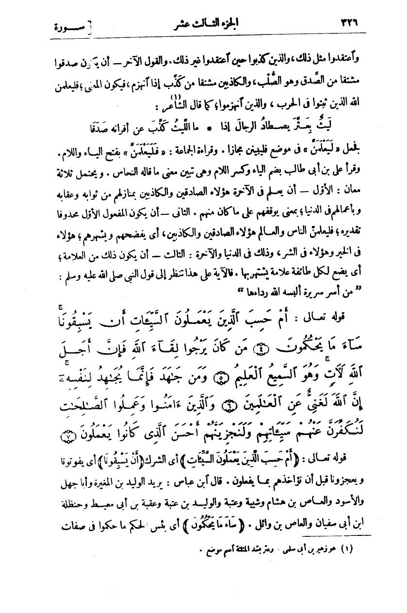 فَجَعَلَ" لَيَعْلَمَنَّ" فِي مَوْضِعِ فَلَيُبَيِّنَنَّ مَجَازًا. وَقِرَاءَةُ الْجَمَاعَةِ" فَلَيَعْلَمَنَّ" بِفَتْحِ الْيَاءِ وَاللَّامِ. وَقَرَأَ عَلِيُّ بْنُ أَبِي طَالِبٍ بِضَمِّ الْيَاءِ وَكَسْرِ اللَّامِ وَهِيَ تُبَيِّنُ مَعْنَى مَا قَالَهُ النَّحَّاسُ. وَيَحْتَمِلُ ثَلَاثَةَ مَعَانٍ: الْأَوَّلُ أَنْ يُعْلِمَ فِي الْآخِرَةِ هَؤُلَاءِ الصَّادِقِينَ وَالْكَاذِبِينَ بِمَنَازِلِهِمْ مِنْ ثَوَابِهِ وَعِقَابِهِ وَبِأَعْمَالِهِمْ فِي الدُّنْيَا، بِمَعْنَى يُوقِفُهُمْ عَلَى مَا كَانَ مِنْهُمْ. الثَّانِي أَنْ يَكُونَ الْمَفْعُولُ الْأَوَّلُ مَحْذُوفًا تَقْدِيرُهُ، فَلَيُعْلِمَنَّ النَّاسَ وَالْعَالَمَ هَؤُلَاءِ الصَّادِقِينَ وَالْكَاذِبِينَ، أَيْ يَفْضَحُهُمْ وَيُشْهِرُهُمْ، هَؤُلَاءِ فِي الْخَيْرِ وَهَؤُلَاءِ فِي الشَّرِّ، وَذَلِكَ فِي الدُّنْيَا وَالْآخِرَةِ. الثَّالِثُ أَنْ يَكُونَ ذَلِكَ مِنَ الْعَلَامَةِ، أَيْ يَضَعُ لِكُلِّ طَائِفَةٍ عَلَامَةً يَشْتَهِرُ بِهَا. فَالْآيَةُ عَلَى هَذَا تَنْظُرُ إِلَى قَوْلَ النَّبِيِّ صَلَّى اللَّهُ عَلَيْهِ وَسَلَّمَ:" مِنْ أسر سريرة ألبسه الله رداءها".