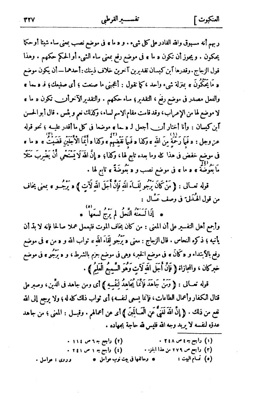 وَأَجْمَعَ أَهْلُ التَّفْسِيرِ عَلَى أَنَّ الْمَعْنَى: مَنْ كَانَ يَخَافُ الْمَوْتَ فَلْيَعْمَلْ عَمَلًا صَالِحًا فَإِنَّهُ لَا بُدَّ أَنْ يَأْتِيَهُ، ذَكَرَهُ النَّحَّاسُ. قَالَ الزجاج: معنى" يَرْجُوا لِقاءَ اللَّهِ" ثَوَابَ اللَّهِ وَ" مَنْ" فِي مَوْضِعِ رَفْعٍ بِالِابْتِدَاءِ وَ" كانَ" فِي مَوْضِعِ الْخَبَرِ، وَهِيَ فِي مَوْضِعِ جَزْمٍ بِالشَّرْطِ، وَ" يَرْجُوا" فِي مَوْضِعِ خَبَرِ كَانَ، وَالْمُجَازَاةُ (فَإِنَّ أَجَلَ اللَّهِ لَآتٍ وَهُوَ السَّمِيعُ الْعَلِيمُ). قَوْلُهُ تَعَالَى: (وَمَنْ جاهَدَ فَإِنَّما يُجاهِدُ لِنَفْسِهِ) أَيْ وَمَنْ جَاهَدَ فِي الدِّينِ، وَصَبَرَ عَلَى قِتَالِ الْكُفَّارِ وَأَعْمَالِ الطَّاعَاتِ، فَإِنَّمَا يَسْعَى لِنَفْسِهِ، أَيْ ثَوَابُ ذَلِكَ كُلِّهِ لَهُ، وَلَا يَرْجِعُ إِلَى اللَّهِ نَفْعٌ مِنْ ذَلِكَ. (إِنَّ اللَّهَ لَغَنِيٌّ عَنِ الْعالَمِينَ) أَيْ عَنْ أَعْمَالِهِمْ وَقِيلَ: الْمَعْنَى، مَنْ جَاهَدَ عَدُوَّهُ لِنَفْسِهِ لَا يُرِيدُ وَجْهَ اللَّهِ فليس لله حاجة بجهاده.