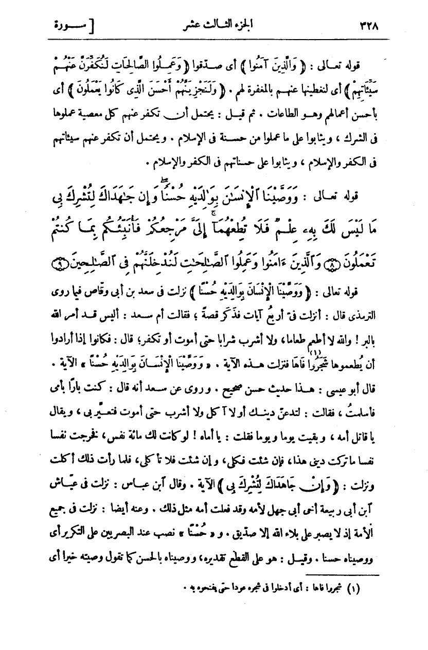 قَوْلُهُ تَعَالَى: (وَوَصَّيْنَا الْإِنْسانَ بِوالِدَيْهِ حُسْناً) نَزَلَتْ فِي سَعْدِ بْنِ أَبِي وَقَّاصٍ فِيمَا رَوَى التِّرْمِذِيُّ قَالَ: أُنْزِلَتْ فِيَّ أَرْبَعُ آيَاتٍ فَذَكَرَ قِصَّةً، فَقَالَتْ أُمُّ سَعْدٍ: أَلَيْسَ قَدْ أَمَرَ اللَّهُ بِالْبِرِّ! وَاللَّهِ لَا أَطْعَمُ طَعَامًا، وَلَا أَشْرَبُ شَرَابًا حَتَّى أَمُوتَ أَوْ تَكْفُرَ، قَالَ: فَكَانُوا إِذَا أَرَادُوا أَنْ يُطْعِمُوهَا شَجَرُوا «١» فَاهَا فَنَزَلَتْ هَذِهِ الْآيَةُ:" وَوَصَّيْنَا الْإِنْسانَ بِوالِدَيْهِ حُسْناً" الْآيَةَ قَالَ أَبُو عِيسَى: هَذَا حَدِيثٌ حَسَنٌ صَحِيحٌ. وَرُوِيَ عَنْ سَعْدٍ أَنَّهُ قَالَ: كُنْتُ بَارًّا بِأُمِّي فَأَسْلَمْتُ، فَقَالَتْ: لَتَدَعَنَّ دِينَكَ أَوْ لَا آكُلُ وَلَا أَشْرَبُ حَتَّى أَمُوتَ فَتُعَيَّرُ بِي، وَيُقَالُ يَا قَاتِلَ أُمِّهِ، وَبَقِيَتْ يَوْمًا وَيَوْمًا فَقُلْتُ: يَا أُمَّاهُ! لَوْ كَانَتْ لَكِ مِائَةُ نَفْسٍ، فَخَرَجَتْ نَفْسًا نَفْسًا مَا تَرَكْتُ دِينِي هَذَا فَإِنْ شِئْتِ فَكُلِي، وَإِنْ شِئْتِ فَلَا تَأْكُلِي، فَلَمَّا رَأَتْ ذَلِكَ أَكَلَتْ وَنَزَلَتْ: (وَإِنْ جاهَداكَ لِتُشْرِكَ بِي) الْآيَةَ. وَقَالَ ابْنُ عَبَّاسٍ: نَزَلَتْ فِي عَيَّاشِ بْنِ أَبِي رَبِيعَةَ أَخِي أَبِي جَهْلٍ لِأُمِّهِ وَقَدْ فَعَلَتْ أُمُّهُ مِثْلَ ذَلِكَ. وَعَنْهُ أَيْضًا: نَزَلَتْ فِي جَمِيعِ الْأُمَّةِ إِذْ لَا يَصْبِرُ عَلَى بَلَاءِ اللَّهِ إِلَّا صِدِّيقٌ. وَ" حُسْناً" نُصِبَ عِنْدَ الْبَصْرِيِّينَ عَلَى التَّكْرِيرِ أَيْ وَوَصَّيْنَاهُ حُسْنًا. وَقِيلَ: هُوَ عَلَى الْقَطْعِ تَقْدِيرُهُ وَوَصَّيْنَاهُ بِالْحُسْنِ كَمَا تَقُولُ وصيته خيرا أي