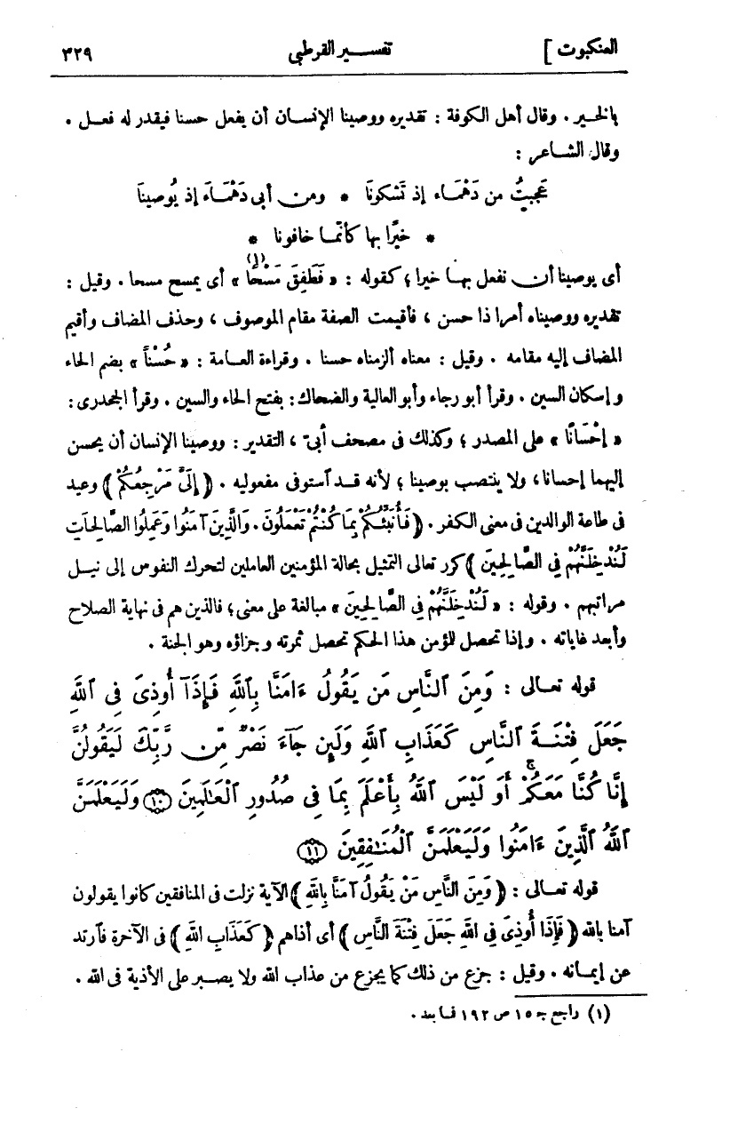 أَيْ يُوصِينَا أَنْ نَفْعَلَ بِهَا خَيْرًا، كَقَوْلِهِ:" فَطَفِقَ مَسْحاً" أَيْ يَمْسَحُ مَسْحًا. وَقِيلَ: تَقْدِيرُهُ وَوَصَّيْنَاهُ أَمْرًا ذَا حُسْنٍ، فَأُقِيمَتِ الصِّفَةُ مَقَامَ الْمَوْصُوفِ، وَحُذِفَ الْمُضَافُ وَأُقِيمَ الْمُضَافُ إِلَيْهِ مَقَامَهُ. وَقِيلَ: مَعْنَاهُ أَلْزَمْنَاهُ حُسْنًا. وَقِرَاءَةُ الْعَامَّةِ" حُسْناً" بضم الحاء وإسكان السين. وقراء أَبُو رَجَاءٍ وَأَبُو الْعَالِيَةِ وَالضَّحَّاكُ بِفَتْحِ الْحَاءِ وَالسِّينِ. وَقَرَأَ الْجَحْدَرِيُّ." إِحْسَانًا" عَلَى الْمَصْدَرِ، وَكَذَلِكَ فِي مُصْحَفِ أُبَيٍّ، التَّقْدِيرُ: وَوَصَّيْنَا الْإِنْسَانَ أَنْ يحسن إليهما إحسانا، ولا ينتصب بوصينا، لِأَنَّهُ قَدِ اسْتَوْفَى مَفْعُولَيْهِ. (إِلَيَّ مَرْجِعُكُمْ) وَعِيدٌ فِي طَاعَةِ الْوَالِدَيْنِ فِي مَعْنَى الْكُفْرِ. (فَأُنَبِّئُكُمْ بِما كُنْتُمْ تَعْمَلُونَ. وَالَّذِينَ آمَنُوا وَعَمِلُوا الصَّالِحاتِ لَنُدْخِلَنَّهُمْ فِي الصَّالِحِينَ) كَرَّرَ تَعَالَى التَّمْثِيلَ بِحَالَةِ المؤمنين العاملين لتحرك النُّفُوسَ إِلَى نَيْلِ مَرَاتِبِهِمْ. وَقَوْلُهُ:" لَنُدْخِلَنَّهُمْ فِي الصَّالِحِينَ" مُبَالَغَةٌ عَلَى مَعْنَى، فَالَّذِينَ هُمْ فِي نِهَايَةِ الصَّلَاحِ وَأَبْعَدُ غَايَاتِهِ. وَإِذَا تَحَصَّلَ لِلْمُؤْمِنِ هَذَا الْحُكْمُ تَحْصُلُ ثَمَرَتُهُ وَجَزَاؤُهُ وَهُوَ الْجَنَّةُ.