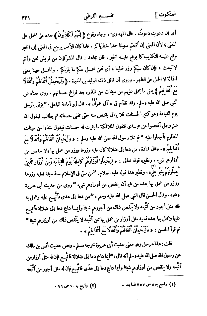 أَيْ إِنْ دَعَوْتِ دَعَوْتُ. قَالَ الْمَهْدَوِيُّ: وَجَاءَ وُقُوعُ" إِنَّهُمْ لَكَاذِبُونَ" بَعْدَهُ عَلَى الْحَمْلِ عَلَى الْمَعْنَى، لِأَنَّ الْمَعْنَى إِنِ اتَّبَعْتُمْ سَبِيلَنَا حَمَلْنَا خَطَايَاكُمْ. فَلَمَّا كَانَ الْأَمْرُ يَرْجِعُ فِي الْمَعْنَى إِلَى الْخَبَرِ وَقَعَ عَلَيْهِ التَّكْذِيبُ كَمَا يُوقَعُ عَلَيْهِ الْخَبَرُ. قَالَ مُجَاهِدٌ: قَالَ الْمُشْرِكُونَ مِنْ قُرَيْشٍ نَحْنُ وَأَنْتُمْ لَا نُبْعَثُ، فَإِنْ كَانَ عَلَيْكُمْ وِزْرٌ فَعَلَيْنَا، أَيْ نَحْنُ نَحْمِلُ عَنْكُمْ ما يلزمكم. والحمل هاهنا بمعنى الحمالة لَا الْحَمْلُ عَلَى الظَّهْرِ. وَرُوِيَ أَنَّ قَائِلَ ذَلِكَ الْوَلِيدُ بْنُ الْمُغِيرَةِ. (وَلَيَحْمِلُنَّ أَثْقالَهُمْ وَأَثْقالًا مَعَ أَثْقالِهِمْ) يَعْنِي مَا يُحْمَلُ عَلَيْهِمْ مِنْ سَيِّئَاتِ مَنْ ظَلَمُوهُ بَعْدَ فَرَاغِ حَسَنَاتِهِمْ. رُوِيَ مَعْنَاهُ عَنِ النَّبِيِّ صَلَّى اللَّهُ عَلَيْهِ وَسَلَّمَ وَقَدْ تَقَدَّمَ فِي" آلِ عِمْرَانَ" «١». قَالَ أَبُو أمامة الباهلي:" يؤتى الرجل يَوْمَ الْقِيَامَةِ وَهُوَ كَثِيرُ الْحَسَنَاتِ فَلَا يَزَالُ يُقْتَصُّ مِنْهُ حَتَّى تَفْنَى حَسَنَاتُهُ ثُمَّ يُطَالَبُ فَيَقُولُ اللَّهُ عَزَّ وَجَلَّ اقْتَصُّوا مِنْ عَبْدِي فَتَقُولُ الْمَلَائِكَةُ مَا بَقِيَتْ لَهُ حَسَنَاتٌ فَيَقُولُ خُذُوا مِنْ سَيِّئَاتِ الْمَظْلُومِ فَاجْعَلُوا عَلَيْهِ" ثُمَّ تَلَا رَسُولُ اللَّهِ صَلَّى اللَّهُ عَلَيْهِ وَسَلَّمَ" وَلَيَحْمِلُنَّ أَثْقالَهُمْ وَأَثْقالًا مَعَ أَثْقالِهِمْ" وَقَالَ قَتَادَةُ: مَنْ دَعَا إِلَى ضَلَالَةٍ كَانَ عَلَيْهِ وِزْرُهَا وَوِزْرُ مَنْ عَمِلَ بِهَا وَلَا يُنْقَصُ مِنْ أوزارهم شي. وَنَظِيرُهُ قَوْلُهُ تَعَالَى:" لِيَحْمِلُوا أَوْزارَهُمْ كامِلَةً يَوْمَ الْقِيامَةِ وَمِنْ أَوْزارِ الَّذِينَ يُضِلُّونَهُمْ بِغَيْرِ عِلْمٍ". وَنَظِيرُ هَذَا قَوْلُهُ عَلَيْهِ السَّلَامُ:" مَنْ سَنَّ فِي الْإِسْلَامِ سُنَّةً سَيِّئَةً فَعَلَيْهِ وِزْرُهَا وَوِزْرُ مَنْ عَمِلَ بِهَا بَعْدَهُ مِنْ غَيْرِ أَنْ ينقص من أوزار هم شي" رُوِيَ مِنْ حَدِيثِ أَبِي هُرَيْرَةَ وَغَيْرِهِ. وَقَالَ الْحَسَنُ قَالَ النَّبِيُّ صَلَّى اللَّهُ عَلَيْهِ وَسَلَّمَ:" مَنْ دَعَا إِلَى هُدًى فَاتُّبِعَ عَلَيْهِ وَعُمِلَ بِهِ فَلَهُ مِثْلَ أُجُورِ مَنِ اتَّبَعَهُ وَلَا يُنْقِصُ ذَلِكَ مِنْ أُجُورِهِمْ شَيْئًا وَأَيُّمَا دَاعٍ دَعَا إِلَى ضَلَالَةٍ فَاتُّبِعَ عَلَيْهَا وَعُمِلَ بِهَا بَعْدَهُ فَعَلَيْهِ مِثْلُ أَوْزَارِ مَنْ عَمِلَ بِهَا مِمَّنِ اتَّبَعَهُ لَا يُنْقِصُ ذَلِكَ مِنْ أَوْزَارِهِمْ شيئا" ثم قرأ الحسن" وليحملن أثقالهم وأثقالا مع أثقالهم". قُلْتُ: هَذَا مُرْسَلٌ وَهُوَ مَعْنَى حَدِيثِ أَبِي هُرَيْرَةَ خَرَّجَهُ مُسْلِمٌ. وَنَصُّ حَدِيثِ أَنَسُ بْنُ مَالِكٍ عَنْ رَسُولِ اللَّهِ صَلَّى اللَّهُ عَلَيْهِ وَسَلَّمَ أَنَّهُ قَالَ:" أَيُّمَا دَاعٍ دَعَا إِلَى ضَلَالَةٍ فَاتُّبِعَ فَإِنَّ لَهُ مِثْلَ أَوْزَارِ مَنِ اتبعه ولا ينقص من أوزارهم شَيْئًا وَأَيُّمَا دَاعٍ دَعَا إِلَى هُدًى فَاتُّبِعَ فإن له مثل أجور من اتبعه