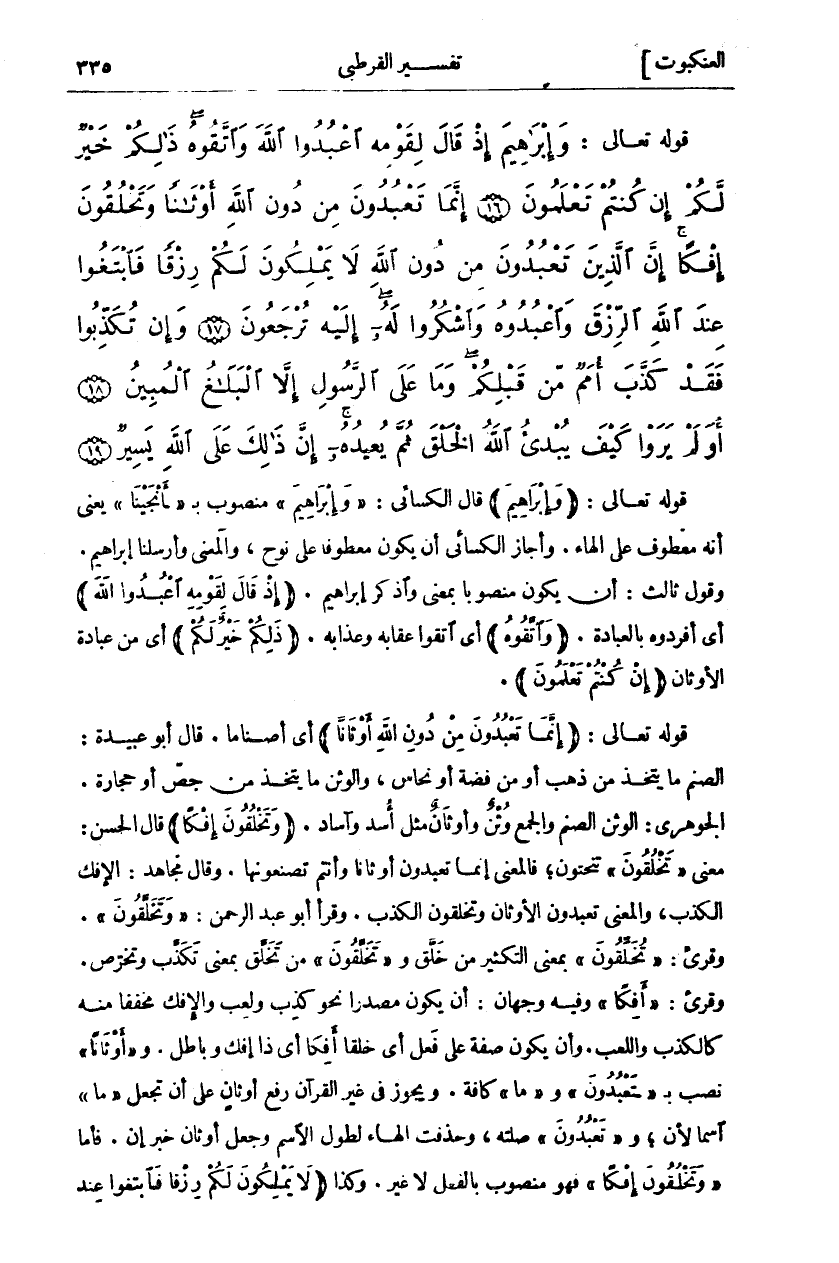 قَوْلُهُ تَعَالَى: (وَإِبْراهِيمَ) قَالَ الْكِسَائِيُّ:" وَإِبْراهِيمَ" مَنْصُوبٌ بِ (أَنْجَيْنَا) يَعْنِي أَنَّهُ مَعْطُوفٌ عَلَى الْهَاءِ. وَأَجَازَ الْكِسَائِيُّ أَنْ يَكُونَ مَعْطُوفًا عَلَى نُوحٍ وَالْمَعْنَى وَأَرْسَلْنَا إِبْرَاهِيمَ. وَقَوْلٌ ثَالِثٌ: أَنْ يَكُونَ مَنْصُوبًا بِمَعْنَى وَاذْكُرْ إِبْرَاهِيمَ. (إِذْ قالَ لِقَوْمِهِ اعْبُدُوا اللَّهَ) أَيْ أَفْرِدُوهُ بِالْعِبَادَةِ. (وَاتَّقُوهُ) أَيِ اتَّقُوا عِقَابَةَ وَعَذَابَهُ. (ذلِكُمْ خَيْرٌ لَكُمْ) أَيْ مِنْ عِبَادَةِ الْأَوْثَانِ (إِنْ كُنْتُمْ تَعْلَمُونَ). قَوْلُهُ تَعَالَى: (إِنَّما تَعْبُدُونَ مِنْ دُونِ اللَّهِ أَوْثاناً) أَيْ أَصْنَامًا. قَالَ أَبُو عُبَيْدَةَ: الصَّنَمُ مَا يُتَّخَذُ مِنْ ذَهَبٍ أَوْ فِضَّةٍ أَوْ نُحَاسِ، وَالْوَثَنُ مَا يُتَّخَذُ مِنْ جِصٍّ أَوْ حِجَارَةٍ. الْجَوْهَرِيُّ: الْوَثَنُ الصَّنَمُ وَالْجَمْعُ وُثْنٌ وَأَوْثَانٌ مِثْلُ أُسْدِ وَآسَادٍ. (وَتَخْلُقُونَ إِفْكاً) قَالَ الْحَسَنُ: مَعْنَى" تَخْلُقُونَ" تَنْحِتُونَ، فَالْمَعْنَى إِنَّمَا تَعْبُدُونَ أَوْثَانًا وَأَنْتُمْ تَصْنَعُونَهَا. وَقَالَ مُجَاهِدٌ: الْإِفْكُ الْكَذِبُ، وَالْمَعْنَى تَعْبُدُونَ الْأَوْثَانَ وَتَخْلُقُونَ الْكَذِبَ. وَقَرَأَ أبو عبد الرحمن:" وتخلقون". وقرى" تُخَلِّقُونَ" بِمَعْنَى التَّكْثِيرِ مِنْ خَلَّقَ وَ" تَخَلَّقُونَ" من تخلق بمعنى تكذب وتخرص. وقرى" أَفِكًا" وَفِيهِ وَجْهَانِ: أَنْ يَكُونَ مَصْدَرًا نَحْوَ كَذِبِ وَلَعِبِ وَالْإِفْكُ مُخَفَّفًا مِنْهُ كَالْكَذِبِ وَاللَّعِبِ. وَأَنْ يَكُونَ صِفَةً عَلَى فِعْلٍ أَيْ خَلْقًا أَفِكًا أَيْ ذَا إِفْكٍ وَبَاطِلٍ. وَ" أَوْثاناً" نُصِبَ بِ" تَعْبُدُونَ" وَ" مَا" كَافَّةٌ. وَيَجُوزُ فِي غَيْرِ الْقُرْآنِ رَفْعُ أَوْثَانٍ عَلَى أَنْ تُجْعَلَ" مَا" اسْمًا لِأَنَّ" تَعْبُدُونَ" صِلَتُهُ، وَحُذِفَتِ الهاء لطول الاسم وجعل أوثان خَبَرَ إِنَّ. فَأَمَّا" وَتَخْلُقُونَ إِفْكاً" فَهُوَ مَنْصُوبٌ بِالْفِعْلِ لَا غَيْرُ. وَكَذَا (لَا يَمْلِكُونَ لَكُمْ رِزْقاً فَابْتَغُوا عِنْدَ