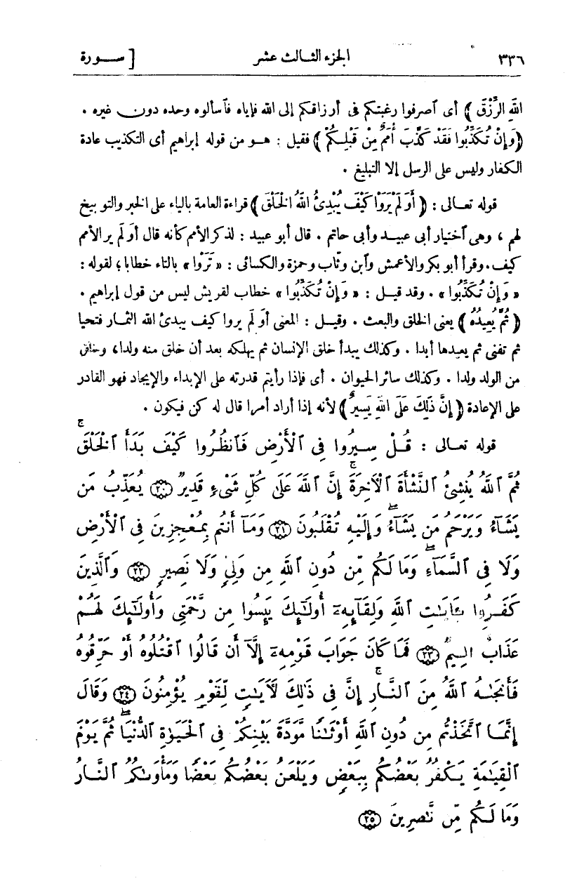 أَيْ اصْرِفُوا رَغْبَتَكُمْ فِي أَرْزَاقِكُمْ إِلَى اللَّهِ فَإِيَّاهُ فَاسْأَلُوهُ وَحْدَهُ دُونَ غَيْرِهِ. (وَإِنْ تُكَذِّبُوا فَقَدْ كَذَّبَ أُمَمٌ مِنْ قَبْلِكُمْ) فقيل: هو من قوله إِبْرَاهِيمَ أَيْ التَّكْذِيبُ عَادَةُ الْكُفَّارِ وَلَيْسَ عَلَى الرُّسُلِ إِلَّا التَّبْلِيغُ. قَوْلُهُ تَعَالَى: (أَوَلَمْ يَرَوْا كَيْفَ يُبْدِئُ اللَّهُ الْخَلْقَ) قِرَاءَةُ الْعَامَّةِ بِالْيَاءِ عَلَى الْخَبَرِ وَالتَّوْبِيخِ لَهُمْ، وَهِيَ اخْتِيَارُ أَبِي عُبَيْدٍ وَأَبِي حَاتِمٍ. قَالَ أَبُو عُبَيْدٍ: لِذِكْرِ الأمم كأنه قال أو لم يَرَ الْأُمَمُ كَيْفَ. وَقَرَأَ أَبُو بَكْرٍ وَالْأَعْمَشُ وَابْنُ وَثَّابٍ وَحَمْزَةُ وَالْكِسَائِيُّ:" تَرَوْا" بِالتَّاءِ خِطَابًا، لقول:" وَإِنْ تُكَذِّبُوا". وَقَدْ قِيلَ:" وَإِنْ تُكَذِّبُوا" خِطَابٌ لِقُرَيْشٍ لَيْسَ مِنْ قَوْلِ إِبْرَاهِيمَ. (ثُمَّ يُعِيدُهُ) يعني الخلق والبعث. وقيل: المعنى أو لم يَرَوْا كَيْفَ يُبْدِئُ اللَّهُ الثِّمَارَ فَتَحْيَا ثُمَّ تفني ثم بعيدها أبدا. وكذلك يبدأ خلق والإنسان ثُمَّ يُهْلِكُهُ بَعْدَ أَنْ خَلَقَ مِنْهُ وَلَدًا، وَخَلَقَ مِنَ الْوَلَدِ وَلَدًا. وَكَذَلِكَ سَائِرُ الْحَيَوَانِ. أَيْ فَإِذَا رَأَيْتُمْ قُدْرَتَهُ عَلَى الْإِبْدَاءِ وَالْإِيجَادِ فَهُوَ الْقَادِرُ عَلَى الْإِعَادَةِ (إِنَّ ذلِكَ عَلَى اللَّهِ يَسِيرٌ) لِأَنَّهُ إِذَا أَرَادَ أَمْرًا قَالَ له كن فيكون.