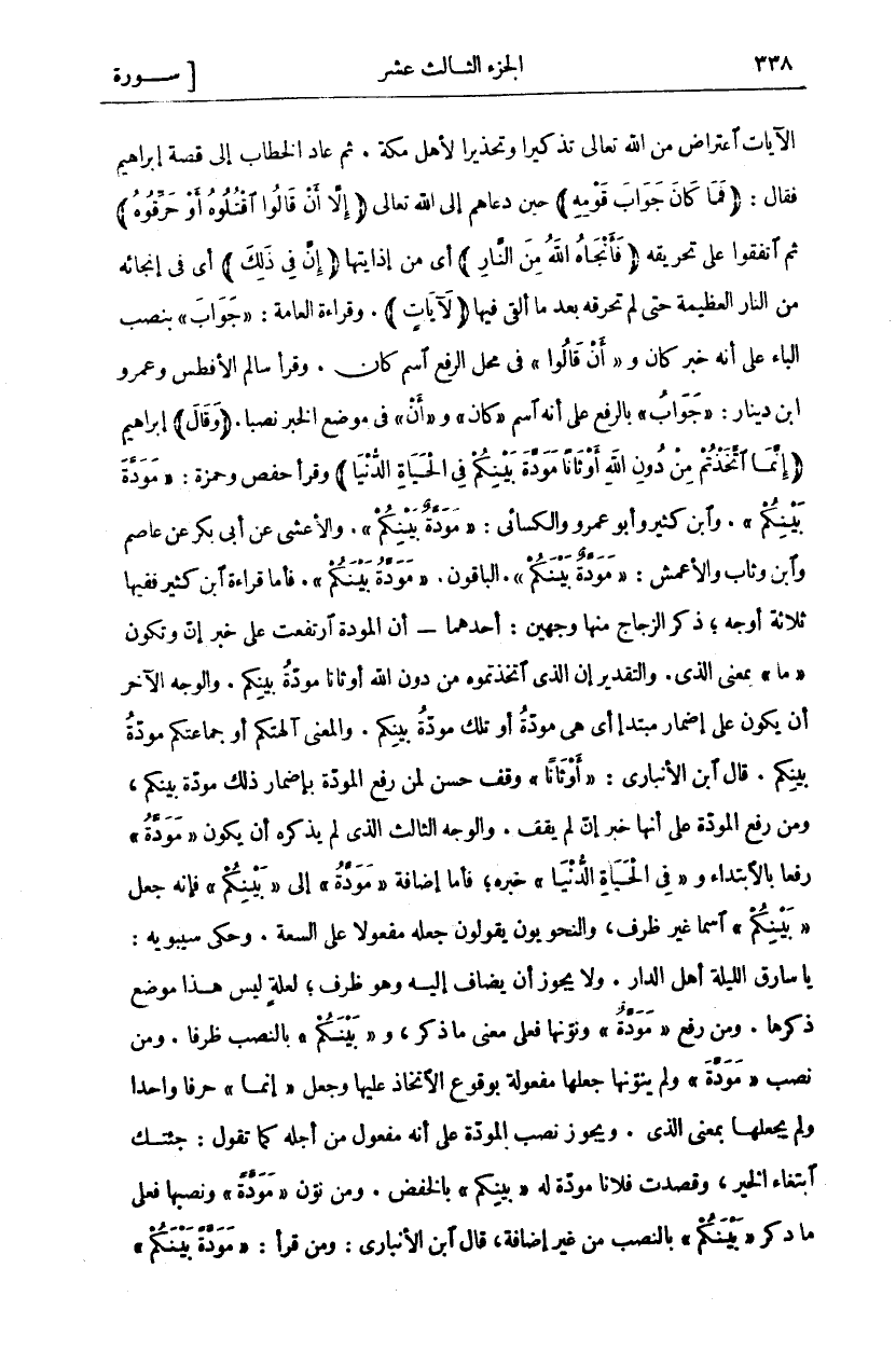 الْآيَاتُ اعْتِرَاضٌ مِنَ اللَّهِ تَعَالَى تَذْكِيرًا وَتَحْذِيرًا لِأَهْلِ مَكَّةَ. ثُمَّ عَادَ الْخِطَابُ إِلَى قِصَّةِ إِبْرَاهِيمَ فَقَالَ: (فَما كانَ جَوابَ قَوْمِهِ) حِينَ دَعَاهُمْ إِلَى اللَّهِ تَعَالَى (إِلَّا أَنْ قالُوا اقْتُلُوهُ أَوْ حَرِّقُوهُ) ثُمَّ اتَّفَقُوا عَلَى تَحْرِيقِهِ (فَأَنْجاهُ اللَّهُ مِنَ النَّارِ) أَيْ مِنْ إِذَايَتِهَا (إِنَّ فِي ذلِكَ) أَيْ فِي إِنْجَائِهِ مِنَ النَّارِ الْعَظِيمَةِ حَتَّى لَمْ تُحْرِقْهُ بَعْدَ مَا أُلْقِيَ فِيهَا (لَآياتٍ). وَقِرَاءَةُ الْعَامَّةِ" جَوابَ" بِنَصْبِ الْبَاءِ عَلَى أَنَّهُ خَبَرُ كَانَ وَ" أَنْ قالُوا" فِي مَحَلِّ الرَّفْعِ اسْمُ كَانَ. وَقَرَأَ سالم الأفطس وعمرو ابن دِينَارٍ:" جَوَابُ" بِالرَّفْعِ عَلَى أَنَّهُ اسْمُ" كانَ" وَ" إِنَّ" فِي مَوْضِعِ الْخَبَرِ نَصْبًا. (وَقالَ) إِبْرَاهِيمُ (إِنَّمَا اتَّخَذْتُمْ مِنْ دُونِ اللَّهِ أَوْثاناً مَوَدَّةَ بَيْنِكُمْ فِي الْحَياةِ الدُّنْيا) وَقَرَأَ حَفْصٌ وَحَمْزَةُ:" مَوَدَّةَ بَيْنِكُمْ". وَابْنُ كَثِيرٍ وَأَبُو عَمْرٍو وَالْكِسَائِيُّ:" مَوَدَّةُ بَيْنِكُمْ". وَالْأَعْشَى عَنْ أَبِي بَكْرٍ عَنْ عَاصِمٍ وَابْنِ وَثَّابٍ وَالْأَعْمَشِ" مَوَدَّةٌ بَيْنَكُمْ". الْبَاقُونَ" مَوَدَّةُ بَيْنَكُمْ" فَأَمَّا قِرَاءَةُ ابْنُ كَثِيرٍ فَفِيهَا ثَلَاثَةُ أَوْجُهٍ، ذَكَرَ الزَّجَّاجُ مِنْهَا وَجْهَيْنِ: أَحَدُهُمَا- أَنَّ الْمَوَدَّةَ ارْتَفَعَتْ عَلَى خَبَرِ إِنَّ وَتَكُونُ" مَا" بِمَعْنَى الَّذِي. وَالتَّقْدِيرُ إِنَّ الَّذِي اتَّخَذْتُمُوهُ مِنْ دُونِ اللَّهِ أَوْثَانًا مَوَدَّةُ بَيْنِكُمْ. وَالْوَجْهُ الْآخَرُ أَنْ يَكُونَ عَلَى إِضْمَارِ مُبْتَدَأٍ أَيْ وَهِيَ مَوَدَّةٌ أَوْ تِلْكَ مَوَدَّةُ بَيْنِكُمْ. وَالْمَعْنَى آلِهَتُكُمْ أَوْ جَمَاعَتُكُمْ مَوَدَّةُ بَيْنِكُمْ. قَالَ ابْنُ الْأَنْبَارِيِّ:" أَوْثاناً" وَقْفٌ حَسَنٌ لِمَنْ رَفَعَ الْمَوَدَّةَ بِإِضْمَارِ ذَلِكَ مَوَدَّةُ بَيْنِكُمْ، وَمَنْ رَفَعَ الْمَوَدَّةَ عَلَى أَنَّهَا خَبَرُ إِنَّ لَمْ يَقِفْ. وَالْوَجْهُ الثَّالِثُ الَّذِي لَمْ يَذْكُرْهُ أَنْ يَكُونَ" مَوَدَّةُ" رَفْعًا بِالِابْتِدَاءِ وَ" فِي الْحَياةِ الدُّنْيا" خَبَرُهُ، فَأَمَّا إِضَافَةُ" مَوَدَّةَ" إِلَى" بَيْنِكُمْ" فَإِنَّهُ جَعَلَ" بَيْنِكُمْ" اسْمًا غَيْرَ ظَرْفٍ، وَالنَّحْوِيُّونَ يَقُولُونَ جَعَلَهُ مَفْعُولًا عَلَى السَّعَةِ. وَحَكَى سِيبَوَيْهِ: يَا سَارِقَ اللَّيْلَةَ أَهْلَ الدَّارِ. وَلَا يَجُوزُ أَنْ يُضَافَ إِلَيْهِ وَهُوَ ظَرْفٌ، لَعِلَّةٍ لَيْسَ هَذَا مَوْضِعَ ذِكْرِهَا. وَمَنْ رَفَعَ" مَوَدَّةٌ" وَنَوَّنَهَا فَعَلَى مَعْنَى مَا ذُكِرَ، وَ" بَيْنِكُمْ" بِالنَّصْبِ ظَرْفًا. وَمَنْ نَصَبَ" مَوَدَّةَ" وَلَمْ يُنَوِّنْهَا جَعَلَهَا مَفْعُولَةً بِوُقُوعِ الِاتِّخَاذِ عَلَيْهَا وَجَعَلَ" إِنَّمَا" حَرْفًا وَاحِدًا وَلَمْ يَجْعَلْهَا بِمَعْنَى الَّذِي. وَيَجُوزُ نَصْبُ الْمَوَدَّةِ عَلَى أَنَّهُ مَفْعُولٌ مِنْ أَجْلِهِ كَمَا تَقُولُ