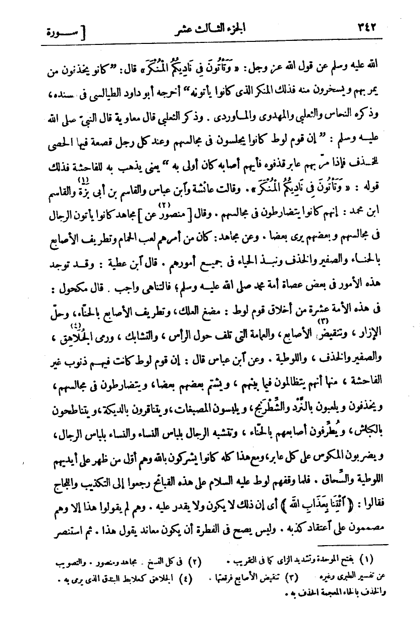 اللَّهُ عَلَيْهِ وَسَلَّمَ عَنْ قَوْلِ اللَّهِ عَزَّ وَجَلَّ:" وَتَأْتُونَ فِي نادِيكُمُ الْمُنْكَرَ" قَالَ" كَانُوا يَخْذِفُونَ مَنْ يَمُرُّ بِهِمْ وَيَسْخَرُونَ مِنْهُ فَذَلِكَ الْمُنْكَرُ الَّذِي كَانُوا يَأْتُونَهُ" أَخْرَجَهُ أَبُو دَاوُدَ الطَّيَالِسِيُّ فِي مُسْنَدِهِ، وَذَكَرَهُ النَّحَّاسُ وَالثَّعْلَبِيُّ وَالْمَهْدَوِيُّ وَالْمَاوَرْدِيُّ. وَذَكَرَ الثَّعْلَبِيُّ قَالَ مُعَاوِيَةُ قَالَ النَّبِيُّ صَلَّى اللَّهُ عَلَيْهِ وَسَلَّمَ:" إِنَّ قَوْمَ لُوطٍ كَانُوا يَجْلِسُونَ فِي مَجَالِسِهِمْ وَعِنْدَ كُلِّ رَجُلٍ قَصْعَةٌ فِيهَا الْحَصَى لِلْخَذْفِ فَإِذَا مَرَّ بِهِمْ عَابِرٌ قَذَفُوهُ فَأَيُّهُمْ أَصَابَهُ كَانَ أَوْلَى بِهِ" يَعْنِي يَذْهَبُ بِهِ لِلْفَاحِشَةِ فَذَلِكَ قَوْلُهُ:" وَتَأْتُونَ فِي نادِيكُمُ الْمُنْكَرَ". وَقَالَتْ عَائِشَةُ وَابْنُ عَبَّاسٍ والقاسم بن أبي بزة «١» والقاسم ابن مُحَمَّدٍ: إِنَّهُمْ كَانُوا يَتَضَارَطُونَ فِي مَجَالِسِهِمْ. وَقَالَ [مَنْصُورٌ عَنْ «٢»] مُجَاهِدٍ كَانُوا يَأْتُونَ الرِّجَالَ فِي مَجَالِسِهِمْ وَبَعْضُهُمْ يَرَى بَعْضًا. وَعَنْ مُجَاهِدٍ: كَانَ مِنْ أَمْرِهِمْ لَعِبُ الْحَمَامِ وَتَطْرِيفُ الْأَصَابِعِ بِالْحِنَّاءِ وَالصَّفِيرُ وَالْخَذْفُ وَنَبْذُ الْحَيَاءِ فِي جَمِيعِ أُمُورِهِمْ. قَالَ ابْنُ عَطِيَّةَ: وَقَدْ تُوجَدُ هَذِهِ الْأُمُورُ فِي بَعْضِ عُصَاةِ أُمَّةِ مُحَمَّدٍ صَلَّى اللَّهُ عَلَيْهِ وَسَلَّمَ، فَالتَّنَاهِي وَاجِبٌ. قَالَ مَكْحُولٌ: فِي هَذِهِ الْأُمَّةِ عَشَرَةٌ مِنْ أَخْلَاقِ قَوْمِ لُوطٍ: مَضْغُ الْعِلْكِ وَتَطْرِيفُ الْأَصَابِعِ بِالْحِنَّاءِ، وَحَلُّ الْإِزَارِ، وَتَنْقِيضُ «٣» الْأَصَابِعِ، وَالْعِمَامَةُ الَّتِي تُلَفُّ حَوْلَ الرَّأْسِ، وَالتَّشَابُكُ، وَرَمْيُ الْجُلَاهِقِ، «٤» وَالصَّفِيرُ، وَالْخَذْفُ، وَاللُّوطِيَّةُ. وَعَنِ ابْنِ عَبَّاسٍ قَالَ: إِنَّ قَوْمَ لُوطٍ كَانَتْ فِيهِمْ ذُنُوبٌ غَيْرُ الْفَاحِشَةِ، مِنْهَا أَنَّهُمْ يَتَظَالَمُونَ فِيمَا بَيْنَهُمْ، وَيَشْتُمُ بَعْضُهُمْ بَعْضًا وَيَتَضَارَطُونَ فِي مَجَالِسِهِمْ، وَيَخْذِفُونَ وَيَلْعَبُونَ بِالنَّرْدِ وَالشِّطْرَنْجِ، وَيَلْبَسُونَ الْمُصَبَّغَاتِ، وَيَتَنَاقَرُونَ بِالدِّيَكَةِ، وَيَتَنَاطَحُونَ بِالْكِبَاشِ، وَيُطَرِّفُونَ أَصَابِعَهُمْ بِالْحِنَّاءِ، وَتَتَشَبَّهُ الرِّجَالُ بِلِبَاسِ النِّسَاءِ وَالنِّسَاءُ بِلِبَاسِ الرِّجَالِ، وَيَضْرِبُونَ الْمُكُوسَ عَلَى كُلِّ عَابِرٍ، وَمَعَ هَذَا كُلِّهِ كَانُوا يُشْرِكُونَ بِاللَّهِ، وَهُمْ أَوَّلُ مَنْ ظَهَرَ عَلَى أَيْدِيهِمُ اللُّوطِيَّةُ وَالسِّحَاقُ، فَلَمَّا وَقَّفَهُمْ لُوطٌ عَلَيْهِ السَّلَامُ عَلَى هَذِهِ الْقَبَائِحِ رَجَعُوا إِلَى التَّكْذِيبِ وَاللِّجَاجِ، فَقَالُوا: (ائْتِنا بِعَذابِ اللَّهِ) أَيْ إِنَّ ذَلِكَ لَا يَكُونُ وَلَا يَقْدِرُ عَلَيْهِ. وَهُمْ لَمْ يَقُولُوا هَذَا إِلَّا وَهُمْ مُصَمِّمُونَ عَلَى اعْتِقَادِ كَذِبِهِ. وَلَيْسَ يَصِحُّ فِي الْفِطْرَةِ أَنْ يَكُونَ مُعَانِدٌ يَقُولُ هَذَا ثُمَّ استنصر