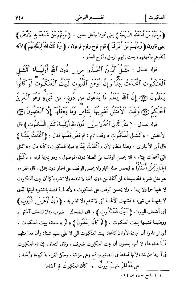 قَوْلُهُ تَعَالَى: (مَثَلُ الَّذِينَ اتَّخَذُوا مِنْ دُونِ اللَّهِ أَوْلِياءَ كَمَثَلِ الْعَنْكَبُوتِ) قَالَ الْأَخْفَشُ:" كَمَثَلِ الْعَنْكَبُوتِ" وَقْفٌ تَامٌّ، ثم قِصَّتَهَا فَقَالَ: (اتَّخَذَتْ بَيْتًا) قَالَ ابْنُ الْأَنْبَارِيِّ: وَهَذَا غَلَطٌ، لِأَنَّ" اتَّخَذَتْ بَيْتًا" صِلَةٌ لِلْعَنْكَبُوتِ، كَأَنَّهُ قَالَ: كَمَثَلِ الَّتِي اتَّخَذَتْ بَيْتًا، فَلَا يَحْسُنُ الْوَقْفُ عَلَى الصِّلَةِ دُونَ الْمَوْصُولِ، وَهُوَ بمنزلة قوله:" كَمَثَلِ الْحِمارِ يَحْمِلُ أَسْفاراً" فيحمل صِلَةٌ لِلْحِمَارِ وَلَا يَحْسُنُ الْوَقْفُ عَلَى الْحِمَارِ دُونَ يَحْمِلُ. قَالَ الْفَرَّاءُ: هُوَ مَثَلٌ ضَرَبَهُ اللَّهُ سُبْحَانَهُ لِمَنِ اتَّخَذَ مِنْ دُونِهِ آلِهَةً لَا تَنْفَعُهُ وَلَا تَضُرُّهُ، كَمَا أَنَّ بَيْتَ الْعَنْكَبُوتِ لَا يَقِيهَا حَرًّا وَلَا بَرْدًا. وَلَا يَحْسُنُ الْوَقْفُ عَلَى الْعَنْكَبُوتِ، لِأَنَّهُ لَمَّا قَصَدَ بالتشبيه لبيتها الذي لا يقيها من شي، فَشُبِّهَتِ الْآلِهَةُ الَّتِي لَا تَنْفَعُ وَلَا تَضُرُّ بِهِ. (وَإِنَّ أَوْهَنَ الْبُيُوتِ) أَيْ أَضْعَفَ الْبُيُوتِ (لَبَيْتُ الْعَنْكَبُوتِ). قَالَ الضَّحَّاكُ: ضَرَبَ مَثَلًا لِضَعْفِ آلِهَتِهِمْ وَوَهَنِهَا فَشَبَّهَهَا بِبَيْتِ الْعَنْكَبُوتِ. (لَوْ كَانُوا يعلمون) " لو" متعلقه ببيت الْعَنْكَبُوتِ. أَيْ لَوْ عَلِمُوا أَنَّ عِبَادَةَ الْأَوْثَانِ كَاتِّخَاذِ بَيْتِ الْعَنْكَبُوتِ الَّتِي لَا تُغْنِي عَنْهُمْ شيئا، وأن هذا مثلهم لما عبدوها، لا أنهم يَعْلَمُونَ أَنَّ بَيْتَ الْعَنْكَبُوتِ ضَعِيفٌ. وَقَالَ النُّحَاةُ: إِنَّ تَاءَ الْعَنْكَبُوتِ فِي آخِرِهَا مَزِيدَةٌ، لِأَنَّهَا تَسْقُطُ فِي التَّصْغِيرِ وَالْجَمْعِ وَهِيَ مُؤَنَّثَةٌ. وَحَكَى الْفَرَّاءُ تَذْكِيرَهَا وَأَنْشَدَ: