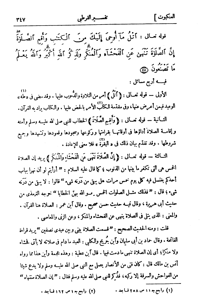 فِيهِ أَرْبَعُ مَسَائِلَ: الْأُولَى- قَوْلُهُ تَعَالَى: (اتْلُ) أَمْرٌ مِنَ التِّلَاوَةِ وَالدُّءُوبِ عَلَيْهَا. وَقَدْ مَضَى فِي" طه" «١» الْوَعِيدُ فِيمَنْ أَعْرَضَ عَنْهَا، وَفِي مُقَدَّمَةِ الْكِتَابِ «٢» الْأَمْرُ بِالْحَضِّ عَلَيْهَا. وَالْكِتَابُ يُرَادُ به القرآن. الثانية- قوله تعالى: (وَأَقِمِ الصَّلاةَ) الْخِطَابُ لِلنَّبِيِّ صَلَّى اللَّهُ عَلَيْهِ وَسَلَّمَ وَأُمَّتِهِ. وإقامة الصلاة أداؤها في وقتها بِقِرَاءَتِهَا وَرُكُوعِهَا وَسُجُودِهَا وَقُعُودِهَا وَتَشَهُّدِهَا وَجَمِيعِ شُرُوطِهَا. وَقَدْ تَقَدَّمَ بَيَانُ ذَلِكَ فِي" الْبَقَرَةِ" «٣» فَلَا معنى للإعادة. الثالثة- قوله تعالى: (إِنَّ الصَّلاةَ تَنْهى عَنِ الْفَحْشاءِ وَالْمُنْكَرِ) يُرِيدُ إن الصلاة الْخَمْسَ هِيَ الَّتِي تُكَفِّرُ مَا بَيْنَهَا مِنَ الذُّنُوبِ، كَمَا قَالَ عَلَيْهِ السَّلَامَ:" أَرَأَيْتُمْ لَوْ أَنَّ نَهْرًا بِبَابِ أَحَدِكُمْ يَغْتَسِلُ فِيهِ كُلَّ يَوْمٍ خَمْسَ مَرَّاتٍ هَلْ يَبْقَى مِنْ دَرَنِهِ شي" قالوا: لا يبقى من درنه شي، قَالَ:" فَذَلِكَ مَثَلُ الصَّلَوَاتِ الْخَمْسِ يَمْحُو اللَّهُ بِهِنَّ الْخَطَايَا" خَرَّجَهُ التِّرْمِذِيُّ مِنْ حَدِيثِ أَبِي هُرَيْرَةَ، وَقَالَ فِيهِ حَدِيثٌ حَسَنٌ صَحِيحٌ. وَقَالَ ابْنُ عُمَرَ: الصَّلَاةُ هُنَا الْقُرْآنُ. وَالْمَعْنَى: الَّذِي يُتْلَى فِي الصَّلَاةِ يَنْهَى عَنِ الْفَحْشَاءِ وَالْمُنْكَرِ، وعن الزنى وَالْمَعَاصِي قُلْتُ: وَمِنْهُ الْحَدِيثُ الصَّحِيحُ:" قَسَمْتُ الصَّلَاةَ بَيْنِي وَبَيْنَ عَبْدِي نِصْفَيْنِ" يُرِيدُ قِرَاءَةَ الْفَاتِحَةِ. وَقَالَ حَمَّادُ بْنُ أَبِي سُلَيْمَانَ وَابْنُ جُرَيْجٍ وَالْكَلْبِيُّ: الْعَبْدُ مَا دَامَ فِي صَلَاتِهِ لَا يَأْتِي فَحْشَاءَ وَلَا مُنْكَرًا، أَيْ إِنَّ الصَّلَاةَ تَنْهَى مَا دُمْتَ فِيهَا. قَالَ ابْنُ عَطِيَّةَ: وَهَذِهِ عُجْمَةٌ وَأَيْنَ هَذَا مِمَّا رَوَاهُ أَنَسُ بْنُ مَالِكٍ قَالَ: كَانَ فَتًى مِنِ الْأَنْصَارِ يُصَلِّي مَعَ النَّبِيِّ صَلَّى اللَّهُ عَلَيْهِ وَسَلَّمَ وَلَا يَدَعُ شَيْئًا مِنَ الْفَوَاحِشِ وَالسَّرِقَةِ إِلَّا رَكِبَهُ، فَذُكِرَ لِلنَّبِيِّ صَلَّى اللَّهُ عَلَيْهِ وَسَلَّمَ فَقَالَ:" إن الصلاة ستنهاه"