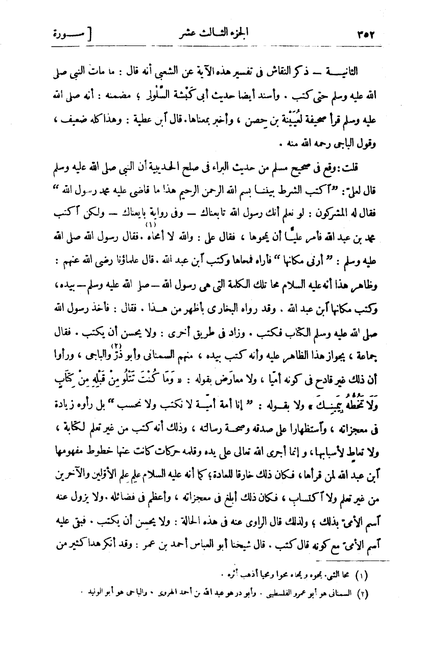 الثَّانِيَةُ- ذَكَرَ النَّقَّاشُ فِي تَفْسِيرِ هَذِهِ الْآيَةِ عَنِ الشَّعْبِيِّ أَنَّهُ قَالَ: مَا مَاتَ النَّبِيُّ صَلَّى اللَّهُ عَلَيْهِ وَسَلَّمَ حَتَّى كَتَبَ. وَأَسْنَدَ أيضا حديث أبي كشة السَّلُولِيِّ، مُضْمَنُهُ: أَنَّهُ صَلَّى اللَّهُ عَلَيْهِ وَسَلَّمَ قَرَأَ صَحِيفَةً لِعُيَيْنَةَ بْنِ حِصْنٍ، وَأَخْبَرَ بِمَعْنَاهَا. قَالَ ابْنُ عَطِيَّةَ: وَهَذَا كُلُّهُ ضَعِيفٌ، وَقَوْلُ الْبَاجِيِّ رَحِمَهُ اللَّهُ مِنْهُ. قُلْتُ: وَقَعَ فِي صَحِيحِ مُسْلِمٍ مِنْ حَدِيثِ الْبَرَاءِ فِي صُلْحِ الْحُدَيْبِيَةِ أَنَّ النَّبِيَّ صَلَّى اللَّهُ عَلَيْهِ وَسَلَّمَ قَالَ لِعَلِيٍّ:" اكْتُبِ الشَّرْطَ بَيْنَنَا بِسْمِ اللَّهِ الرَّحْمَنِ الرَّحِيمِ هَذَا مَا قَاضَى عَلَيْهِ مُحَمَّدٌ رَسُولُ اللَّهِ" فَقَالَ لَهُ الْمُشْرِكُونَ: لَوْ نَعْلَمُ أَنَّكَ رَسُولُ اللَّهِ تَابَعْنَاكَ- وَفِي رِوَايَةٍ بَايَعْنَاكَ- وَلَكِنِ اكْتُبْ مُحَمَّدُ بْنُ عَبْدِ اللَّهِ فَأَمَرَ عليا أن يمحوها، فقال علي: والله لا أمحاه «١». فَقَالَ رَسُولُ اللَّهِ صَلَّى اللَّهُ عَلَيْهِ وَسَلَّمَ:" أَرِنِي مَكَانَهَا" فَأَرَاهُ فَمَحَاهَا وَكَتَبَ ابْنُ عَبْدِ الله. قَالَ عُلَمَاؤُنَا رَضِيَ اللَّهُ عَنْهُمْ: وَظَاهِرُ هَذَا أَنَّهُ عَلَيْهِ السَّلَامُ مَحَا تِلْكَ الْكَلِمَةَ الَّتِي هِيَ رَسُولُ اللَّهِ- صَلَّى اللَّهُ عَلَيْهِ وَسَلَّمَ- بِيَدِهِ، وَكَتَبَ مَكَانَهَا ابْنُ عَبْدِ اللَّهِ. وَقَدْ رَوَاهُ الْبُخَارِيُّ بِأَظْهَرَ مِنْ هَذَا. فَقَالَ: فَأَخَذَ رَسُولُ اللَّهِ صَلَّى اللَّهُ عَلَيْهِ وَسَلَّمَ الْكُتَّابَ فَكَتَبَ. وَزَادَ فِي طَرِيقٍ أُخْرَى: وَلَا يُحْسِنُ أَنْ يَكْتُبَ. فَقَالَ جَمَاعَةٌ: بِجَوَازِ هَذَا الظَّاهِرِ عَلَيْهِ وَأَنَّهُ كَتَبَ بِيَدِهِ، مِنْهُمِ السِّمَنَانِيُّ وَأَبُو ذَرٍّ «٢» وَالْبَاجِيُّ، وَرَأَوْا أَنَّ ذَلِكَ غَيْرُ قَادِحٍ فِي كَوْنِهِ أُمِّيًّا، وَلَا مُعَارِضَ بِقَوْلِهِ:" وَما كُنْتَ تَتْلُوا مِنْ قَبْلِهِ مِنْ كِتابٍ وَلا تَخُطُّهُ بِيَمِينِكَ" وَلَا بِقَوْلِهِ:" إِنَّا أُمَّةٌ أُمِّيَّةٌ لَا نَكْتُبُ وَلَا نَحْسُبُ" بَلْ رَأَوْهُ زِيَادَةً فِي مُعْجِزَاتِهِ، وَاسْتِظْهَارًا عَلَى صِدْقِهِ وَصِحَّةِ رِسَالَتِهِ وَذَلِكَ أَنَّهُ كَتَبَ مِنْ غَيْرِ تَعَلُّمٍ لِكِتَابَةٍ، وَلَا تَعَاطٍ لِأَسْبَابِهَا، وَإِنَّمَا أَجْرَى اللَّهُ تَعَالَى عَلَى يَدِهِ وَقَلَمِهِ حَرَكَاتٍ كَانَتْ عَنْهَا خُطُوطٌ مَفْهُومُهَا ابْنُ عَبْدِ اللَّهِ لِمَنْ قَرَأَهَا، فَكَانَ ذَلِكَ خَارِقًا لِلْعَادَةِ، كَمَا أَنَّهُ عَلَيْهِ السَّلَامُ عَلِمَ عِلْمَ الْأَوَّلِينَ وَالْآخِرِينَ مِنْ غَيْرِ تَعَلُّمٍ وَلَا اكْتِسَابٍ، فَكَانَ ذَلِكَ أَبْلَغَ فِي مُعْجِزَاتِهِ، وَأَعْظَمَ فِي فضائله. لا يَزُولُ عَنْهُ اسْمُ الْأُمِّيِّ بِذَلِكَ، وَلِذَلِكَ قَالَ الرَّاوِي عَنْهُ فِي هَذِهِ الْحَالَةِ: وَلَا يُحْسِنُ أَنْ يَكْتُبَ. فَبَقِيَ عَلَيْهِ اسْمُ الْأُمِّيِّ مَعَ كَوْنِهِ قَالَ كَتَبَ. قَالَ شَيْخُنَا أَبُو الْعَبَّاسِ أَحْمَدُ بْنُ عُمَرَ: وَقَدْ أَنْكَرَ هَذَا كَثِيرٌ من