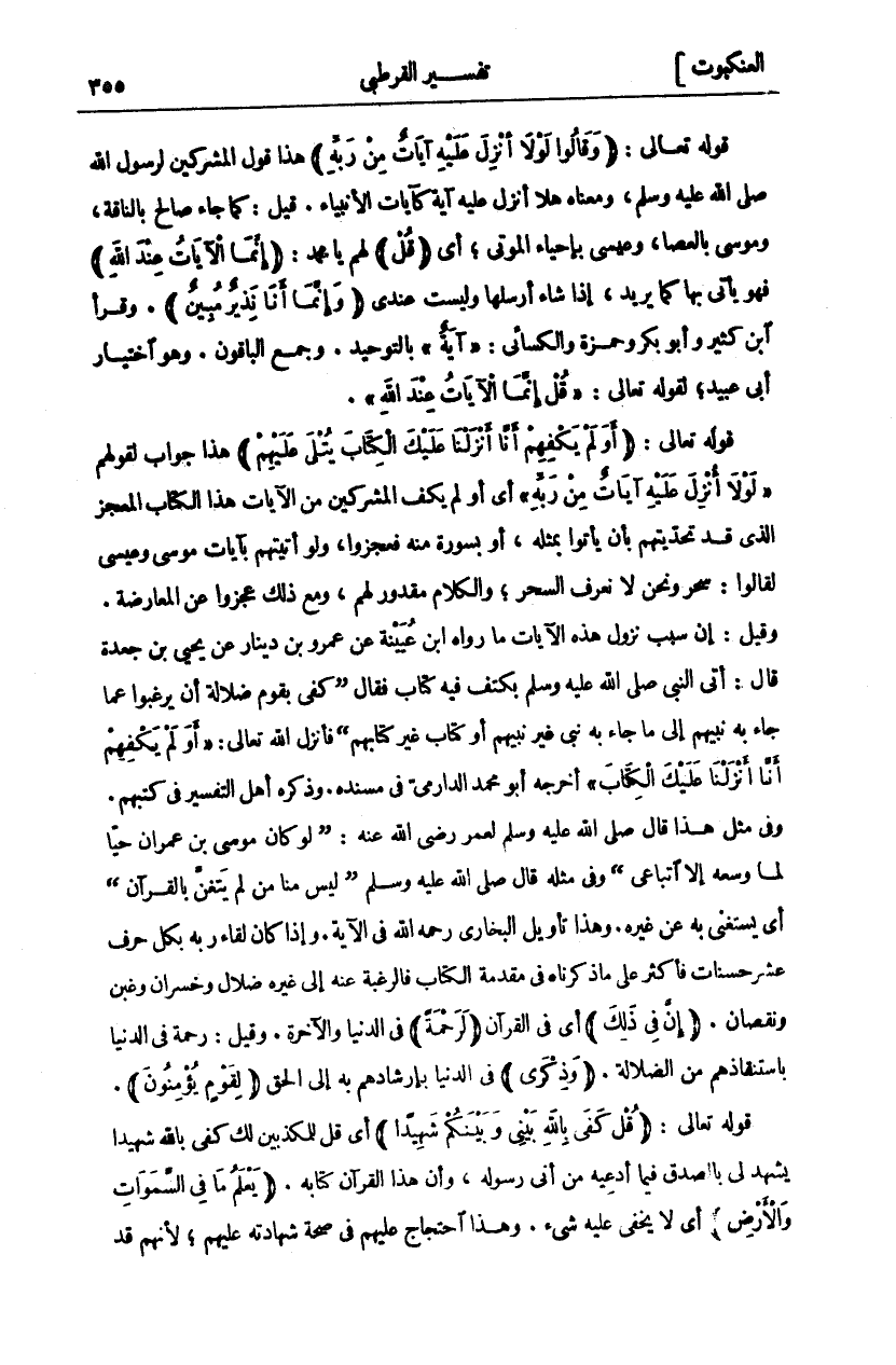 قوله تعالى: (وَقالُوا لَوْلا أُنْزِلَ عَلَيْهِ آياتٌ مِنْ رَبِّهِ) هَذَا قَوْلُ الْمُشْرِكِينَ لِرَسُولِ اللَّهِ صَلَّى اللَّهُ عَلَيْهِ وَسَلَّمَ، وَمَعْنَاهُ هَلَّا أُنْزِلَ عَلَيْهِ آيَةٌ كَآيَاتِ الْأَنْبِيَاءِ. قِيلَ: كَمَا جَاءَ صَالِحٌ بِالنَّاقَةِ، وَمُوسَى بِالْعَصَا، وَعِيسَى بِإِحْيَاءِ الْمَوْتَى، أَيْ" قُلْ" لَهُمْ يَا مُحَمَّدُ: (إِنَّمَا الْآياتُ عِنْدَ اللَّهِ) فَهُوَ يَأْتِي بِهَا كَمَا يُرِيدُ، إِذَا شَاءَ أَرْسَلَهَا وَلَيْسَتْ عِنْدِي (وَإِنَّما أَنَا نَذِيرٌ مُبِينٌ). وَقَرَأَ ابْنُ كَثِيرٍ وَأَبُو بَكْرٍ وَحَمْزَةُ وَالْكِسَائِيُّ:" آيَةٌ" بِالتَّوْحِيدِ. وَجَمَعَ الْبَاقُونَ. وَهُوَ اخْتِيَارُ أَبِي عُبَيْدٍ، لِقَوْلِهِ تَعَالَى:" قُلْ إِنَّمَا الْآياتُ عِنْدَ اللَّهِ". قَوْلُهُ تَعَالَى: (أَوَلَمْ يَكْفِهِمْ أَنَّا أَنْزَلْنا عَلَيْكَ الْكِتابَ يُتْلى عَلَيْهِمْ) هذا جواب لقولهم" لَوْلا أُنْزِلَ عَلَيْهِ آياتٌ مِنْ رَبِّهِ" أي أو لم يَكْفِ الْمُشْرِكِينَ مِنَ الْآيَاتِ هَذَا الْكِتَابُ الْمُعْجِزُ الَّذِي قَدْ تَحَدَّيْتَهُمْ بِأَنْ يَأْتُوا بِمِثْلِهِ، أَوْ بسورة منه فعجزوا، ولوا أَتَيْتَهُمْ بِآيَاتِ مُوسَى وَعِيسَى لَقَالُوا: سِحْرٌ وَنَحْنُ لَا نَعْرِفُ السِّحْرَ، وَالْكَلَامُ مَقْدُورٌ، لَهُمْ وَمَعَ ذَلِكَ عَجَزُوا عَنِ الْمُعَارَضَةِ. وَقِيلَ: إِنَّ سَبَبَ نُزُولِ هَذِهِ الْآيَاتِ مَا رَوَاهُ ابْنُ عُيَيْنَةَ عَنْ عَمْرِو بْنِ دِينَارٍ عَنْ يَحْيَى بْنِ جَعْدَةَ قَالَ: أَتَى النَّبِيَّ صَلَّى اللَّهُ عَلَيْهِ وَسَلَّمَ بِكَتِفٍ فِيهِ كِتَابٌ فَقَالَ" كَفَى بِقَوْمٍ ضلالة وأن يرغبون عَمَّا جَاءَ بِهِ نَبِيُّهُمْ إِلَى مَا جَاءَ بِهِ نَبِيٌّ غَيْرُ نَبِيِّهِمْ أَوْ كِتَابٌ غَيْرُ كِتَابِهِمْ" فَأَنْزَلَ اللَّهُ تَعَالَى:" أَوَلَمْ يَكْفِهِمْ أَنَّا أَنْزَلْنا عَلَيْكَ الْكِتابَ" أَخْرَجَهُ أَبُو مُحَمَّدٍ الدَّارِمِيُّ فِي مُسْنَدِهِ. وَذَكَرَهُ أَهْلُ التَّفْسِيرِ فِي كُتُبِهِمْ. وَفِي مِثْلِ هَذَا قَالَ صَلَّى اللَّهُ عَلَيْهِ وَسَلَّمَ لِعُمَرَ رَضِيَ اللَّهُ عَنْهُ:" لَوْ كَانَ مُوسَى بْنُ عِمْرَانَ حَيًّا لَمَا وَسِعَهُ إِلَّا اتِّبَاعِي" وَفِي مِثْلِهِ قَالَ صَلَّى اللَّهُ عَلَيْهِ وَسَلَّمَ" لَيْسَ مِنَّا مَنْ لَمْ يَتَغَنَّ بِالْقُرْآنِ" أَيْ يَسْتَغْنِي بِهِ عَنْ غَيْرِهِ. وَهَذَا تَأْوِيلُ الْبُخَارِيِّ رَحِمَهُ اللَّهُ فِي الْآيَةِ. وَإِذَا كَانَ لِقَاءُ رَبِّهِ بِكُلِّ حَرْفٍ عَشْرُ حَسَنَاتٍ فَأَكْثَرَ عَلَى مَا ذَكَرْنَاهُ فِي مُقَدَّمَةِ الْكِتَابِ فَالرَّغْبَةُ عَنْهُ إِلَى غَيْرِهِ ضَلَالٌ وَخُسْرَانٌ وَغَبْنٌ وَنُقْصَانٌ. (إِنَّ فِي ذلِكَ) أَيْ فِي الْقُرْآنِ" لَرَحْمَةً" فِي الدُّنْيَا وَالْآخِرَةِ. وَقِيلَ: رَحْمَةً فِي الدُّنْيَا باستنقاذهم مِنَ الضَّلَالَةِ." وَذِكْرى " فِي الدُّنْيَا بِإِرْشَادِهِمْ بِهِ إِلَى الْحَقِّ (لِقَوْمٍ يُؤْمِنُونَ). قَوْلُهُ تَعَالَى: (قُلْ كَفى بِاللَّهِ بَيْنِي وَبَيْنَكُمْ شَهِيداً) أَيْ قُلْ لِلْمُكَذِّبِينَ لَكَ كَفَى بِاللَّهِ شَهِيدًا يَشْهَدُ لِي بِالصِّدْقِ فِيمَا أَدَّعِيهِ مِنْ أَنِّي رَسُولُهُ، وَأَنَّ هَذَا الْقُرْآنَ كِتَابُهُ. (يَعْلَمُ مَا فِي السَّماواتِ وَالْأَرْضِ) أي لا يخفى عليه شي. وَهَذَا احْتِجَاجٌ عَلَيْهِمْ فِي صِحَّةِ شَهَادَتِهِ عَلَيْهِمْ، لأنهم قد