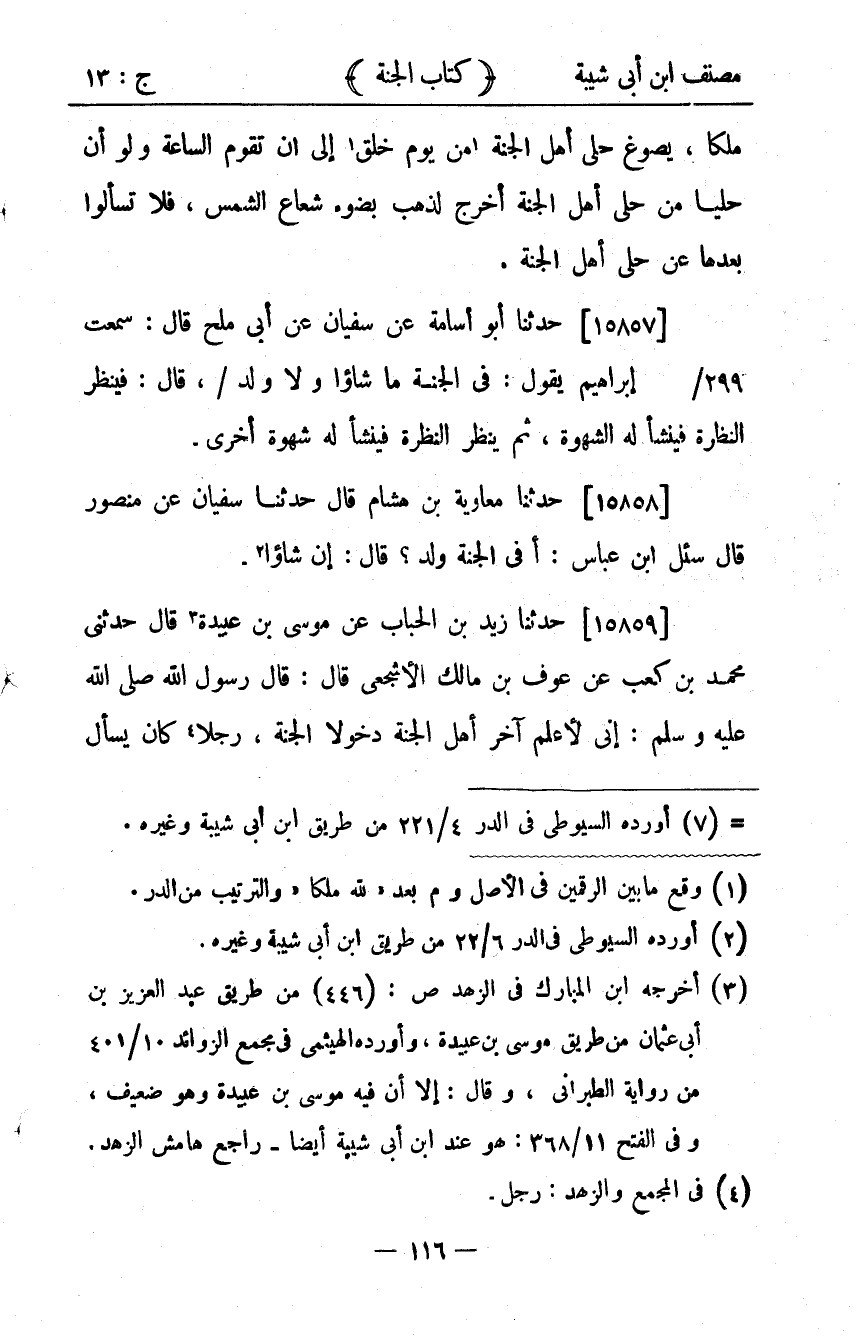 35145- حَدَّثَنَا مُعَاوِيَةُ بْنُ هِشَامٍ ، قَالَ : حدَّثَنَا سُفْيَانُ ، عَنْ مَنْصُورٍ ، قَالَ : سُئِلَ ابْنُ عَبَّاسٍ : أَفِي الْجَنَّةِ وَلَدٌ ؟ قَالَ : إِنْ شَاؤُوا.