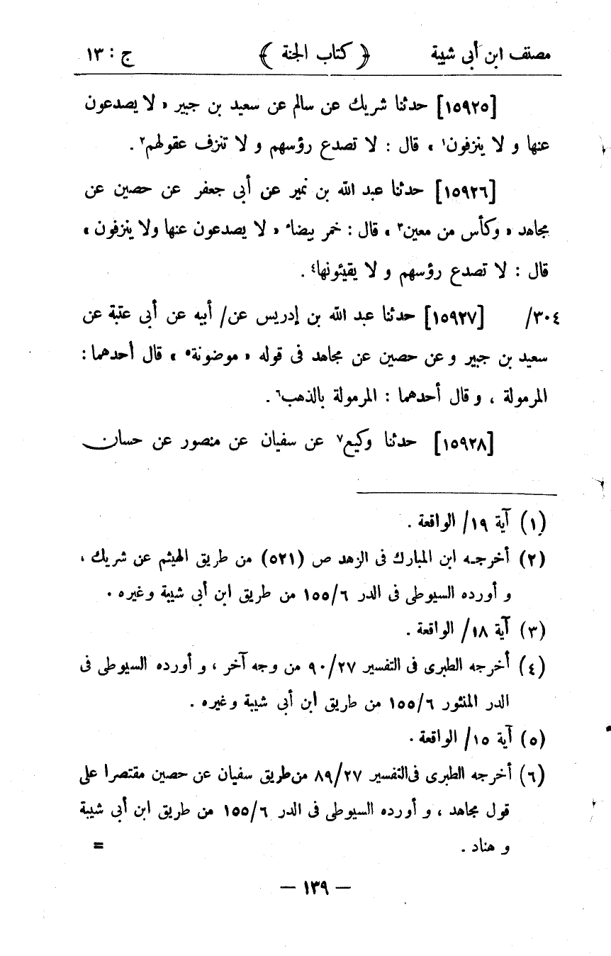 35213- حَدَّثَنَا شَرِيكٌ ، عَنْ سَالِمٍ ، عَنْ سَعِيدِ بْنِ جُبَيْرٍ ؛ {لاَ يُصَدَّعُونَ عَنْهَا وَلاَ يُنْزِفُونَ} ، قَالَ : لاَ تُصَدَّعُ رُؤُوسُهُمْ ، وَلاَ تُنْزِفُ عُقُولُهُمْ.