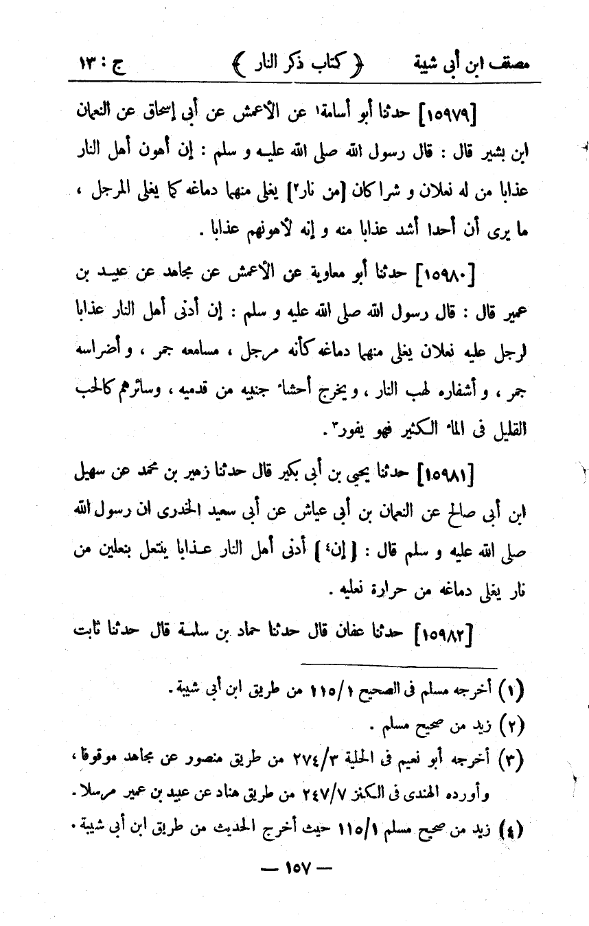35271- حَدَّثَنَا يَحْيَى بْنُ أَبِي بُكَيرٍ ، قَالَ : حدَّثَنَا زُهَيْرُ بْنُ مُحَمَّدٍ ، عَنْ سُهَيْلِ بْنِ أَبِي صَالِحٍ ، عَنِ النُّعْمَانِ بْنِ أَبِي عَيَّاشٍ ، عَنْ أَبِي سَعِيدٍ الْخُدْرِيِّ ؛ أَنَّ رَسُولَ اللهِ صلى الله عليه وسلم ، قَالَ : أَدْنَى أَهْلِ النَّارِ عَذَابًا مُنْتَعِلُ بِنَعْلَيْنِ مِنْ نَارٍ ، يَغْلِي دِمَاغُهُ مِنْ حَرَارَةِ نَعْلَيْهِ.