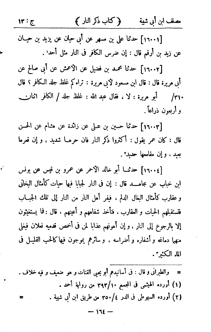 35292- حَدَّثَنَا عَلِيُّ بْنُ مُسْهِرٍ ، عَنْ أَبِي حَيَّانَ ، عَنْ يَزِيدَ بْنِ حَيَّانَ ، عَنْ زَيْدِ بْنِ أَرْقَمَ ، قَالَ : إِنَّ ضِرْسَ الْكَافِرِ فِي النَّارِ مِثْلُ أُحُدٍ.