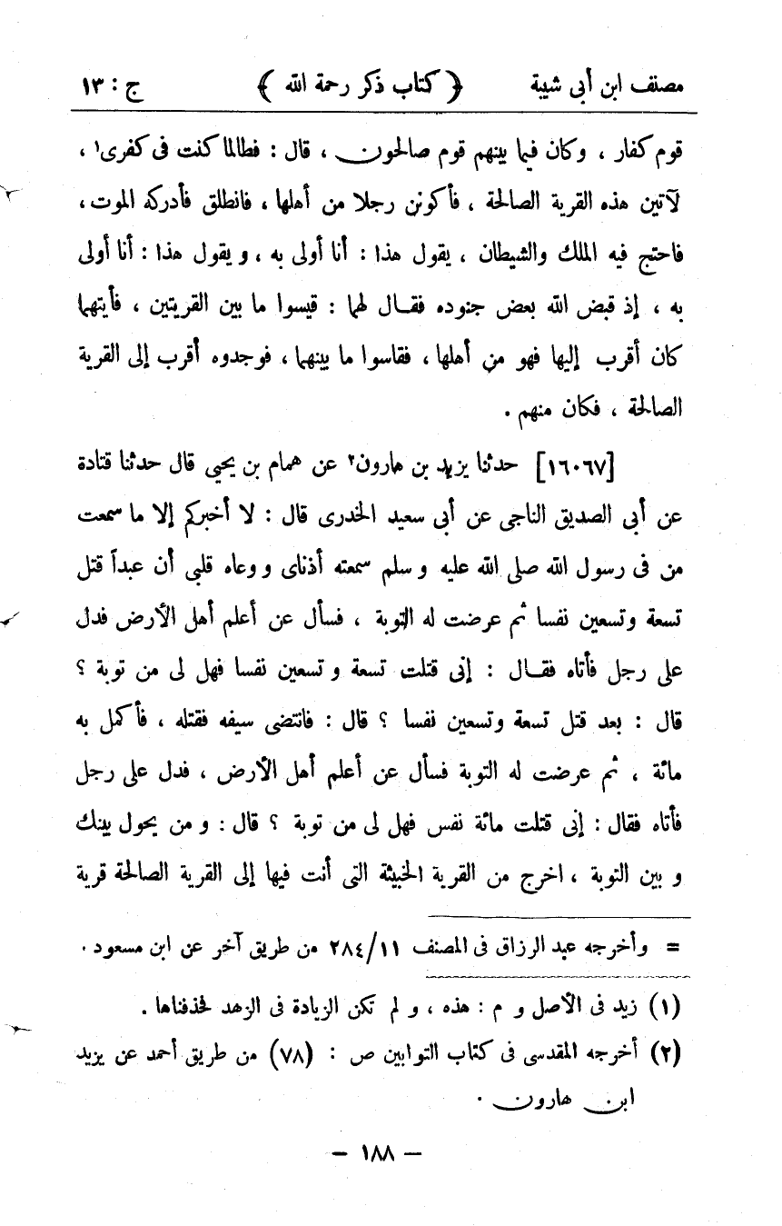 35361- حَدَّثَنَا يَزِيدُ بْنُ هَارُونَ ، عَنْ هَمَّامِ بْنِ يَحْيَى ، قَالَ : حدَّثَنَا قَتَادَةُ ، عَنْ أَبِي الصِّدِّيقِ النَّاجِي ، عَنْ أَبِي سَعِيدٍ الْخُدْرِيِّ ، قَالَ : لاَ أُخْبِركُمْ إِلاَّ مَا سَمِعْتُ مِنْ فِي رَسُولِ اللهِ صلى الله عليه وسلم ، سَمِعَتْهُ أُذُنَايَ ، وَوَعَاهُ قَلْبِي ، إِنَّ عَبْدًا قَتَلَ تِسْعَةً وَتِسْعِينَ نَفْسًا ، ثُمَّ عُرِضَتْ لَهُ التَّوْبَةُ ، فَسَأَلَ عَنْ أَعْلَمِ أَهْلِ الأَرْضِ ؟ فَدُلَّ عَلَى رَجُلٍ فَأَتَاهُ ، فَقَالَ : إِنِّي قَتَلْتُ تِسْعَةً وَتِسْعِينَ نَفْسًا ، فَهَلْ لِي مِنْ تَوْبَةٍ ؟ قَالَ : بَعْدَ قَتْلِ تِسْعَةٍ وَتِسْعِينَ نَفْسًا ؟ قَالَ : فَانْتَضَى سَيْفَهُ فَقَتَلَهُ ، فَأَكْمَلَ بِهِ مِئَة.