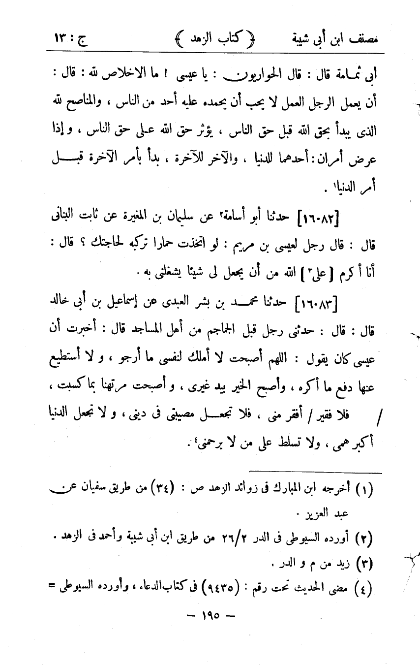 35376- حَدَّثَنَا أَبُو أُسَامَةَ ، عَنْ سُلَيْمَانَ بْنِ الْمُغِيرَةِ ، عَنْ ثَابِتٍ الْبُنَانِيِّ ، قَالَ : قَالَ رَجُلٌ لِعِيسَى ابْنِ مَرْيَمَ عَلَيْهِ السَّلاَمُ : لَوِ اتَّخَذْت حِمَارًا تَرْكَبُهُ لِحَاجَتِكَ ، قَالَ : أَنَا أَكْرَمُ عَلَى اللهِ مِنْ أَنْ يَجْعَلَ لِي شَيْئًا يَشْغَلُنِي بِهِ.