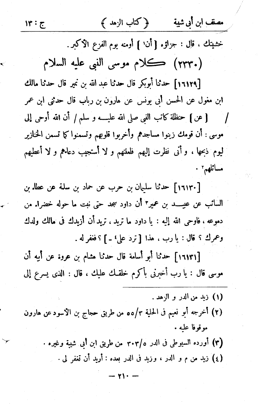 35423- حدَّثَنَا عَبْدُ اللهِ بْنُ نُمَيْرٍ ، قَالَ : مَالِكُ بْنُ مِغْوَلٍ ، عَنِ الْحَسَنِ أَبِي يُونُسَ ، عَنْ هَارُونَ بْنِ رِئَابٍ ، قَالَ : حَدَّثَنِي ابْنُ عَمِّ حَنْظَلَةَ كَاتِبِ النَّبِيِّ صلى الله عليه وسلم ، أَنَّ اللَّهَ أَوْحَى إِلَى مُوسَى : أَنَّ قَوْمَك زَيَّنُوا مَسَاجِدَهُمْ وَأَخْرَبُوا قُلُوبَهُمْ , وَتَسَمَّنُوا كَمَا تُسَمَّنُ الْخَنَازِيرُ لِيَوْمِ ذَبْحِهَا ، وَإِنِّي نَظَرْت إلَيْهِمْ فَلَعَنَتُهُمْ ، فَلاَ أَسْتَجِيبُ دُعَاءَهُمْ ، وَلاَ أُعْطِيهِمْ مَسَائِلَهُمْ.