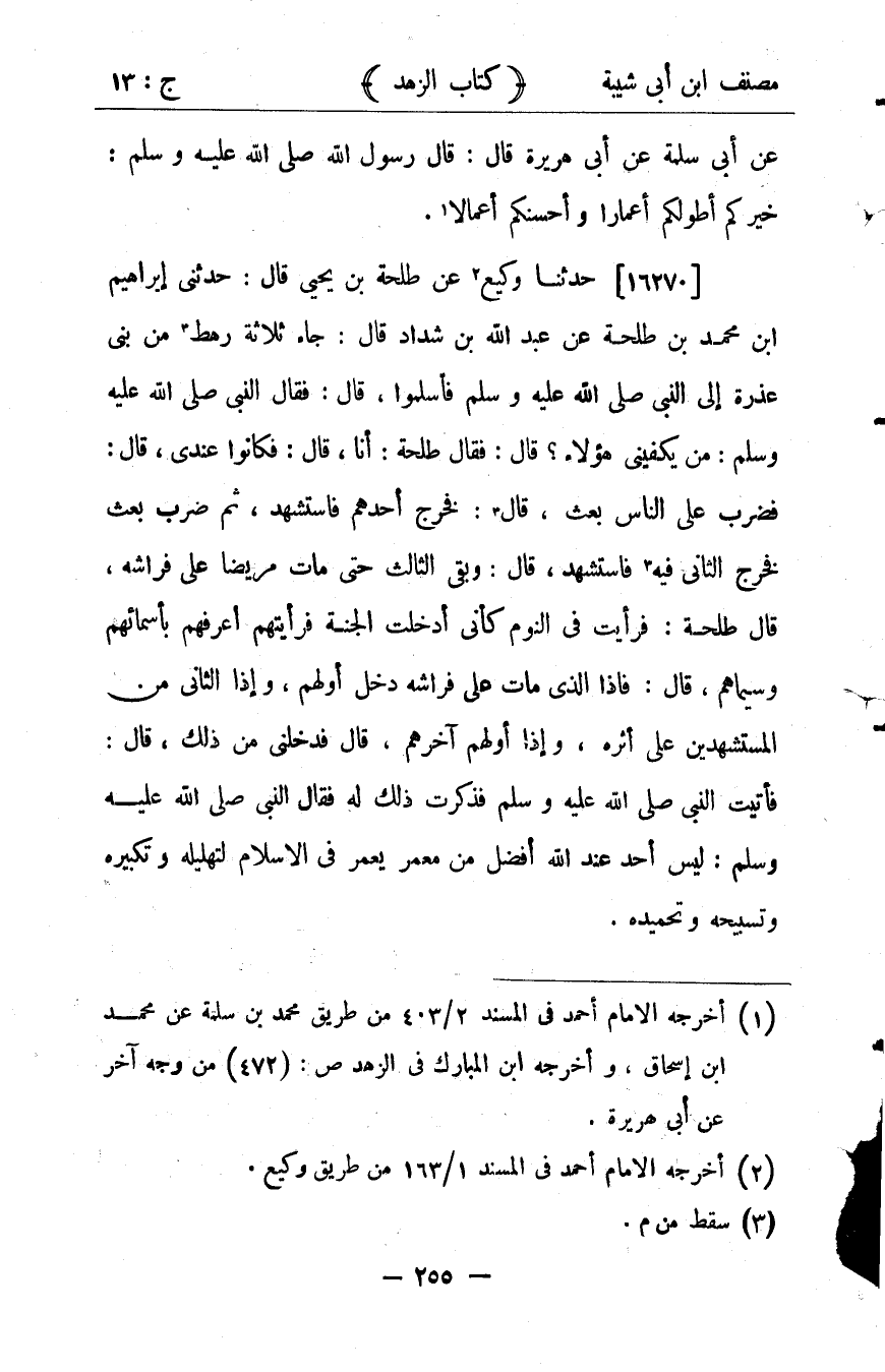 35564- حَدَّثَنَا وَكِيعٌ ، عَنْ طَلْحَةَ بْنِ يَحْيَى ، قَالَ : حدَّثَنِي إبْرَاهِيمُ بْنُ مُحَمَّدِ بْنِ طَلْحَةَ ، عَنْ عَبْدِ اللهِ بْنِ شَدَّادٍ ، قَالَ : جَاءَ ثَلاَثَةُ رَهْطٍ مِنْ بَنِي عُذْرَةٍ إِلَى النَّبِيِّ صلى الله عليه وسلم فَأَسْلَمُوا ، قَالَ : فَقَالَ النَّبِيُّ صلى الله عليه وسلم : مَنْ يَكْفِينِي هَؤُلاَءِ ، قَالَ : فَقَالَ : طَلْحَةُ : أَنَا ، قَالَ : فَكَانُوا عِنْدِي ، قَالَ : فَضُرِبَ عَلَى النَّاسِ بَعْثٌ ، قَالَ : فَخَرَجَ أَحَدُهُمْ فَاسْتُشْهِدَ ، ثُمَّ ضُرِبَ بَعْثٌ فَخَرَجَ الثَّانِي فِيهِ فَاسْتُشْهِدَ ، قَالَ : وَبَقِيَ الثَّالِثُ حَتَّى مَاتَ مَرِيضًا عَلَى فِرَاشِهِ ، قَالَ طَلْحَةُ : فَرَأَيْتُ فِي النَّوْمِ كَأَنِّي أُدْخِلْت الْجَنَّةَ فَرَأَيْتهمْ أَعْرِفُهُمْ بِأَسْمَائِهِمْ وَسِيمَاهُمْ ، قَالَ : فَإِذَا الَّذِي مَاتَ عَلَى فِرَاشِهِ دَخَلَ أَوَّلَهُمْ ، وَإِذَا الثَّانِي مِنَ الْمُسْتَشْهِدِينَ عَلَى أَثَرِهِ ، وَإِذَا أَوَّلُهُمْ آخِرُهُمْ ، قَالَ فَدَخَلَنِي مِنْ ذَلِكَ ، قَالَ : فَأَتَيْت النَّبِيَّ صلى الله عليه وسلم فَذَكَرْت ذَلِكَ لَهُ ، فَقَالَ النَّبِيُّ صلى الله عليه وسلم : لَيْسَ أَحَدٌ عِنْدَ اللهِ أَفْضَلَ مِنْ مُعَمِّرٍ يُعَمَّرُ فِي الإِسْلاَمِ لِتَهْلِيلِهِ وَتَكْبِيرِهِ وَتَسْبِيحِهِ وَتَحْمِيدِهِ.