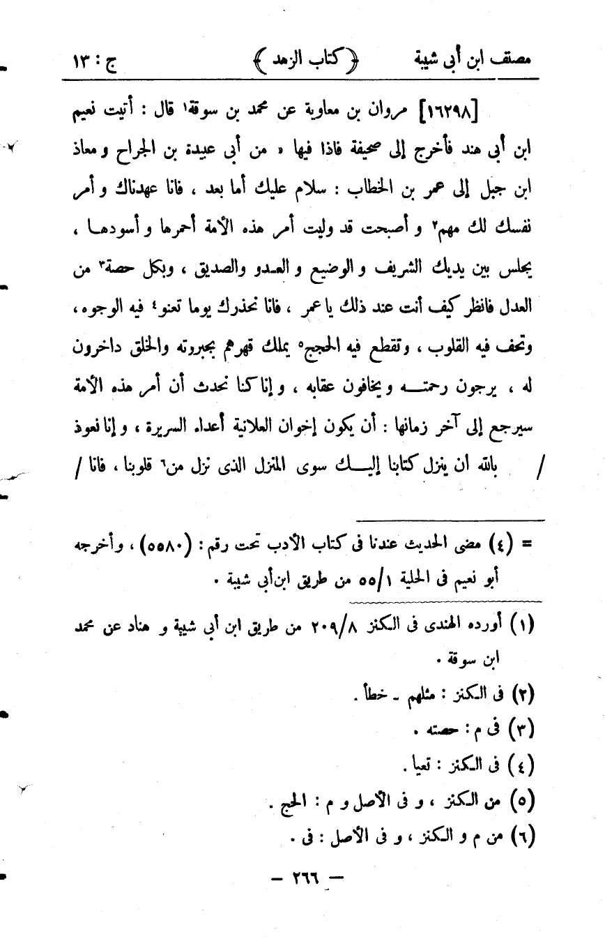 35592- حَدَّثَنَا مَرْوَانُ بْنُ مُعَاوِيَةَ ، عَنْ مُحَمَّدِ بْنِ سُوقَةَ ، قَالَ : أَتَيْتُ نُعَيْمَ بْنَ أَبِي هِنْدٍ فَأَخْرَجَ إلَيَّ صَحِيفَةً فَإِذَا فِيهَا مِنْ أَبِي عُبَيْدَةَ بْنِ الْجَرَّاحِ وَمُعَاذِ بْنِ جَبَلٍ إِلَى عُمَرَ بْنِ الْخَطَّابِ : سَلاَمٌ عَلَيْك أَمَّا بَعْدُ ، فَإِنَّا عَهِدْنَاك وَأَمْرُ نَفْسِكَ لَك مُهِمٌّ , وَأَصْبَحْت وقَدْ وُلِّيت أَمْرَ هَذِهِ الأُمَّةِ أَحْمَرِهَا وَأَسْوَدِهَا ، يَجْلِسُ بَيْنَ يَدَيْك الشَّرِيفُ وَالْوَضِيعُ وَالْعَدُوُّ وَالصَّدِيقُ ، وَلِكُلٍّ حِصَّتُهُ مِنَ الْعَدْلِ فَانْظُرْ كَيْفَ أَنْتَ عِنْدَ ذَلِكَ يَا عُمَرُ ، فَإِنَّا نُحَذِّرُك يَوْمًا تَعَنْو فِيهِ الْوُجُوهُ ، وَتَجِفُّ فِيهِ الْقُلُوبُ ، وَتُقْطَعُ فِيهِ الْحُجَجُ مَلكٌ قَهْرَهُمْ بِجَبَرُوتِهِ وَالْخَلْقُ دَاخِرُونَ لَهُ ، يَرْجُونَ رَحْمَتَهُ وَيَخَافُونَ عِقَابَهُ ، وَإِنَّا كُنَّا نُحَدِّثُ أَنَّ أَمْرَ هَذِهِ الأُمَّةِ سَيَرْجِعُ فِي آخِرِ زَمَانِهَا : أَنْ يَكُونَ إخْوَانُ الْعَلاَنِيَةِ أَعْدَاءَ السَّرِيرَةِ ، وَإِنَّا نَعُوذَ بِاللهِ أَنْ يَنْزِلَ كِتَابُنَا إلَيْك سِوَى الْمَنْزِلِ الَّذِي نَزَلَ مِنْ قُلُوبِنَا ، فَإِنَّا