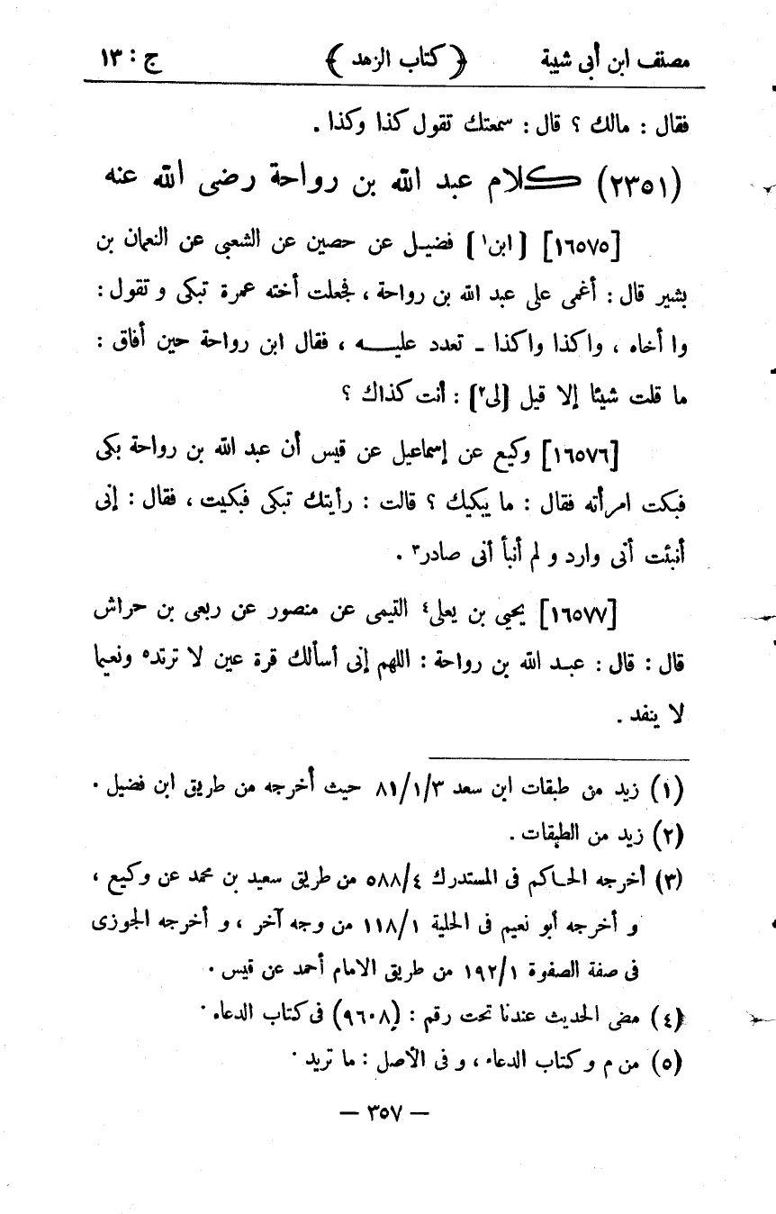 35871- حَدَّثَنَا ابْنُ فُضَيْلٍ ، عَنْ حُصَيْنٍ ، عَنِ الشَّعْبِيِّ ، عَنِ النُّعْمَانِ بْنِ بَشِيرٍ ، قَالَ : أُغْمِيَ عَلَى عَبْدِ اللهِ بْنِ رَوَاحَةَ ، فَجَعَلَتْ أُخْتُهُ عَمْرَةُ تَبْكِي وَتَقُولُ : وَأَخَاهُ ، وَا كَذَا وَا كَذَا تُعَدِّدُ عَلَيْهِ ، فَقَالَ ابْنُ رَوَاحَةَ حِينَ أَفَاقَ : مَا قُلْتُ شَيْئًا إِلاَّ قِيلَ لِي : أَنْتَ كَذَاك.