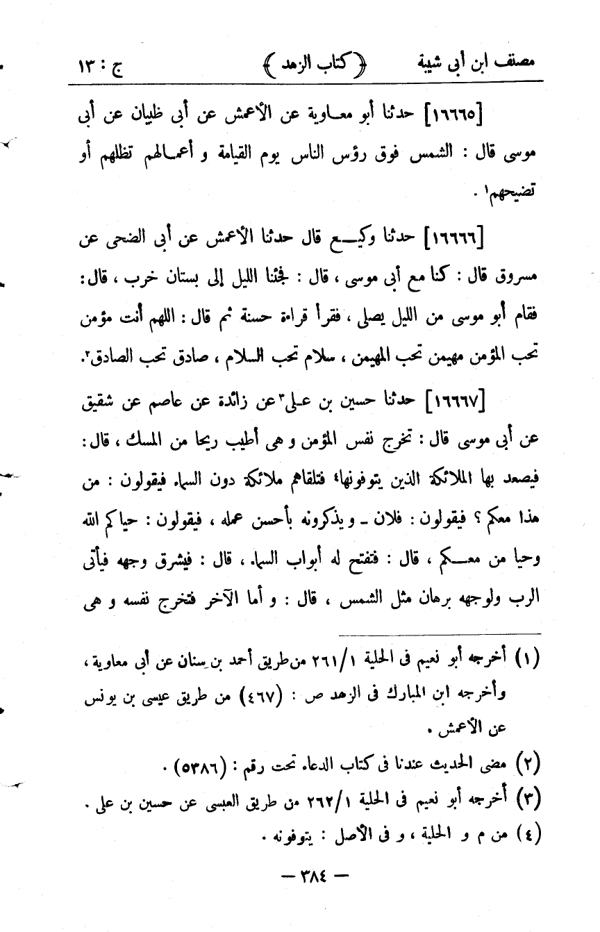 35961- حَدَّثَنَا أَبُو مُعَاوِيَةَ ، عَنِ الأَعْمَشِ ، عَنْ أَبِي ظَبْيَانَ ، عَنْ أَبِي مُوسَى ، قَالَ : الشَّمْسُ فَوْقَ رُؤُوسِ النَّاسِ يَوْمَ الْقِيَامَةِ وَأَعْمَالُهُمْ تُظِلُّهُمْ ، أَوْ تُضَحِيِّهُمْ.
