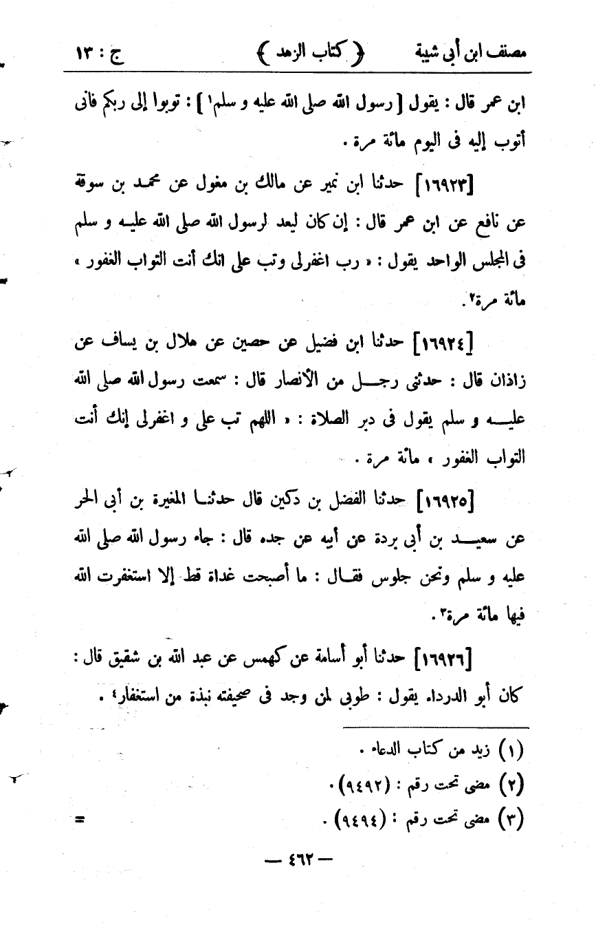 36221- حَدَّثَنَا ابْنُ نُمَيْرٍ ، عَنْ مَالِكِ بْنِ مِغْوَلٍ ، عَنْ مُحَمَّدِ بْنِ سُوقَةَ ، عَنْ نَافِعٍ ، عَنِ ابْنِ عُمَرَ ، قَالَ : إنْ كَانَ لَيُعَدُّ لِرَسُولِ اللهِ صلى الله عليه وسلم فِي الْمَجْلِسِ الْوَاحِدِ يَقُولُ : رَبِّ اغْفِرْ لِي وَتُبْ عَلَيَّ إنَّك أَنْتَ التَّوَّابُ الْغَفُورُ مِئَةَ مَرَّةٍ.