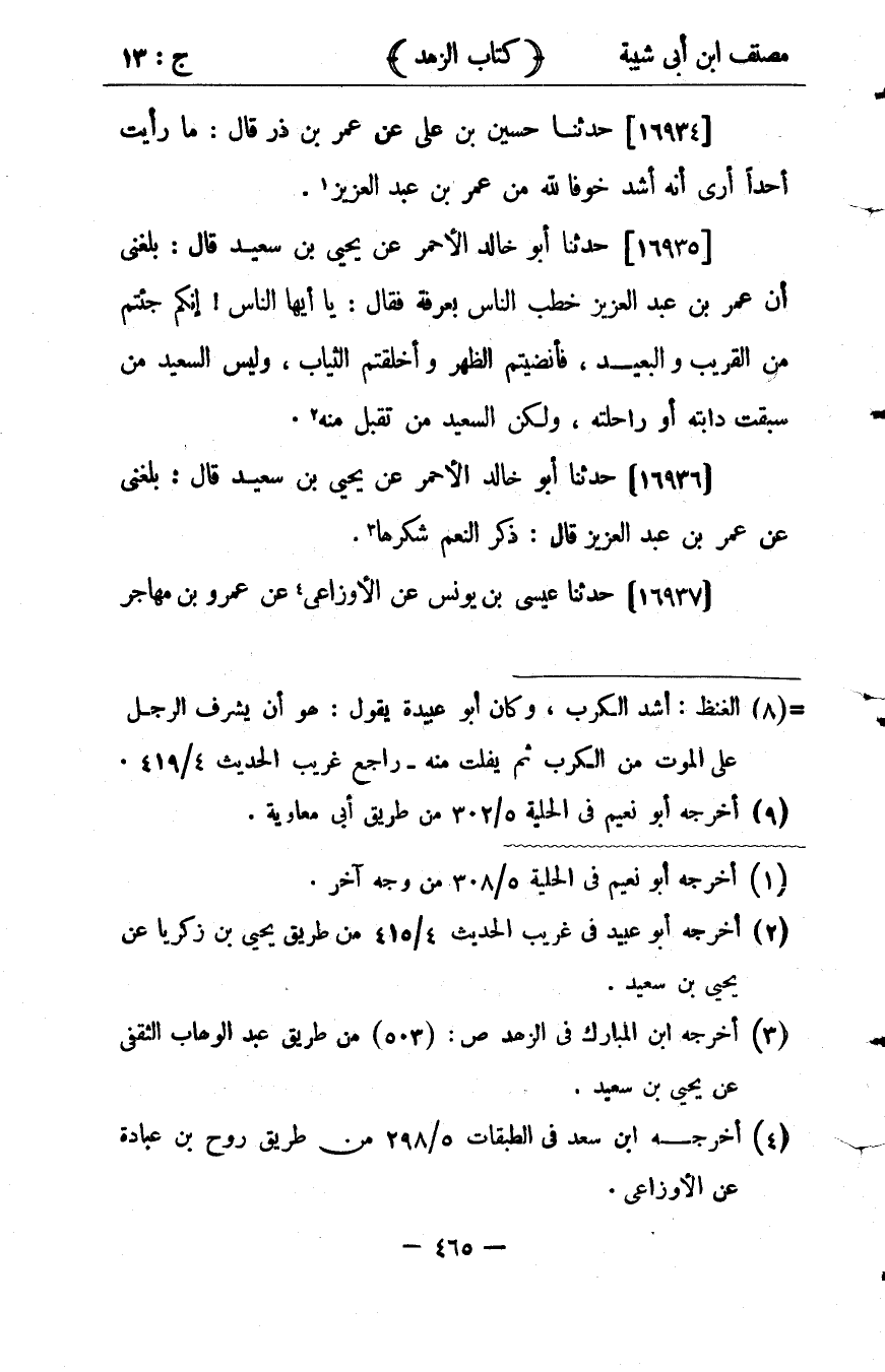 36233- حَدَّثَنَا أَبُو خَالِدٍ الأَحْمَرُ ، عَنْ يَحْيَى بْنِ سَعِيدٍ ، قَالَ : بَلَغَنِي أَنَّ عُمَرَ بْنَ عَبْدِ الْعَزِيزِ خَطَبَ النَّاسَ بِعَرَفَةَ ، فَقَالَ : يَا أَيُّهَا النَّاسُ ، إنَّكُمْ جِئْتُمْ مِنَ الْقَرِيبِ وَالْبَعِيد ، فَأَنْضَيْتُمَ الظَّهْرَ وَأَخْلَقْتُمَ الثِّيَابَ ، وَلَيْسَ السَّعِيدُ مَنْ سَبَقَتْ دَابَّتُهُ ، أَوْ رَاحِلَتُهُ ، وَلَكِنَّ السَّعِيدَ مَنْ تُقُبِّلَ مِنْهُ.