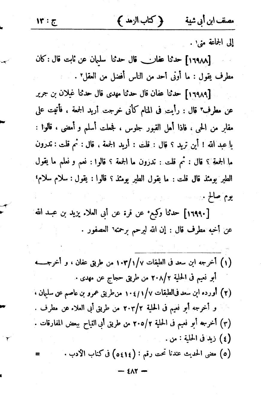 36288- حَدَّثَنَا عَفَّانُ ، قَالَ : حدَّثَنَا مَهْدِيٌّ ، قَالَ : حَدَّثَنَا غَيْلاَنُ بْنُ جَرِيرٍ ، عَنْ مُطَرِّفَ قَالَ : رَأَيْتُ فِي الْمَنَامِ كَأَنِّي خَرَجْت أُرِيدُ الْجُمُعَةَ ، فَأَتَيْت عَلَى مَقَابِرَ مِنَ الْحَي ، فَإِذَا أَهْلُ الْقُبُورِ جُلُوسٌ ، فَجَعَلْتُ أُسَلِّمُ وَأَمْضِي ، قَالُوا : يَا عَبْدَ اللهِ ، أَيْنَ تُرِيدُ ، قَالَ : قُلْتُ : أُرِيدُ الْجُمُعَةَ ، قَالَ : ثُمَّ قُلْتُ : تَدْرُونَ مَا الْجُمُعَةُ ، قَالُوا : نَعَمْ وَنَعْلَمُ مَا يَقُولُ الطَّيْرُ يَوْمَئِذٍ ، قَالَ : قُلْتُ : مَا يَقُولُ الطَّيْرُ يَوْمَئِذٍ ، قَالُوا : يَقُولُ : سَلاَمٌ سَلاَمٌ يَوْمٌ صَالِحٌ.