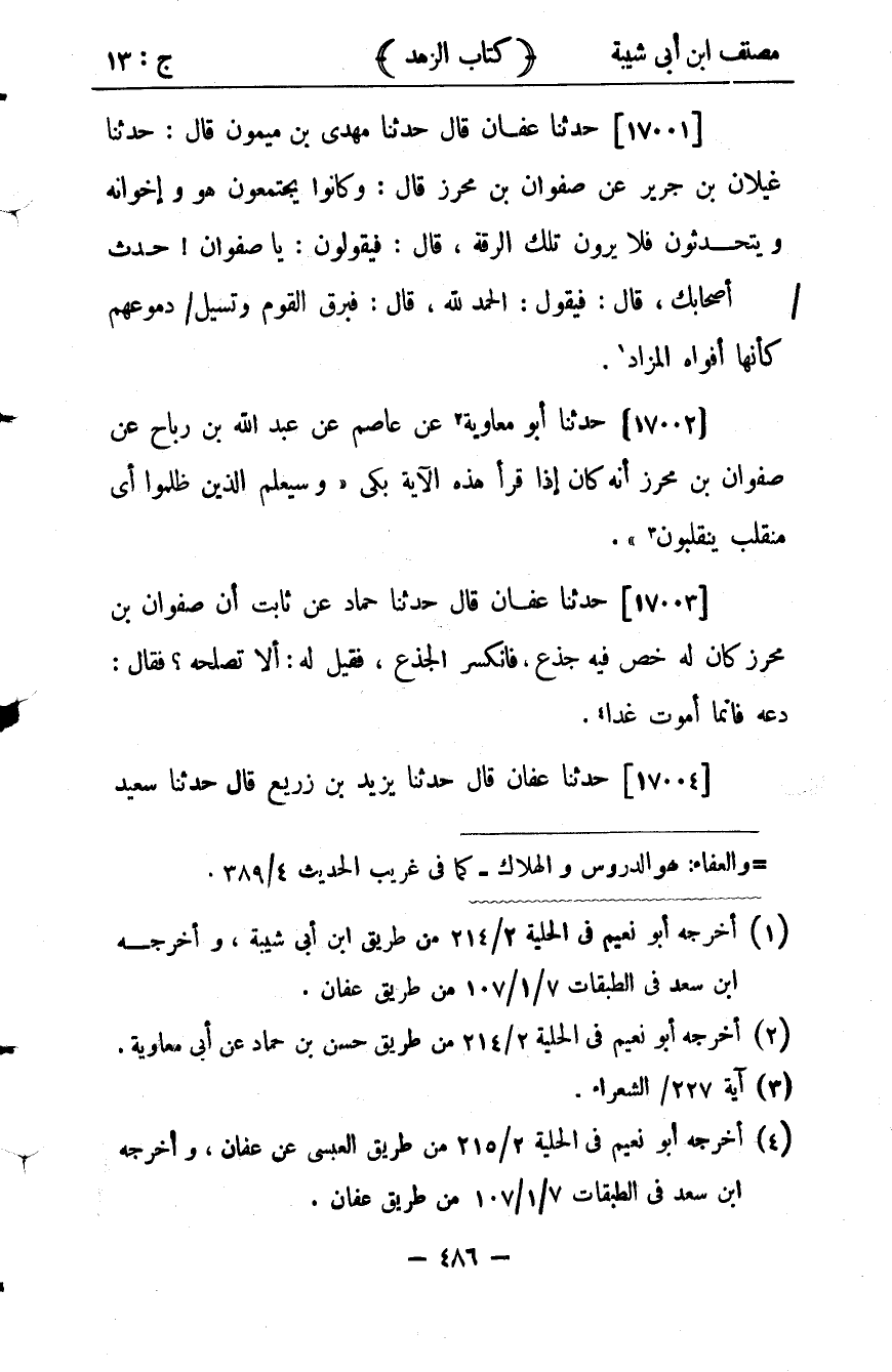 36301- حَدَّثَنَا أَبُو مُعَاوِيَةَ ، عَنْ عَاصِمٍ ، عَنْ عَبْدِ اللهِ بْنِ رَبَاحٍ ، عَنْ صَفْوَانَ بْنِ مُحْرِزٍ ، أَنَّهُ كَانَ إذَا قَرَأَ هَذِهِ الآيَةَ بَكَى , حتى أرى لقد اندق َّ قَضيض زَوْرِة: {وَسَيَعْلَمُ الَّذِينَ ظَلَمُوا أَيَّ مُنْقَلَبٍ يَنْقَلِبُونَ}.
