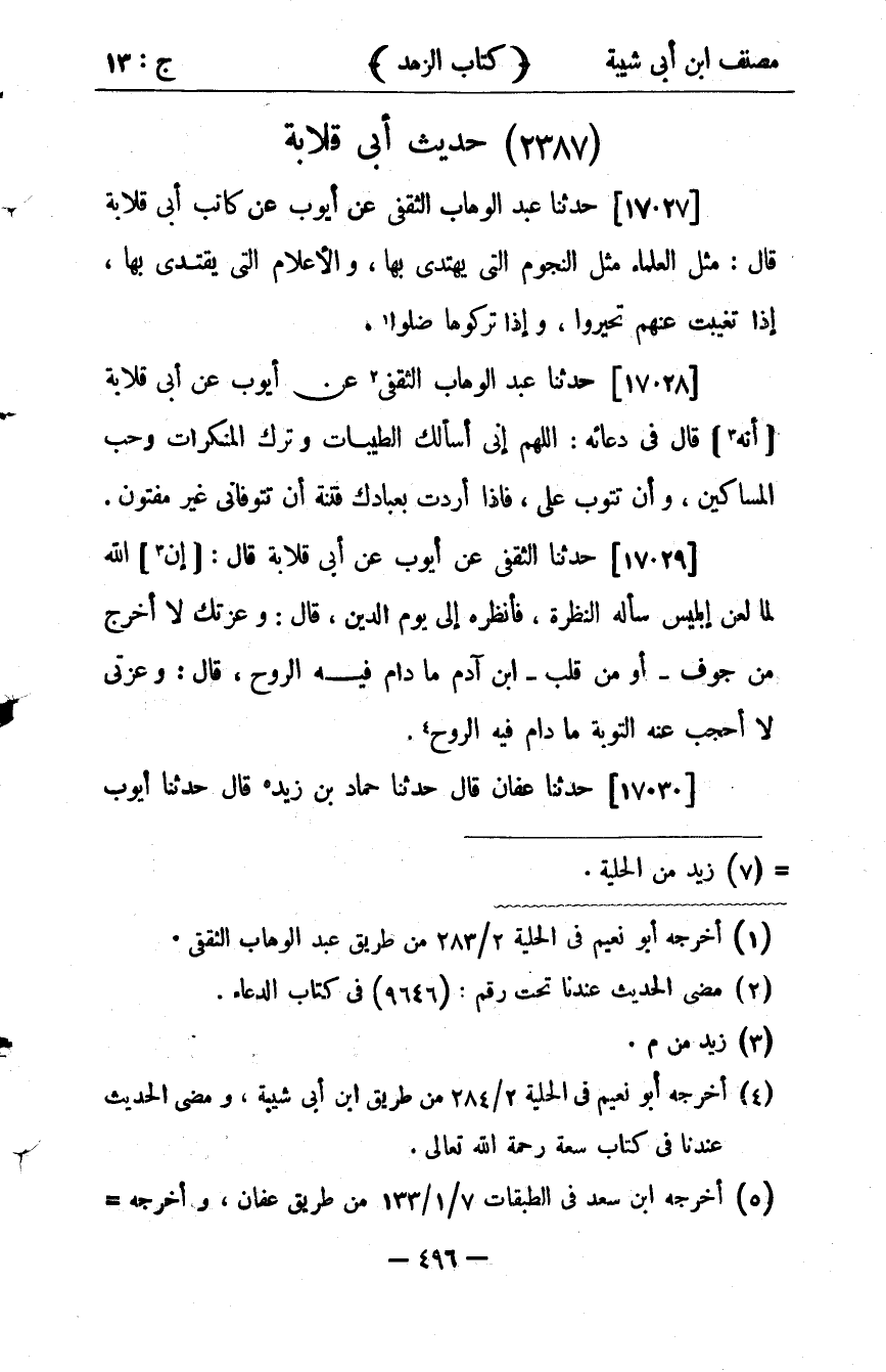 36326- حَدَّثَنَا عَبْدُ الْوَهَّابِ الثَّقَفِيُّ ، عَنْ أَيُّوبَ ، عَنْ كِتَابِ أَبِي قِلاَبَةَ ، قَالَ : مَثَلُ الْعُلَمَاءِ مَثَلُ النُّجُومِ الَّتِي يُهْتَدَى بِهَا ، وَالأَعْلاَمِ الَّتِي يُقْتَدَى بِهَا ، إذَا تَغَيَّبَتْ عَنْهُمْ تَحَيَّرُوا ، وَإِذَا تَرَكُوهَا ضَلُّوا.