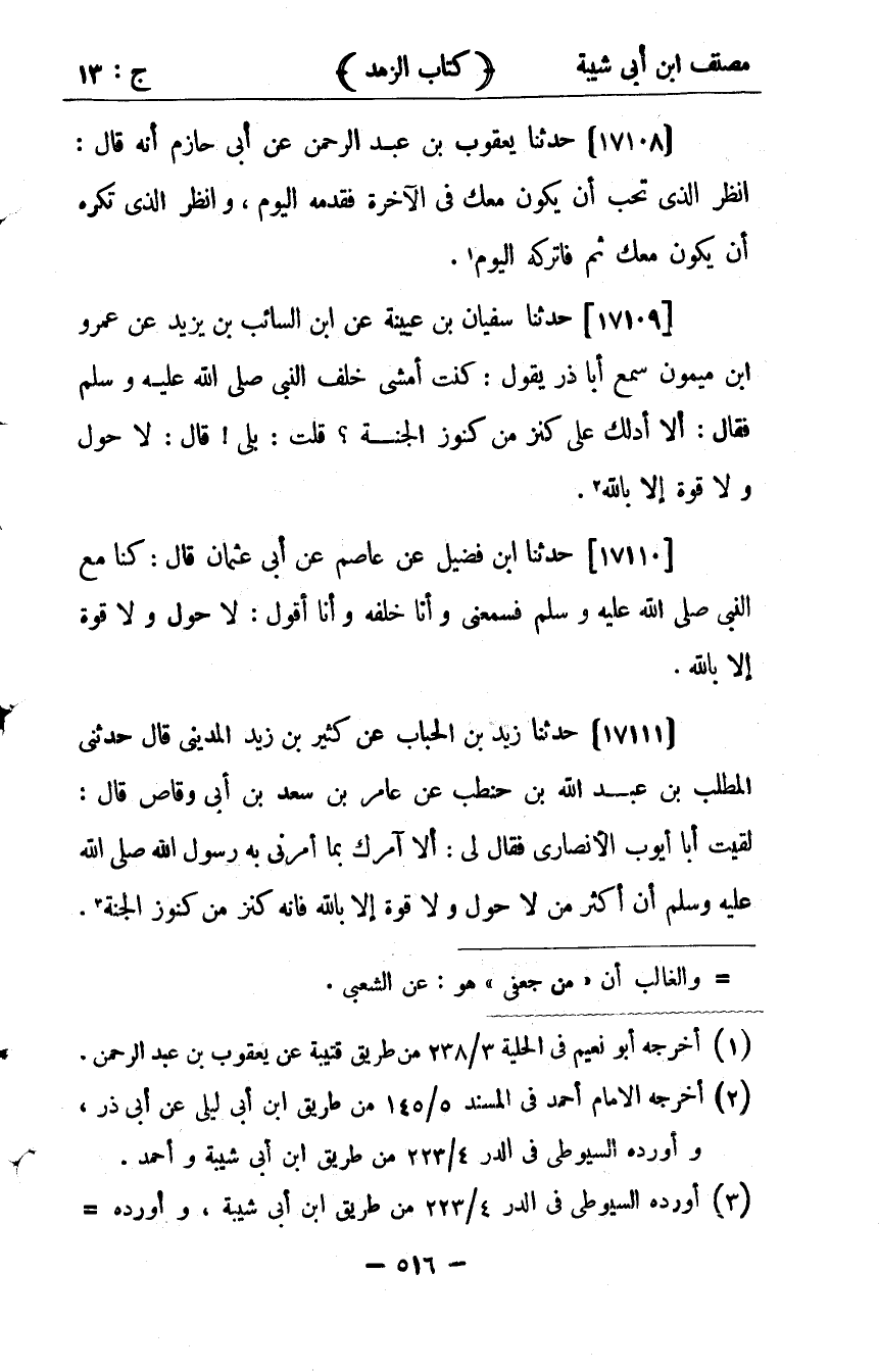 36408- حَدَّثَنَا سُفْيَانُ بْنُ عُيَيْنَةَ ، عَنِ ابْنِ السَّائِبِ بْنِ بَرَكَةٍ ، عَنْ عَمْرِو بْنِ مَيْمُونٍ سَمِعَ أَبَا ذَرٍّ يَقُولُ : كُنْت أَمْشِي خَلْفَ النَّبِيِّ صلى الله عليه وسلم ، فَقَالَ : أَلاَ أَدُلُّك عَلَى كَنْزٍ مِنْ كُنُوزِ الْجَنَّةِ قُلْتُ : بَلَى ، قَالَ : لاَ حَوْلَ وَلاَ قُوَّةَ إِلاَّ بِاللهِ.