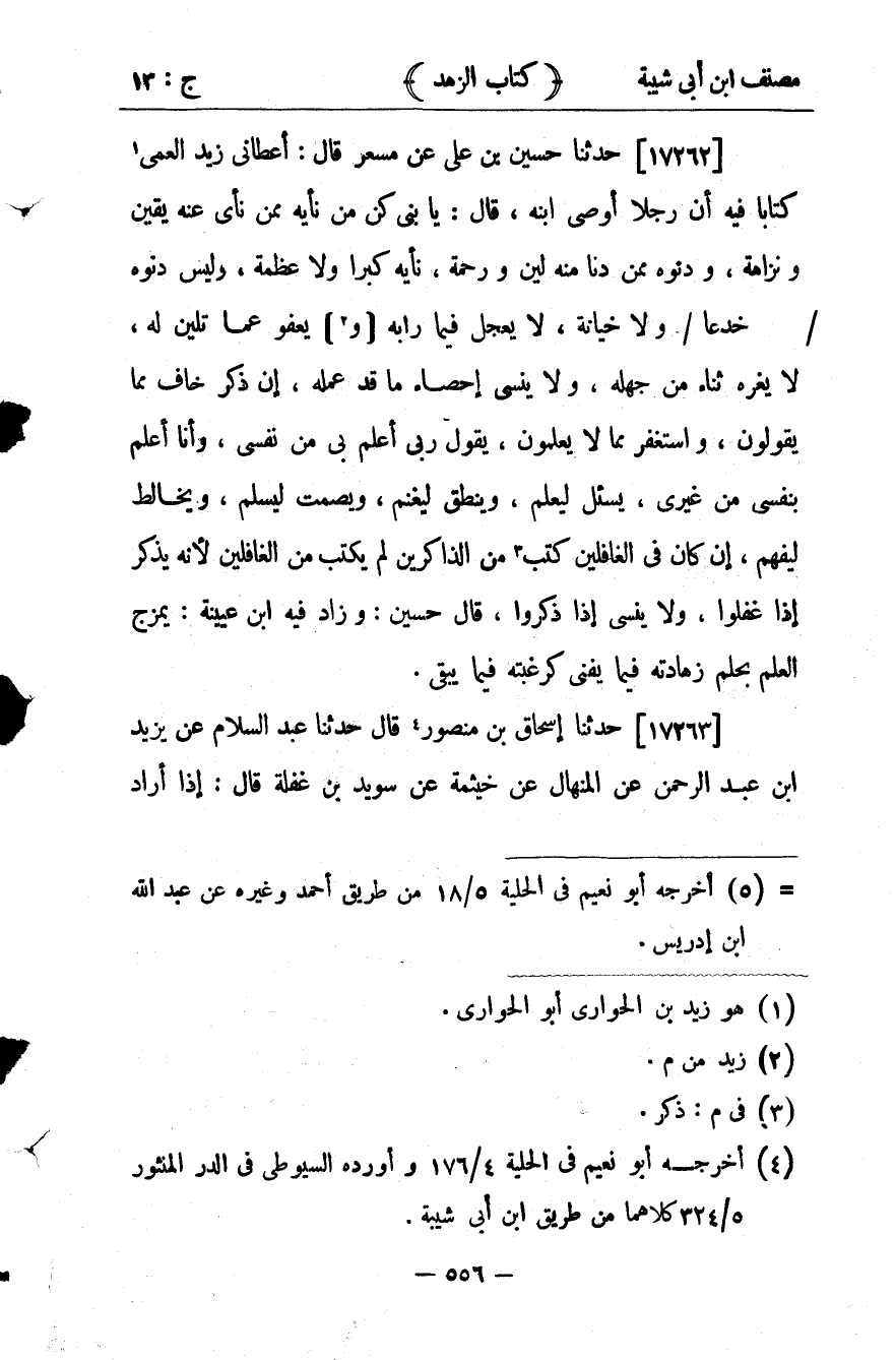 36562- حَدَّثَنَا حُسَيْنُ بْنُ عَلِيٍّ ، عَنْ مِسْعَرٍ ، قَالَ : أَعْطَانِي زَيْدٌ الْعَمِّيُّ كِتَابًا فِيهِ ، أَنَّ رَجُلاً أَوْصَى ابْنَهُ ، قَالَ : يَا بُنَي ، كُنْ مِنْ نَأْيُه مِمَّنْ نَأَى عَنْهُ تَغَنِّيًا وَنَزَاهَةٌ ، وَدُنُوِّهِ مِمَّنْ دَنَا مِنْهُ لِينٌ وَرَحْمَةٌ ، لَيْسَ نَأْيُهُ كِبَرًا ، وَلاَ عَظَمَةً ، وَلَيْسَ دُنُوُّهُ خَدْعًا ، وَلاَ خِيَانَةً ، لاَ يُعَجِّلُ فِيمَا رَابَهُ , وَيَعْفُو عَمَّا تَبَيَّنَ لَهُ ، لاَ يَغُرُّهُ ثَنَاءُ مَنْ جَهِلَهُ ، وَلاَ يَنْسَى إحْصَاءَ مَا قَدْ عَمِلَهُ ، إنْ ذُكِرَ خَافَ مِمَّا يَقُولُونَ ، وَاسْتَغْفَرَ مِمَّا لاَ يَعْلَمُونَ ، يَقُولُ رَبِّي أَعْلَمُ بِي مِنْ نَفْسِي ، وَأَنَا أَعْلَمُ بِنَفْسِي مِنْ غَيْرِي ، يَسْأَلُ لِيَعْلَمَ ، وَيَنْطِقُ لِيَغْنَمَ ، وَيَصْمُتُ لِيَسْلَمَ ، وَيُخَالِطُ لِيَفْهَمَ ، إنْ كَانَ فِي الْغَافِلِينَ كُتِبَ مِنَ الذَّاكِرِينَ وَإِنْ كَانَ فِي الْذَّاكِرينَ ، لَمْ يُكْتَبْ مِنَ الْغَافِلِينَ , لأَنَّهُ يَذْكُرُ إذَا غَفَلُوا ، وَلاَ يَنْسَى إذَا ذَكَرُوا ، قَالَ حُسَيْنٌ : وَزَادَ فِيهِ ابْنُ عُيَيْنَةَ : يَمْزُجُ الْعِلْمَ بِحِلْمِ زَهَادَتِهِ فِيمَا يَفْنَى كَرَغْبَتِهِ فِيمَا يَبْقَى.