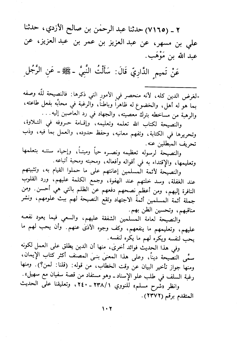 7165 - حَدَّثَنَا عَبْدُ الرَّحْمَنِ بْنُ صَالِحٍ الْأَزْدِيُّ، حَدَّثَنَا عَلِيُّ بْنُ مُسْهِرٍ، عَنْ عَبْدِ الْعَزِيزِ بْنِ عُمَرَ بْنِ عَبْدِ الْعَزِيزِ، عَنْ عَبْدِ اللَّهِ بْنِ مَوْهَبٍ، عَنْ تَمِيمٍ الدَّارِيِّ قَالَ: سَأَلْتُ النَّبِيَّ صَلَّى اللهُ عَلَيْهِ وَسَلَّمَ، عَنِ الرَّجُلِ -[103]- يُسْلِمُ عَلَى يَدَيِ الرَّجُلِ، قَالَ: «§هُوَ أَوْلَى النَّاسِ بِمَحْيَاهُ وَمَمَاتِهِ» Kإسناده صحيح